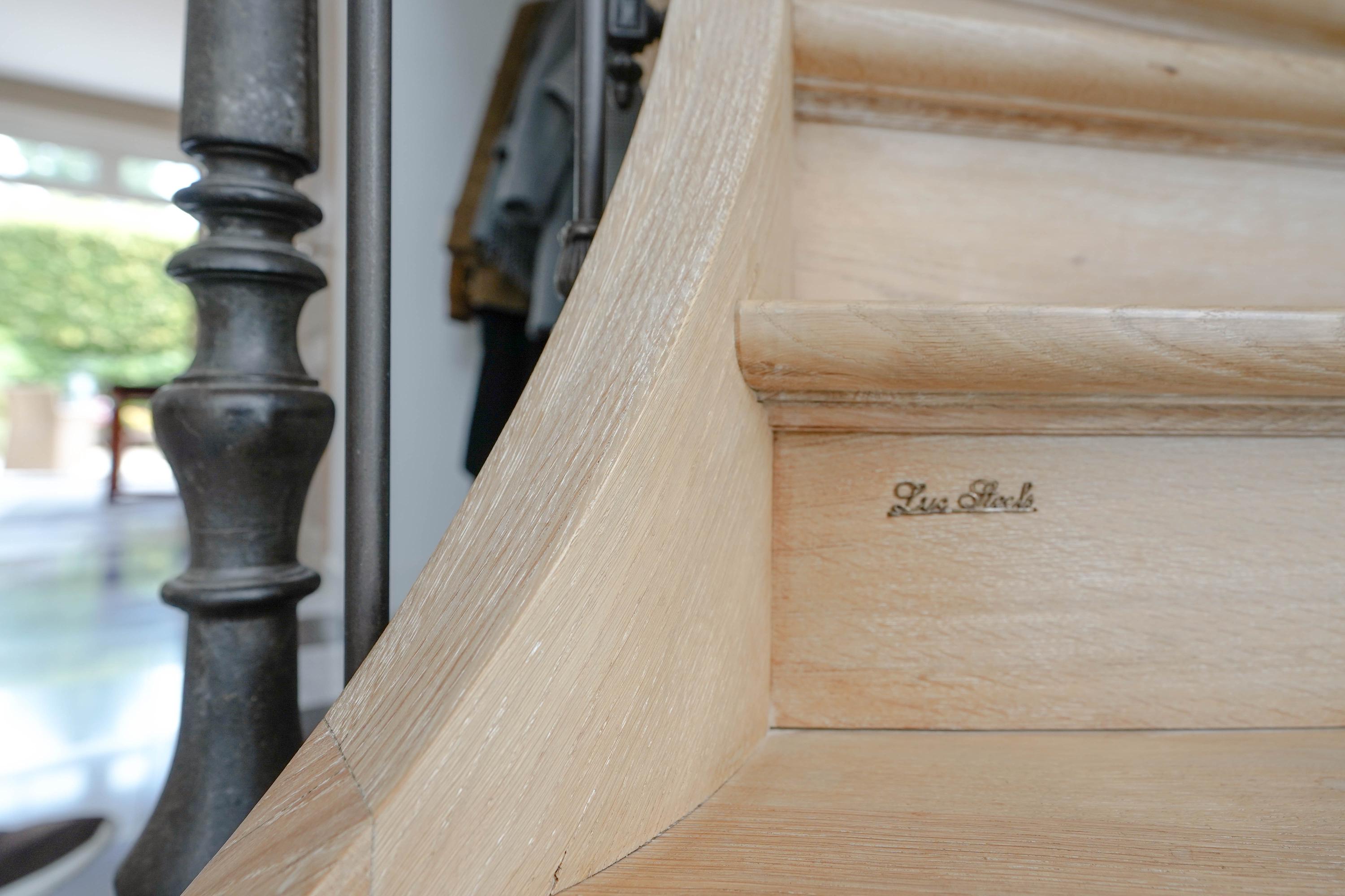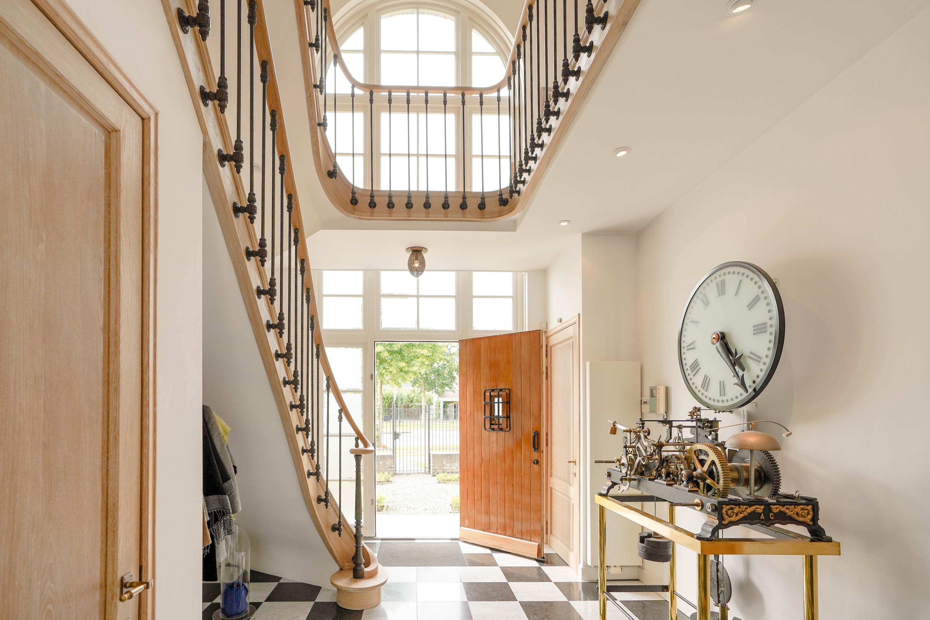 Inside, the entrance hall features a beautifully sculpted oak staircase. The solid oak handrail runs in a single, uninterrupted piece all the way to the top floor, supported by 87 patinated cast iron balusters—a masterpiece by renowned Belgian staircase maker Luc Steels, who also crafted all the panel doors and frames throughout the home. The hall includes a guest toilet and the meter cupboard. A skylight above the stairwell, combined with the large glass facade, brings natural light to all floors.