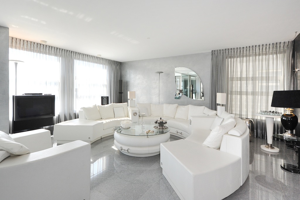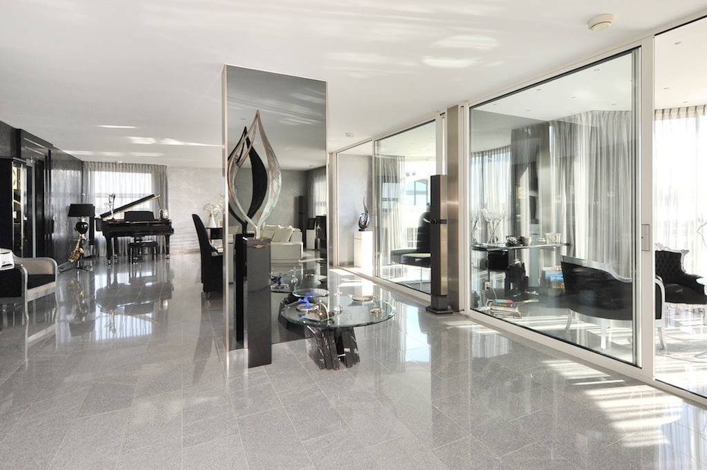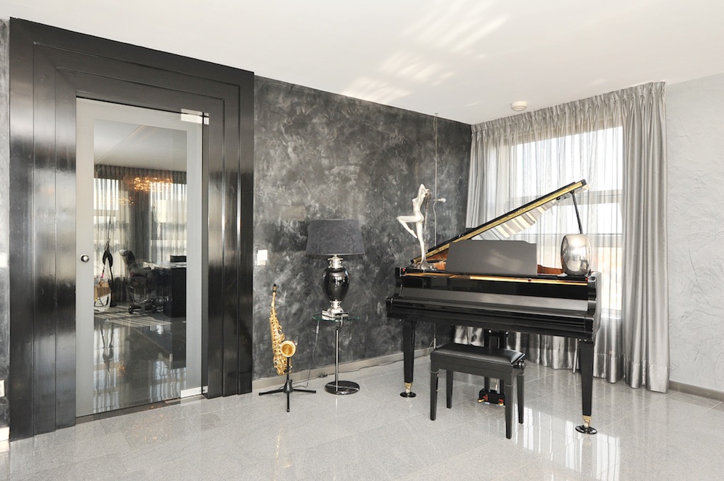 10e verdieping: eigen entree, ruime hal met garderobe, twee separate toiletten, royale slaapkamer (voormalig twee slaapkamers) met toegang naar eigen badkamer voorzien van ligbad, douche en toilet, dichte keuken met hoek opgestelde keukeninrichting en diverse inbouwapparatuur, zeer ruime living met grote raampartijen en twee aangrenzende en halfronde serres, de living is voorzien van een fraaie Chinees travertinvloer, middels een aangrenzende gang heeft u toegang naar een aparte kleedruimte, een tweede badkamer met ligbad, aparte douche en wastafel, een bergruimte met opstelplaats c.v.-combiketel en aansluiting wasmachine en droger, een aparte sauna en een tweede ruime slaapkamer.