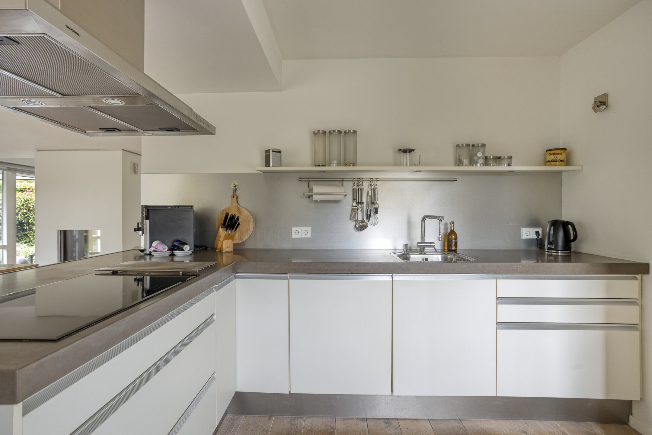 Aan de voorzijde van de woning ligt de luxe keuken. Deze is voorzien van een Belgisch zoetstenen werkblad en recent vervangen topapparatuur van Bosch, AEG en Gaggenau, zoals een vaatwasser, koel-vriescombinatie, stoomoven met bordenwarmer, 4pits inductiekookplaat en afzuigkap. Een genot voor iedere kookliefhebber! De tuingerichte woonkamer ligt aan de achterzijde van de woning en is door de grote glazen pui heerlijk licht. Hier heeft u ruimte voor een fijne zithoek met breed uitzicht op de prachtig aangelegde tuin aan het water en het natuurpark Egmonderhout.