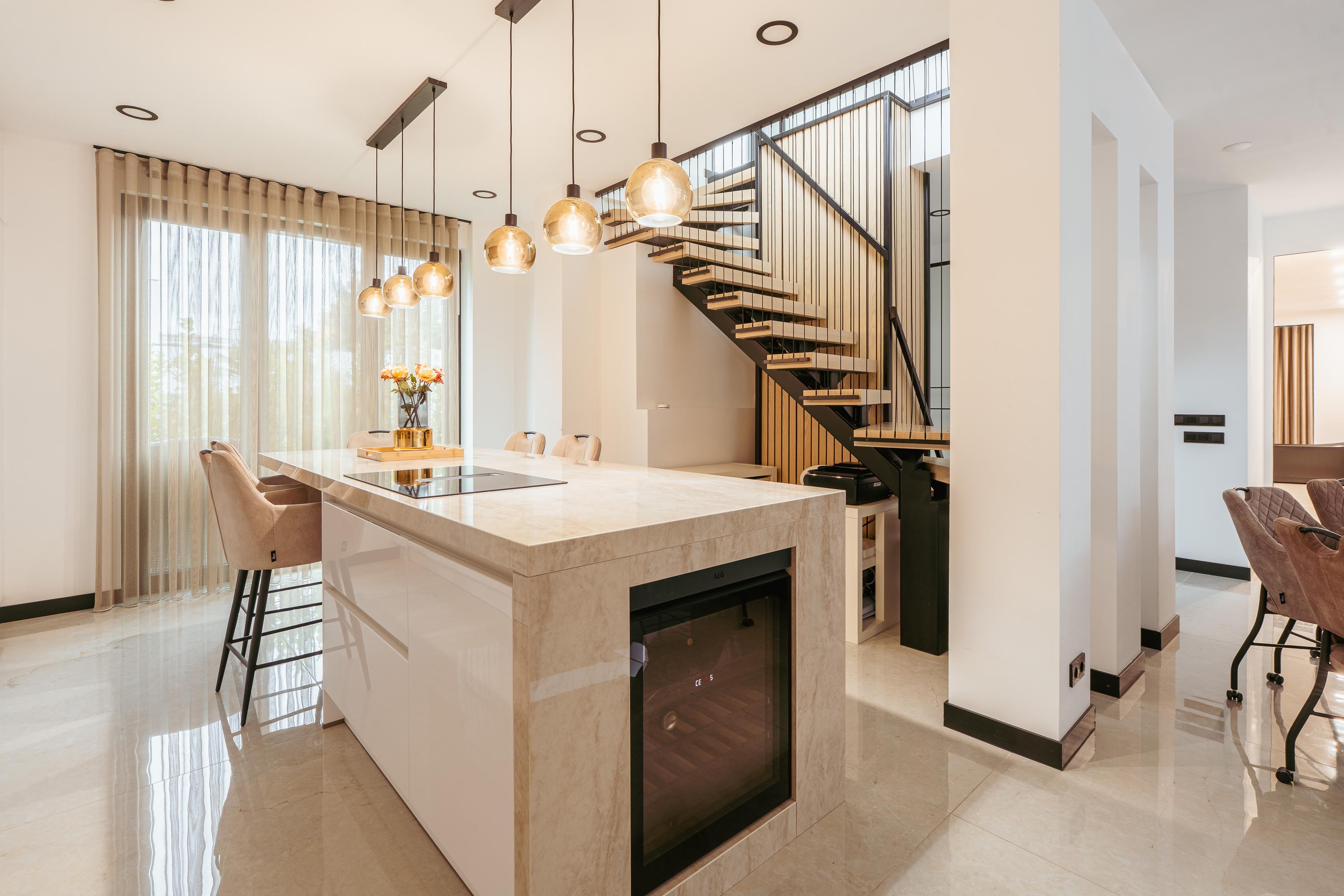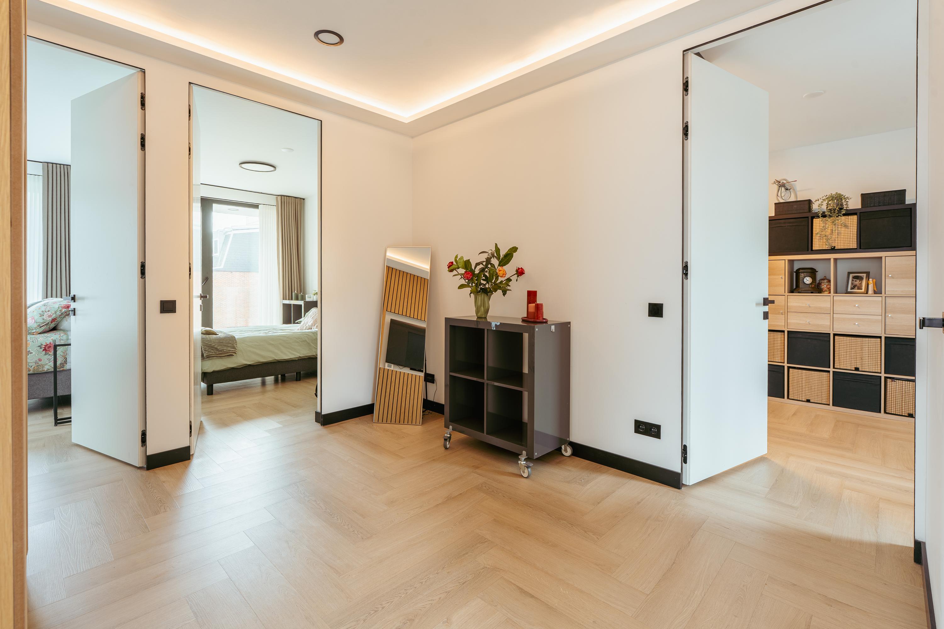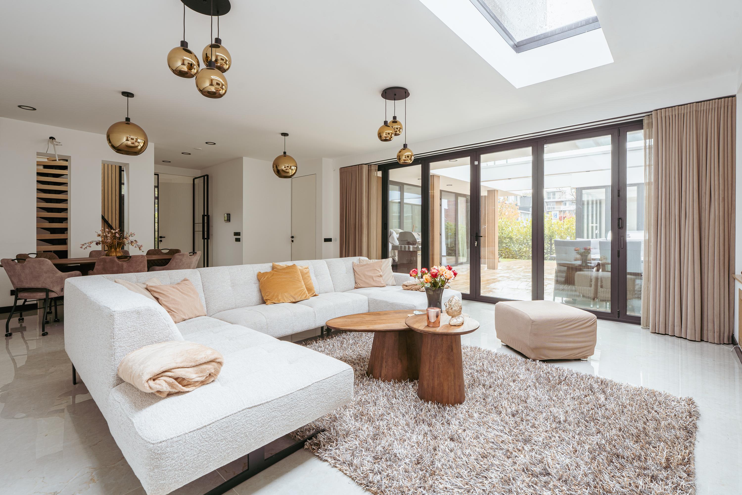 Middels de verzorgde voortuin bereikt u de entree van de woning. De ruime hal vormt een prettige binnenkomst. Vanuit de hal betreedt u de royale woonkamer, die wordt gekenmerkt door een overvloed aan daglicht. De woonkamer staat middels grote raampartijen en glazen deuren in directe verbinding met het terras in de tuin, waardoor binnen en buiten op natuurlijke wijze in elkaar overlopen. Aangrenzend bevindt zich de luxe woonkeuken, uitgevoerd met een royaal kookeiland dat tevens fungeert als gezellige bar om aan te zitten. De keuken is van alle gemakken voorzien en beschikt over een oven en combi-oven, inductiekookplaat met interne afzuiging, klimaatkast, Quooker, vaatwasser, koelkast en vriezer. Er is volop ruimte voor een grote eettafel. Tevens is er achter de keuken een ruime bijkeuken en berging met genoeg ruimte voor opslag van apparatuur en etenswaren.