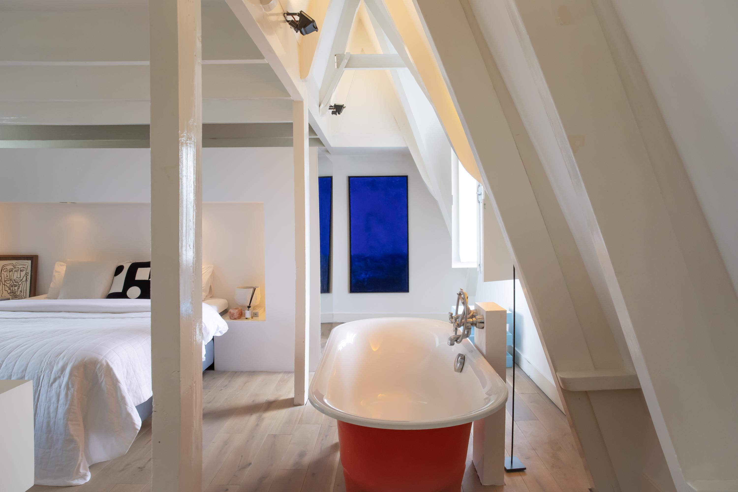 Via de trap bereikt u direct de royale, open woonkamer op de derde verdieping. De ruimte is extra breed en beschikt over maar liefst vier ramen – het dubbele van wat gebruikelijk is in Amsterdam – waardoor er een overvloed aan daglicht binnenvalt. De moderne open keuken is uitgerust met een imposant kookeiland met eetgedeelte en hoogwaardige inbouwapparatuur van onder andere Boretti, waaronder een oven, koel-vriescombinatie, 8-pits gasfornuis met afzuigkap, vaatwasser en wijnklimaatkast. Bovendien is er volop bergruimte aanwezig. Vanuit de keuken heeft u toegang tot het brede, gezellige balkon (circa 4 m²), gelegen op het oosten. Daarnaast bevindt zich op deze verdieping een separaat toilet met fonteintje en een handige berging. Een elegante trap met deels transparante brick-wall leidt u naar de vierde verdieping.