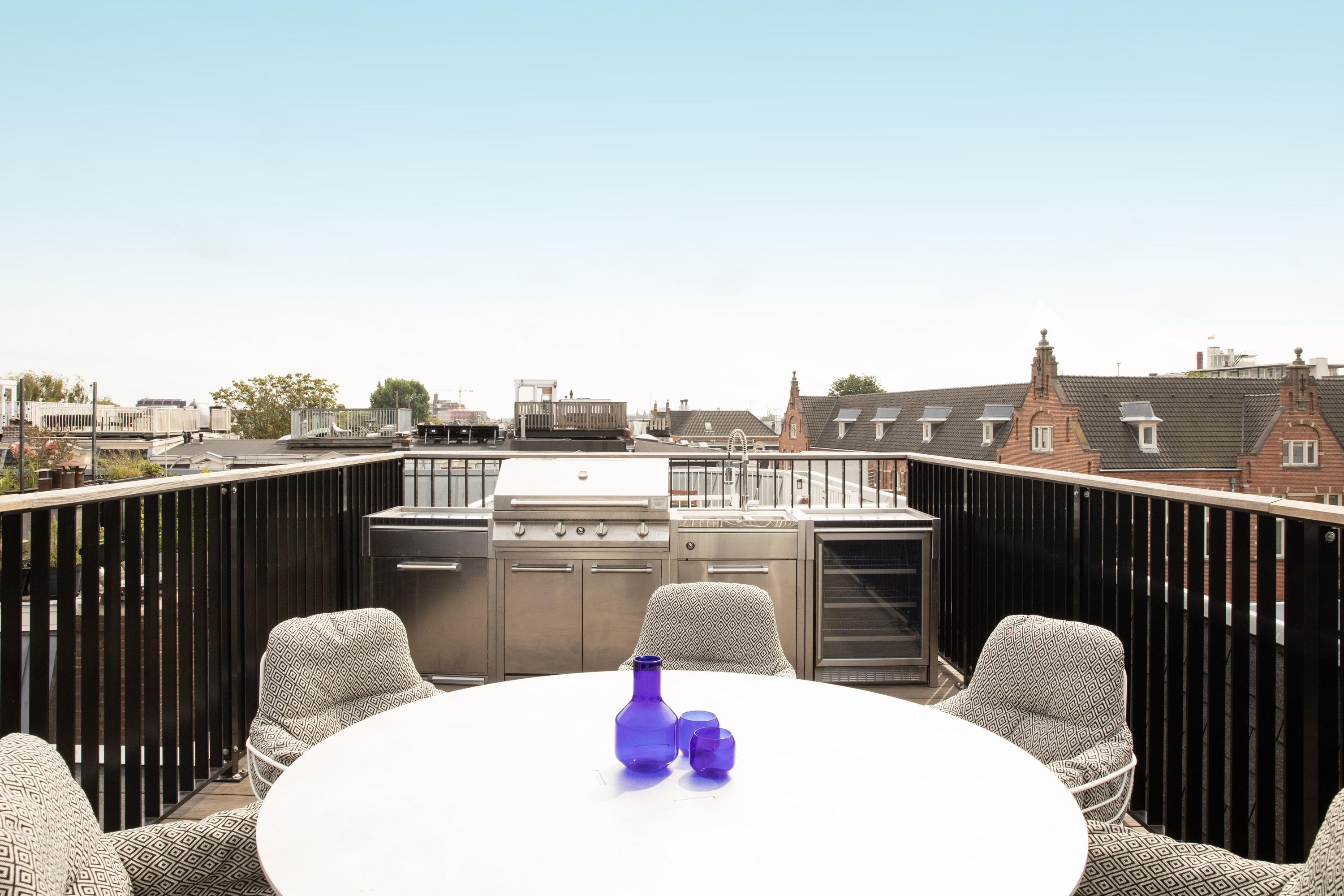 Het absolute hoogtepunt van deze woning is het riante dakterras, dat een prachtig uitzicht over de stad biedt. Hier kunt u tot in de late uurtjes genieten van de zon. Het terras is bovendien uitgerust met een luxe buitenkeuken met grill, spoelbak, ijsmachine en wijnklimaatkast – een perfecte plek voor ontspannen avonden en sfeervolle diners.