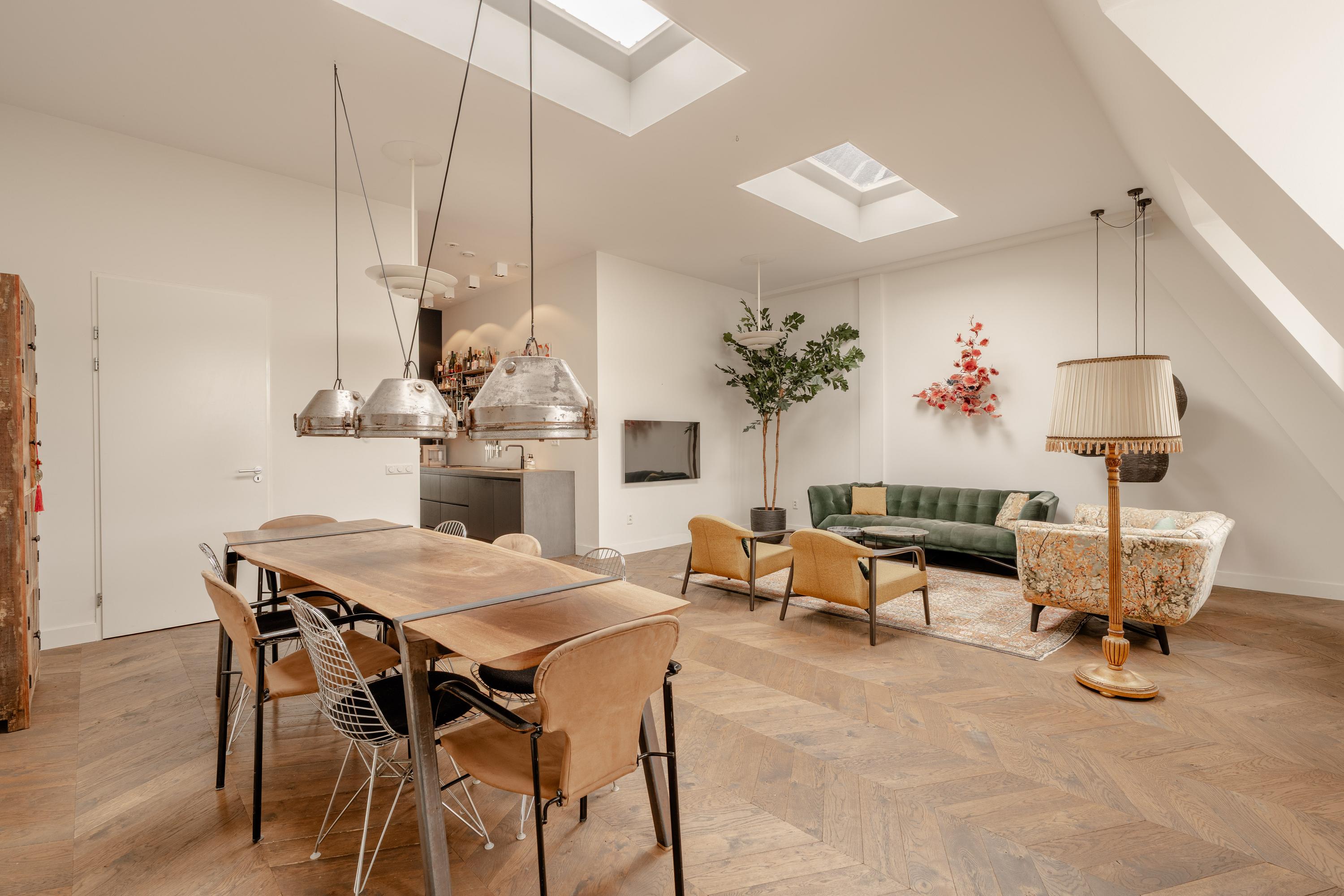 De derde verdieping vormt de woonverdieping van de woning. Hier bevindt zich de royale en lichte woonkamer met open keuken aan de voorzijde. Dankzij de indrukwekkende plafondhoogte en meerdere dakramen valt er veel daglicht naar binnen, wat de ruimte een bijzonder open en ruimtelijk karakter geeft. De houten vloer en de strakke afwerking zorgen voor een warme en moderne uitstraling.
