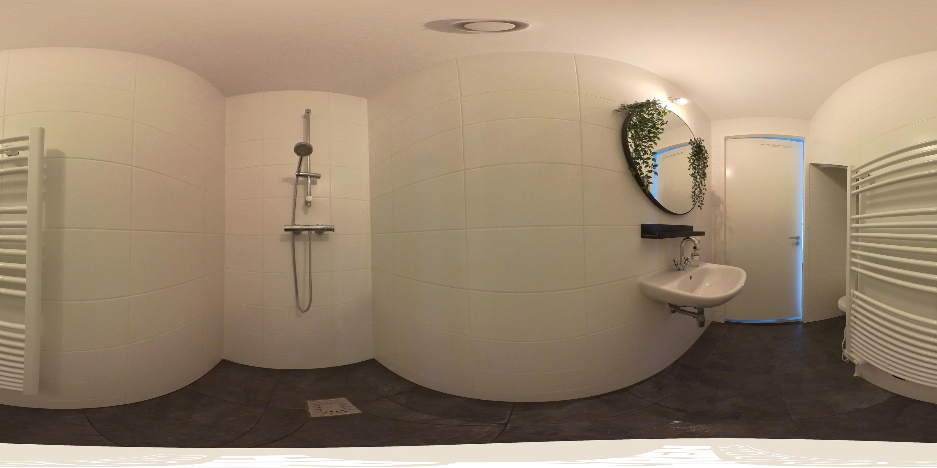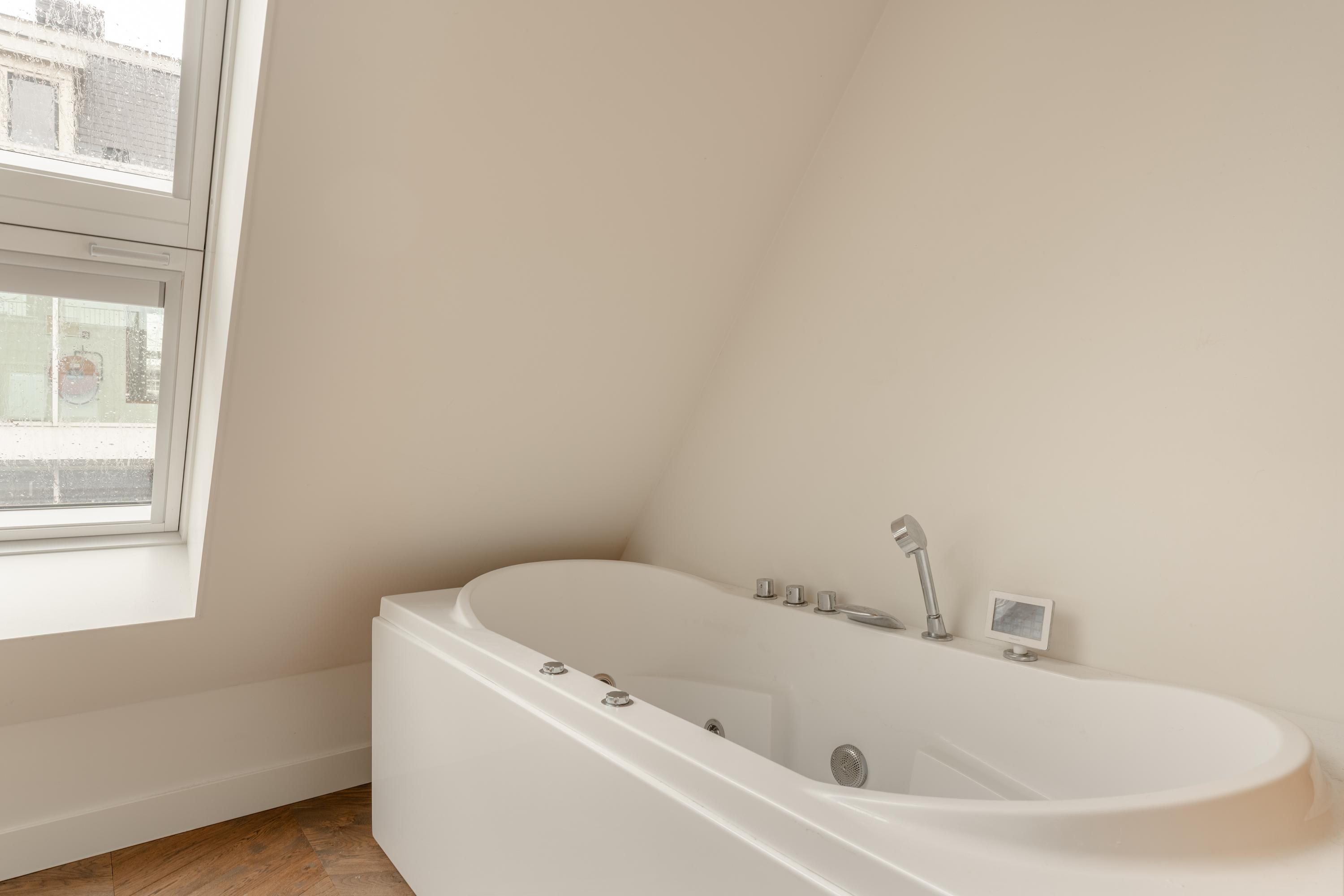 De slaapkamer aan de achterzijde is bijzonder royaal en beschikt over grote raampartijen met Frans balkon, waardoor er veel natuurlijk licht naar binnen valt. De kamer biedt ruim plaats aan een groot bed en kastruimte. Aangrenzend bevindt zich de en-suite badkamer, voorzien van een douche, wastafel en toilet.