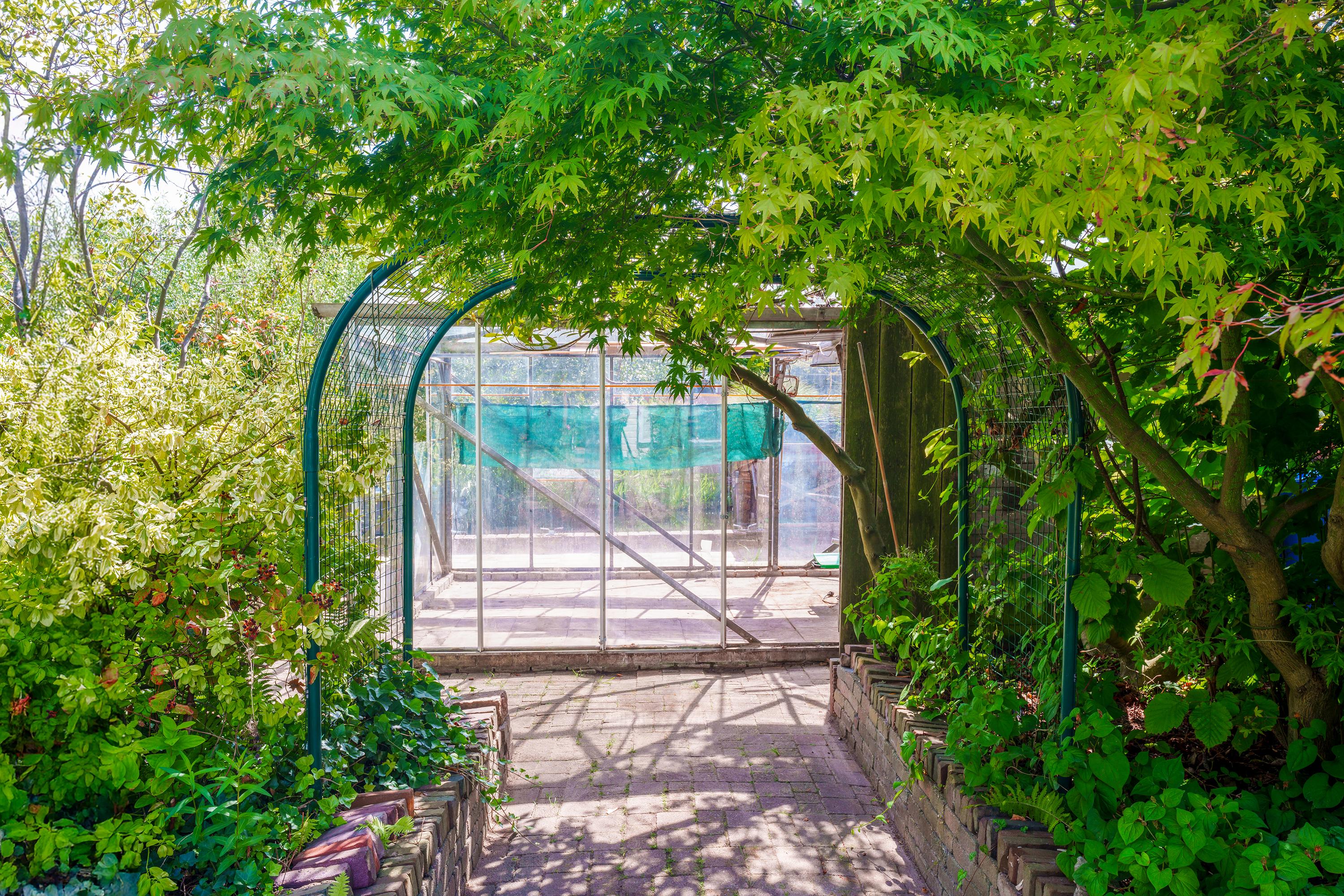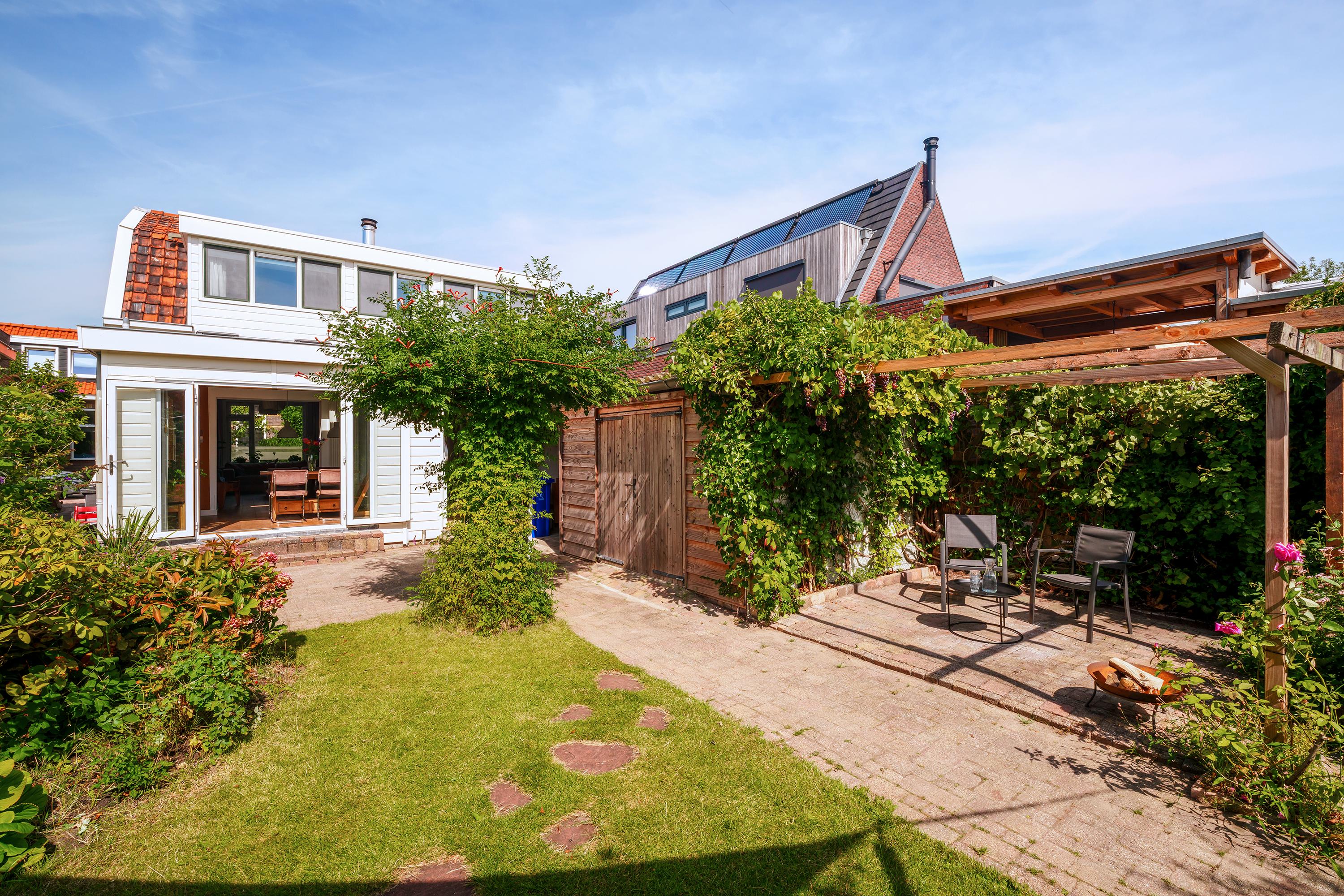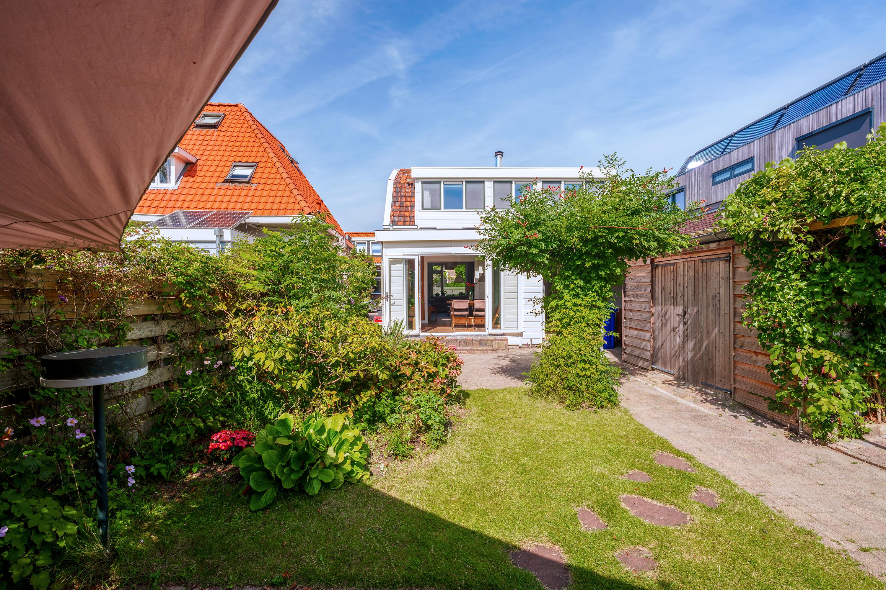 De tuin is bereikbaar via het zijpad. Hier tref je een overkapping, ruime schuur, (groenten-)kas en boothuis. De volwassen beplanting geeft rust, schaduw, geur, kleur en beleving. Op het zuiden en met veel privacy!