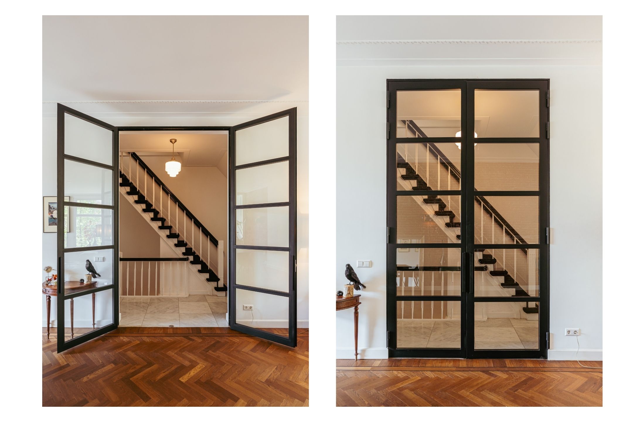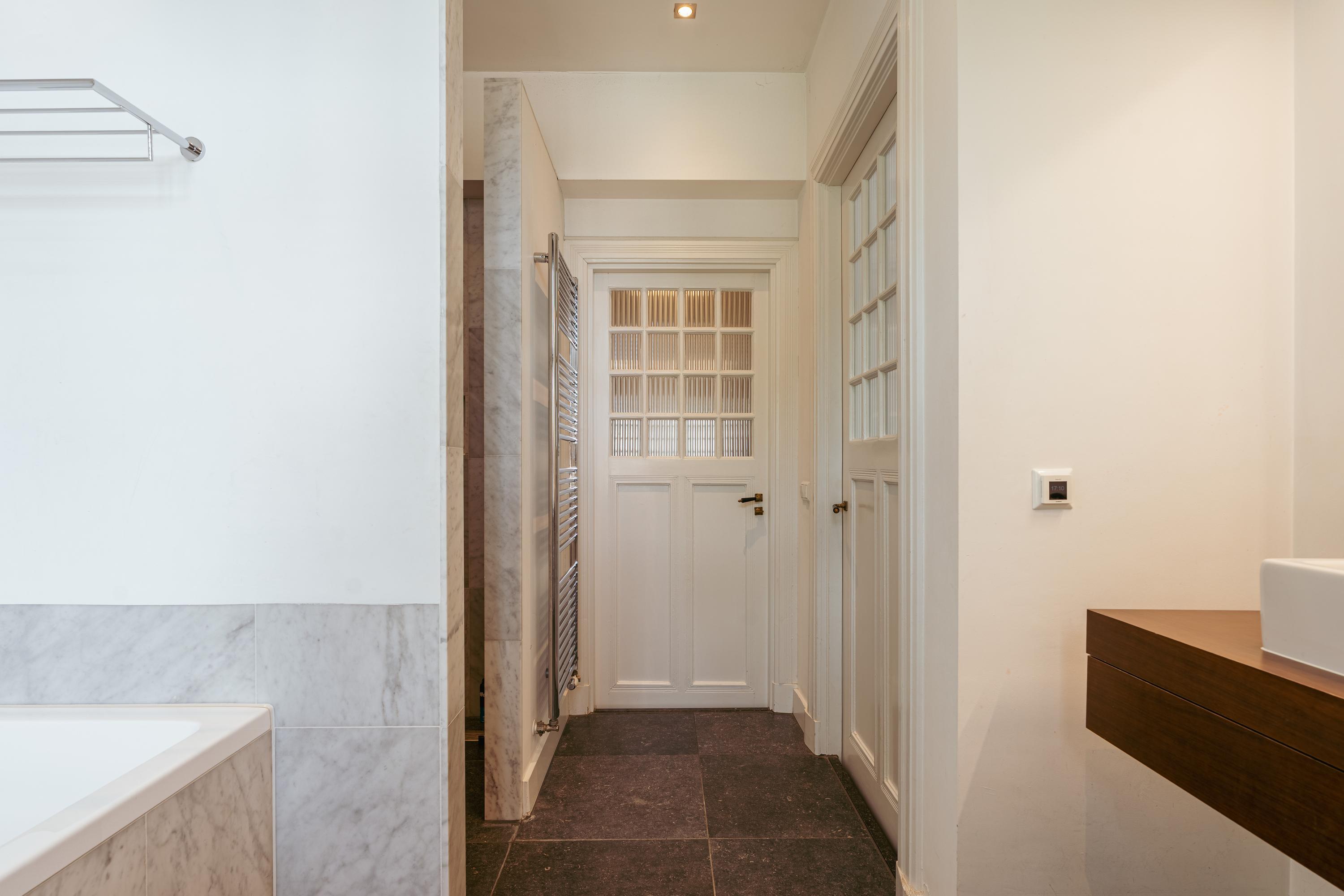 De woning beschikt over een eigen entree aan de straatzijde. Bij binnenkomst zijn de vloer en deels ook de wanden afgewerkt met stijlvol marmer. Middels het tochtportaal bereikt u de centrale hal, eveneens voorzien van een marmeren vloer. Fraaie stalenlook deuren met glas geven hier toegang tot de woonkamer en versterken het elegante karakter van deze woonlaag.