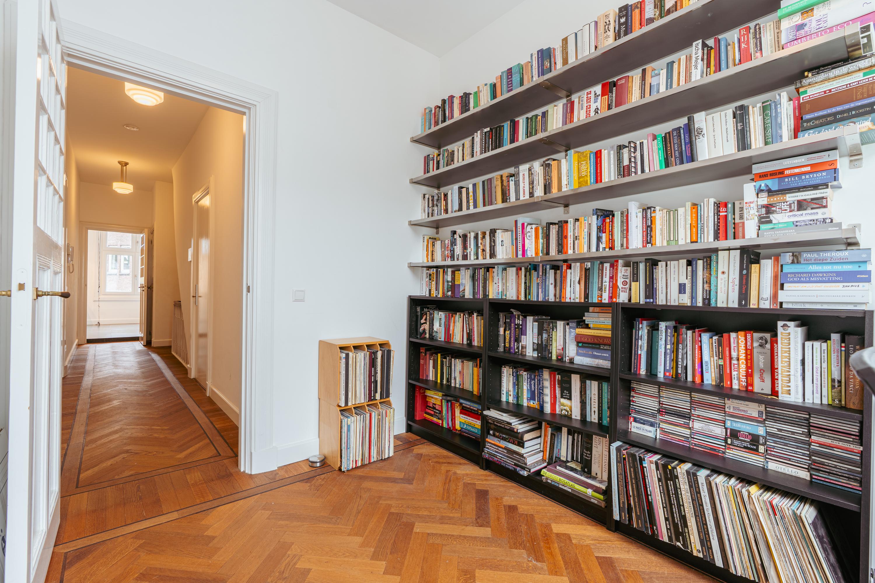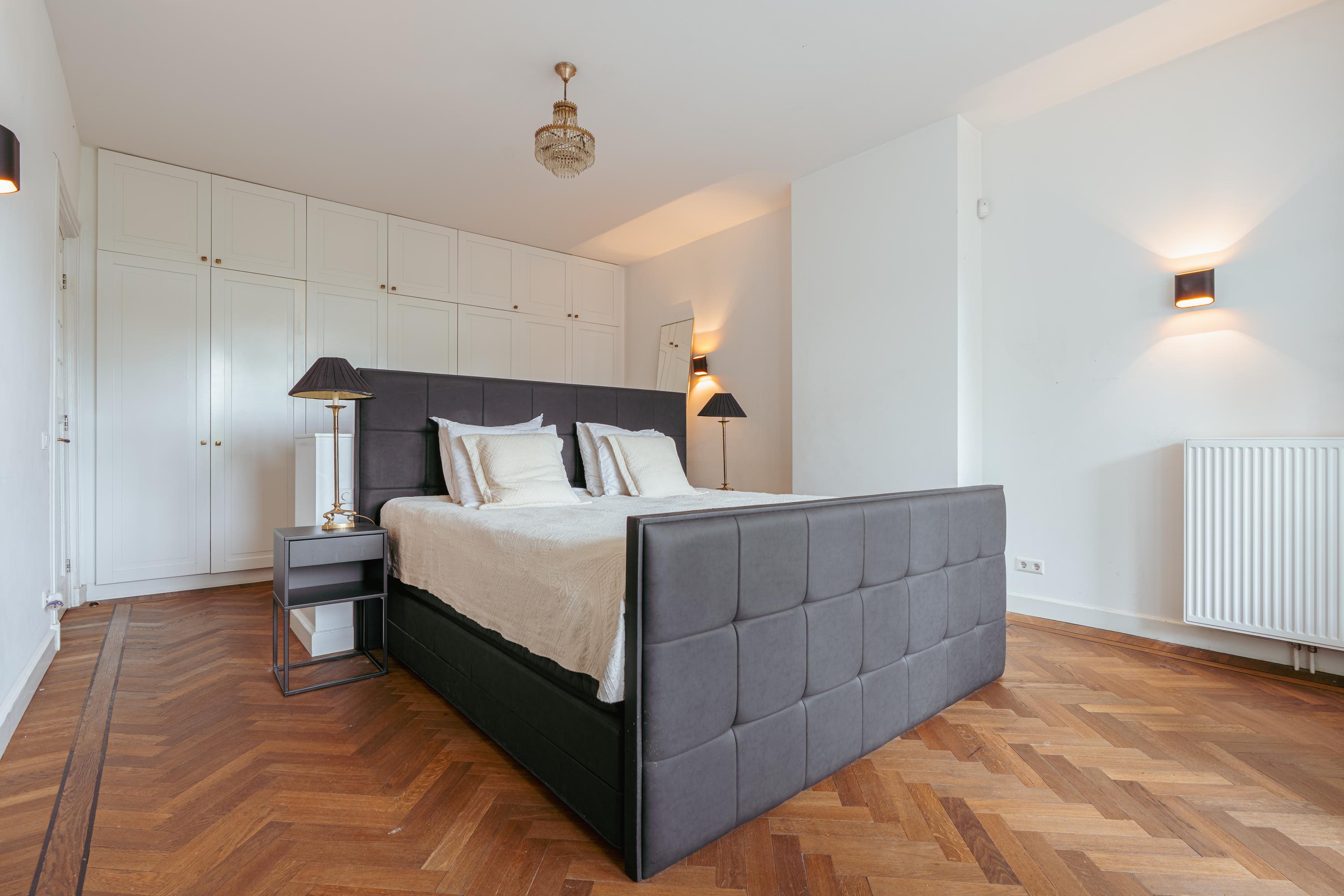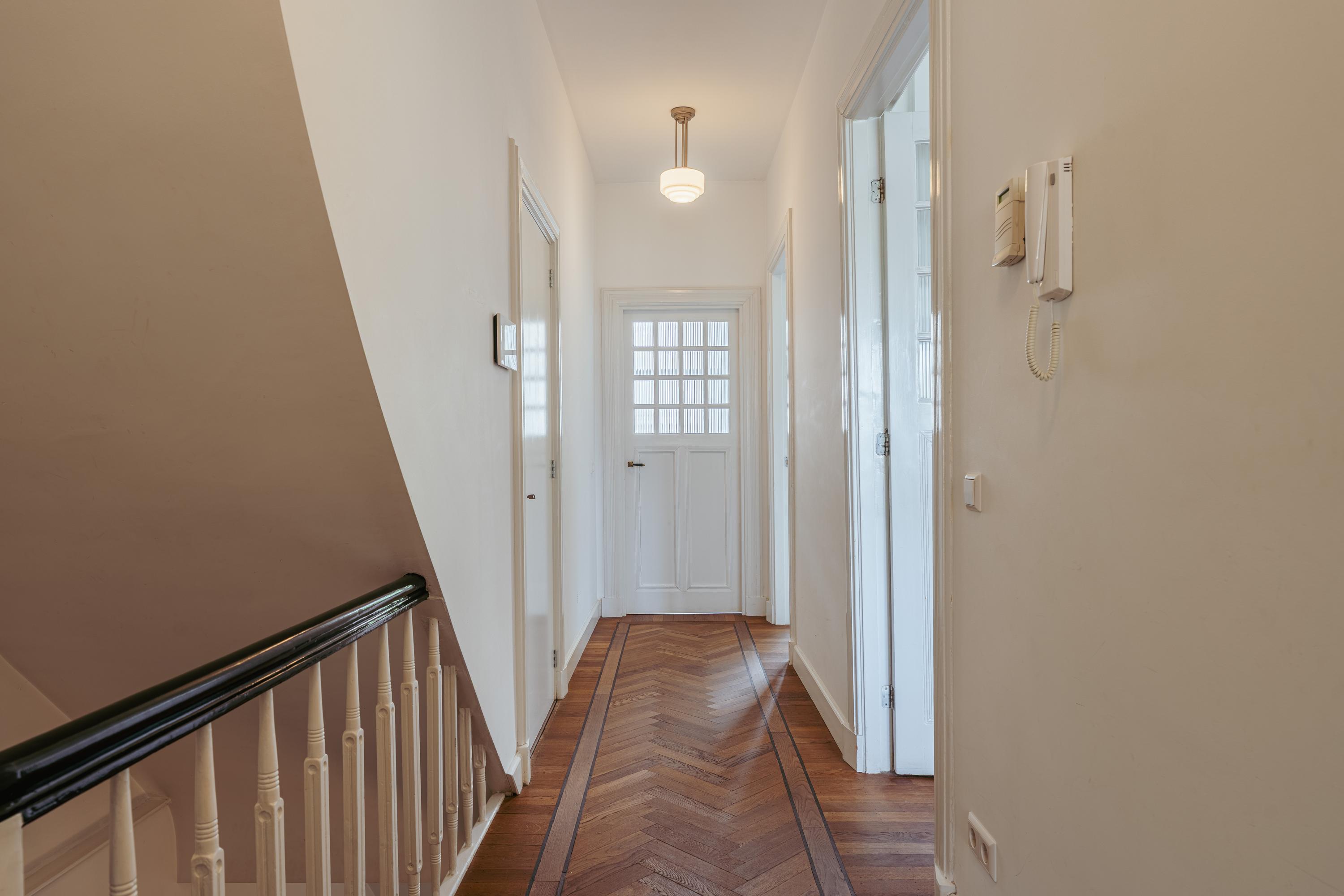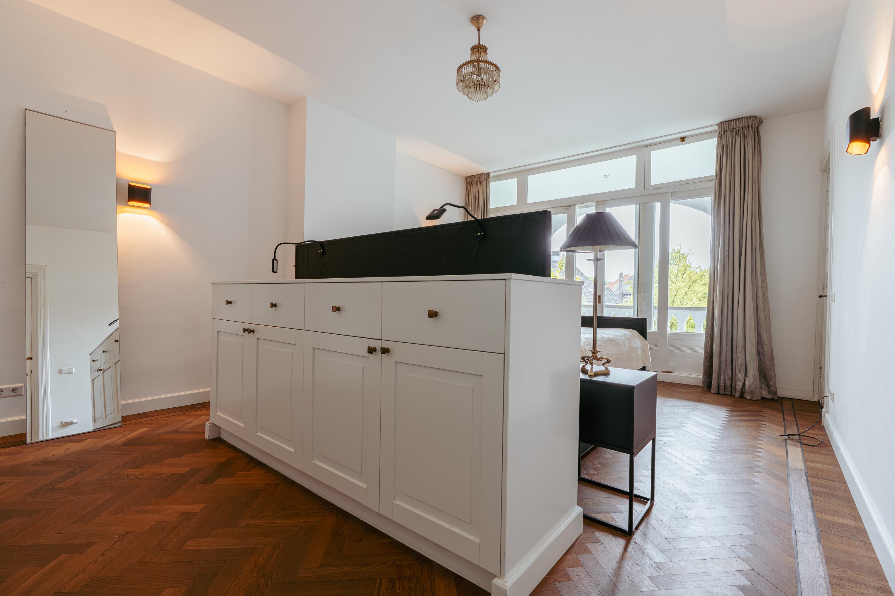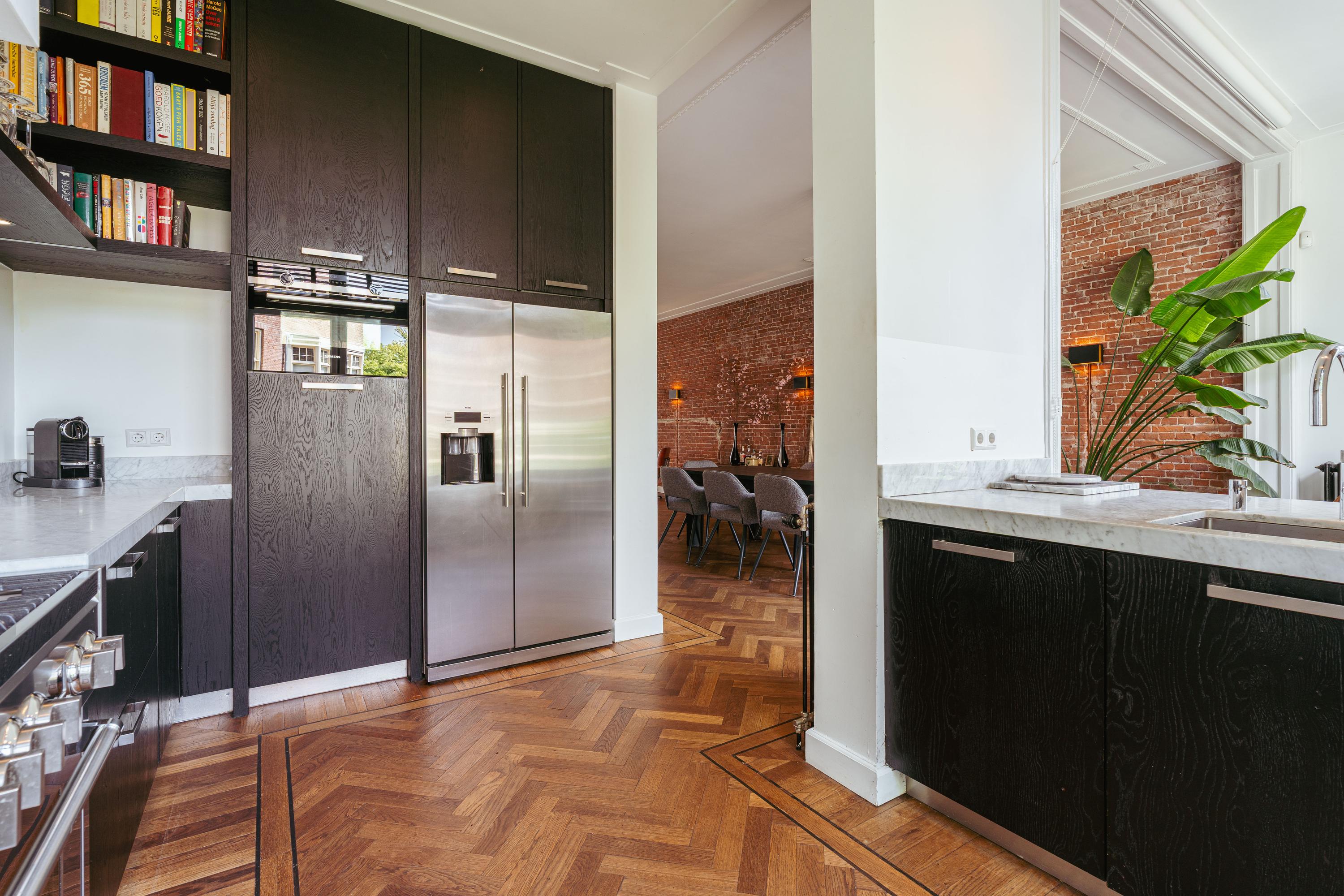 De riante woonkamer aan de voorzijde heeft een plafondhoogte van maar liefst 3,32 meter en beschikt over een sfeervolle open haard. De parketvloer, gecombineerd met een karakteristieke deels bakstenen muur, zorgt voor een warme, stijlvolle uitstraling. Aan de achterzijde bevindt zich de eetkamer, grenzend aan een zonnig balkon met openslaande deuren. Perfect om tot rust te komen na een werkdag. De halfopen keuken, grenzend aan de eetkamer is van alle gemakken voorzien. Naast een spoelbak, vaatwasser, dubbele oven, een 6-pits gasfornuis en een marmeren werkblad beschikt de keuken over een gezellig spoeleiland met bar – een ideale plek voor een glas wijn of een goed gesprek tijdens het koken. Grote raampartijen zorgen voor veel daglicht en een prettige doorkijk op het omliggende groen.