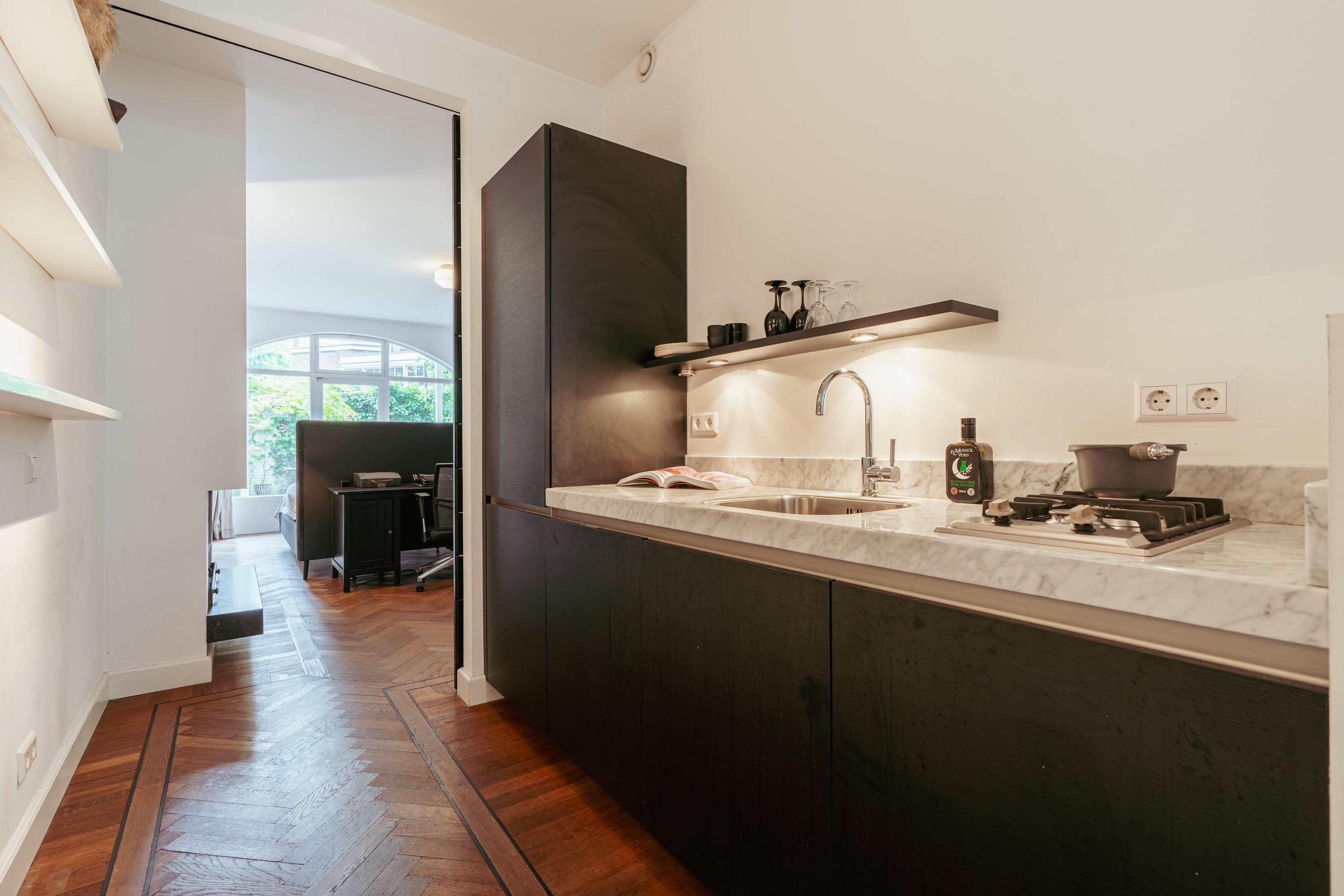 Aan de voorzijde bevindt zich een tweede woonkamer met eigen entree, waardoor deze woonlaag uitermate geschikt is voor gasten, een au pair of dubbele bewoning. De tweede keuken is voorzien van een spoelbak, een 2-pits gasfornuis, een koel-vriescombinatie en een marmeren werkblad. Verder vindt u op deze verdieping een badkamer met douche, wastafel en toilet, evenals een aparte berging met wasruimte en aansluitingen voor wasmachine en droger.