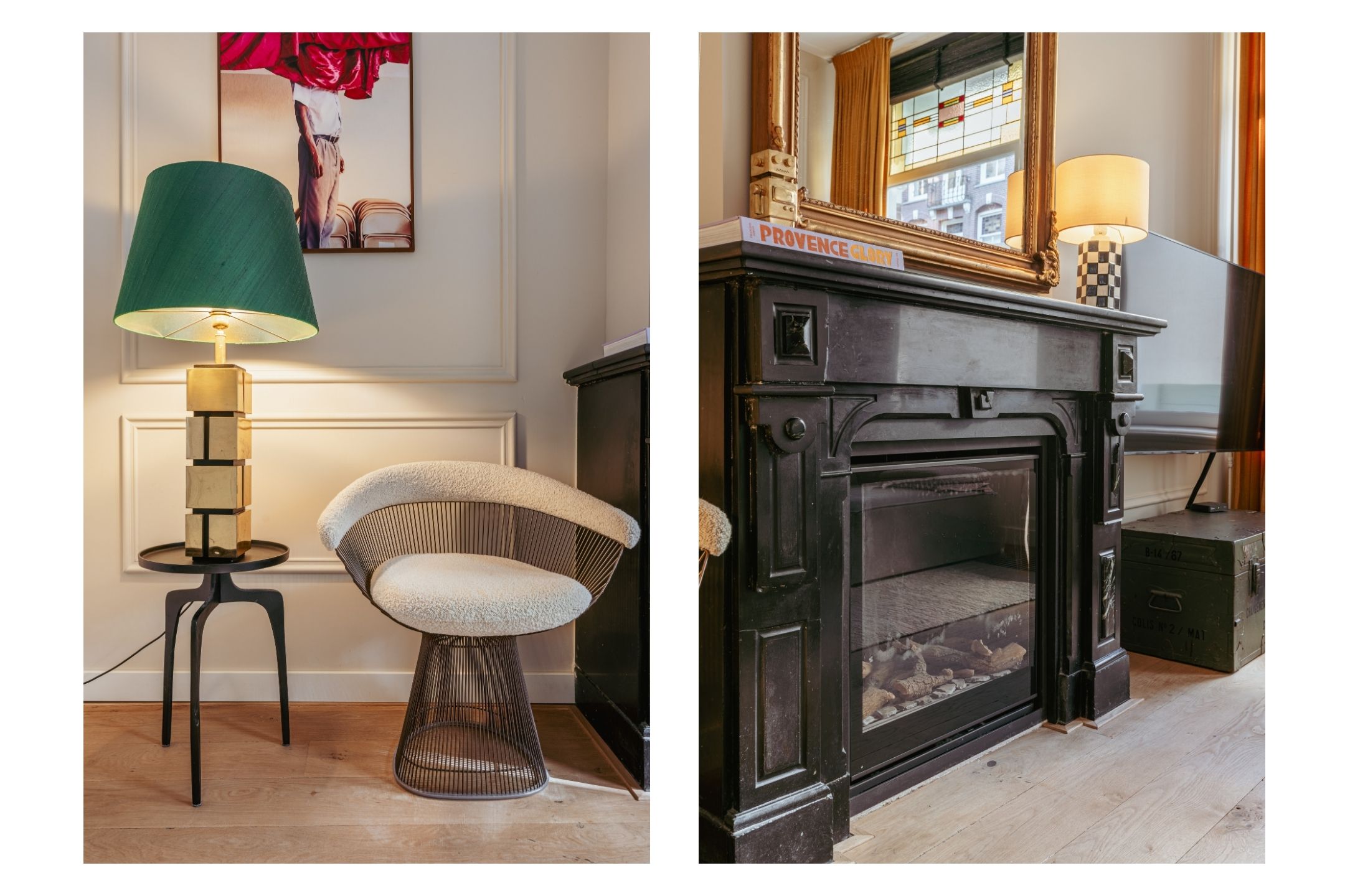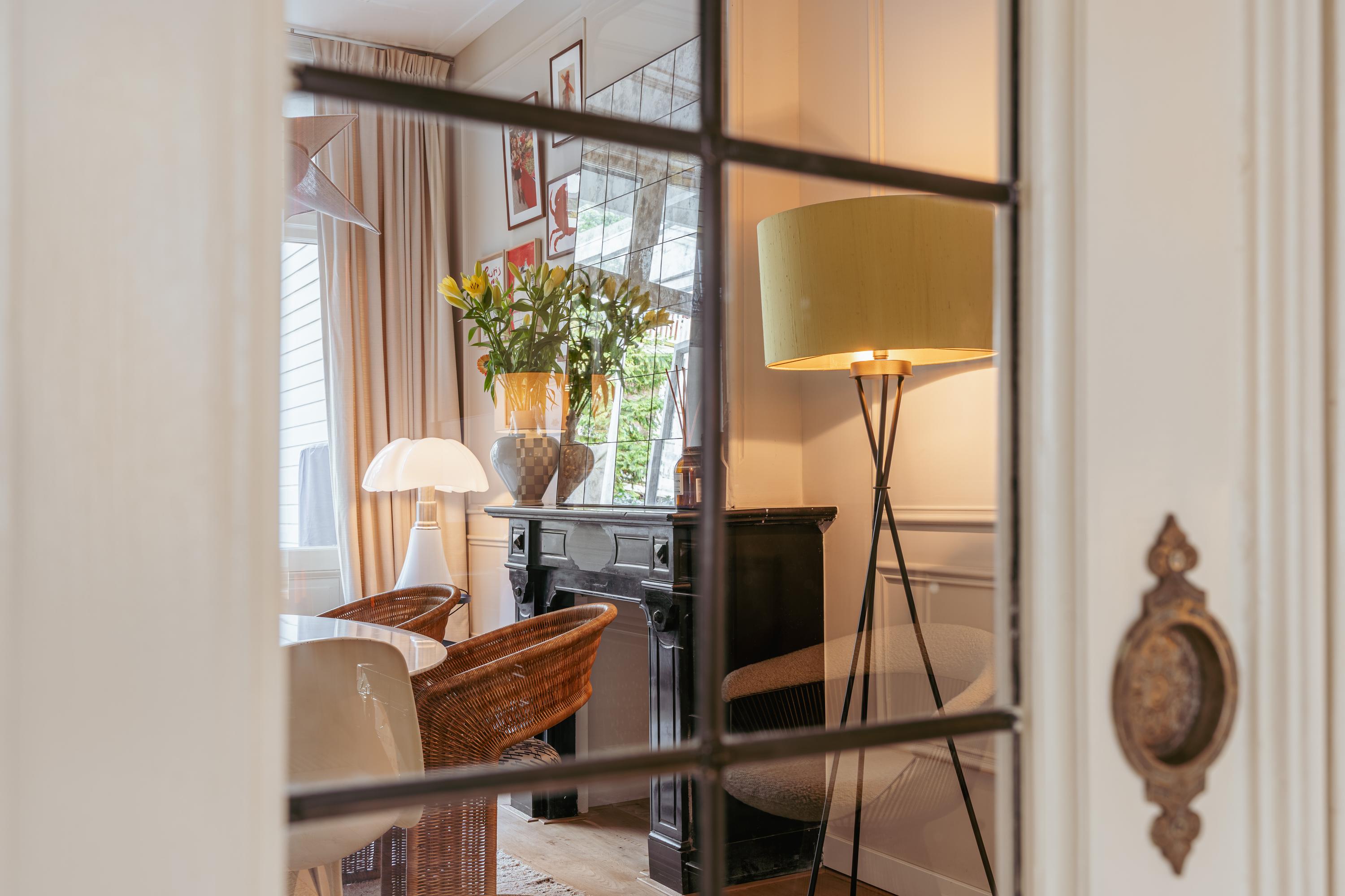Aan de voorzijde ligt de woonkamer, voorzien van fraaie inbouwkasten. De grote raampartijen met glas-in-lood zorgen voor een prachtige lichtinval en versterken de authentieke sfeer. De originele open haard vormt een stijlvol middelpunt van de ruimte. Aangrenzend bevindt zich, afsluitbaar middels schuifdeuren, de eetkamer. Ook hier vindt u een karakteristieke schouw en ingebouwde kasten. Dankzij de openslaande deuren is er volop daglicht en ontstaat er in de zomer een mooie verbinding tussen binnen en buiten. Beide kamers zijn ruim opgezet en bieden de mogelijkheid om deze naar wens open of juist separaat te gebruiken.