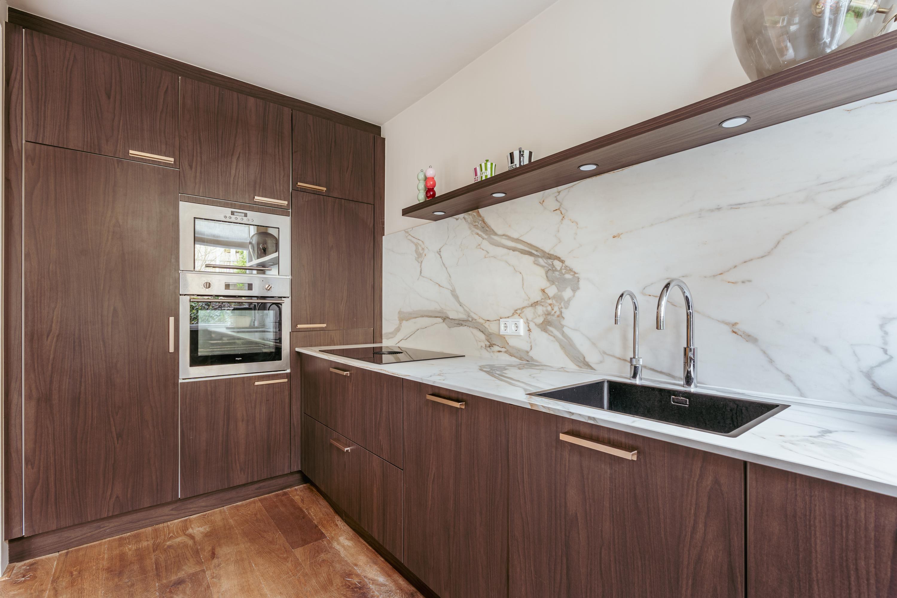 De open keuken grenst aan de eetkamer en ligt iets verhoogd, wat een speels en ruimtelijk effect geeft. De keuken is uitgevoerd in donker eikenhout en voorzien van plafondhoge ingebouwde kasten en inbouwapparatuur, waaronder een dubbele oven, koelkast, vriezer, vaatwasser, inductiekookplaat met geïntegreerde afzuiging en een Quooker.