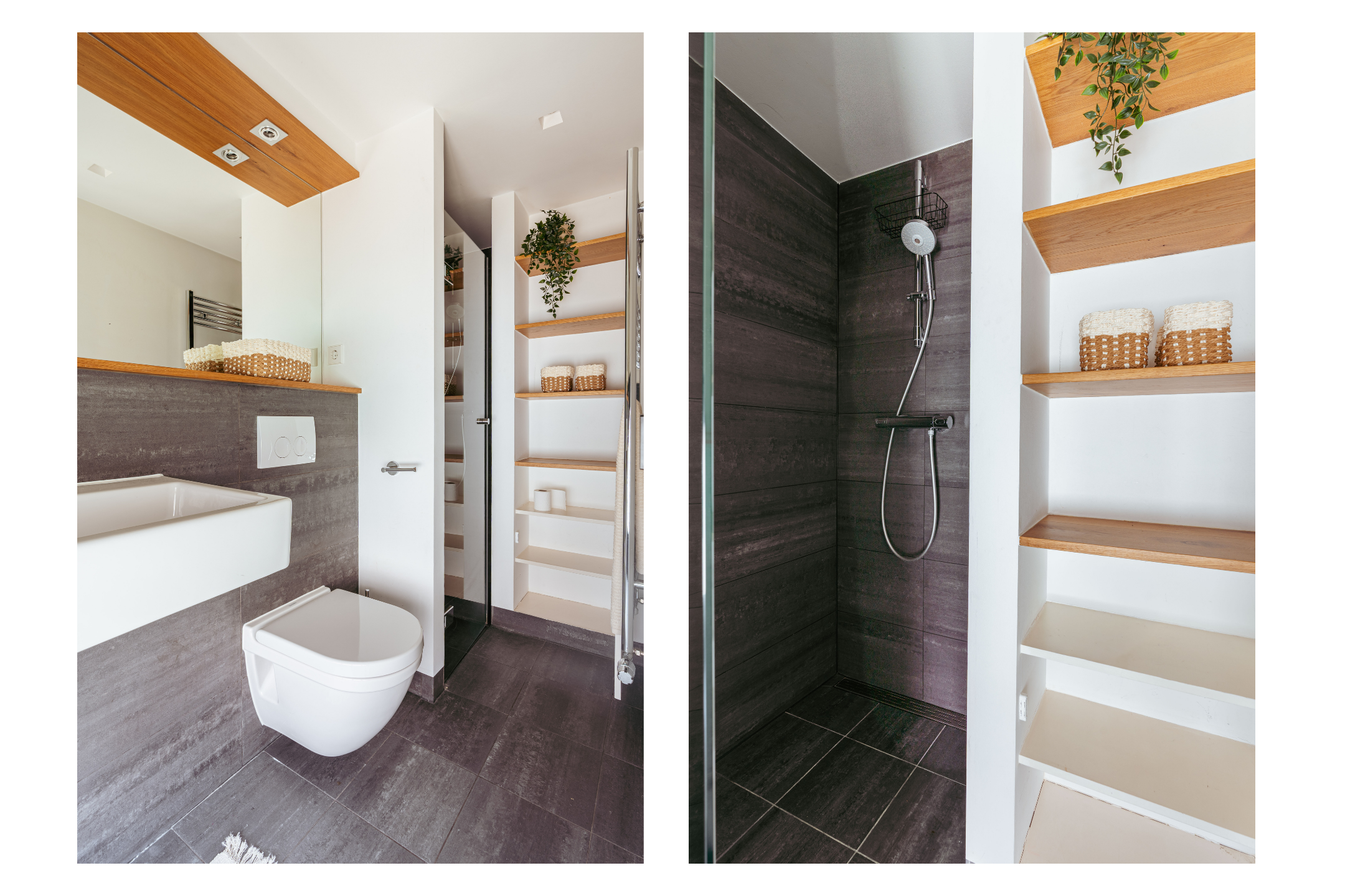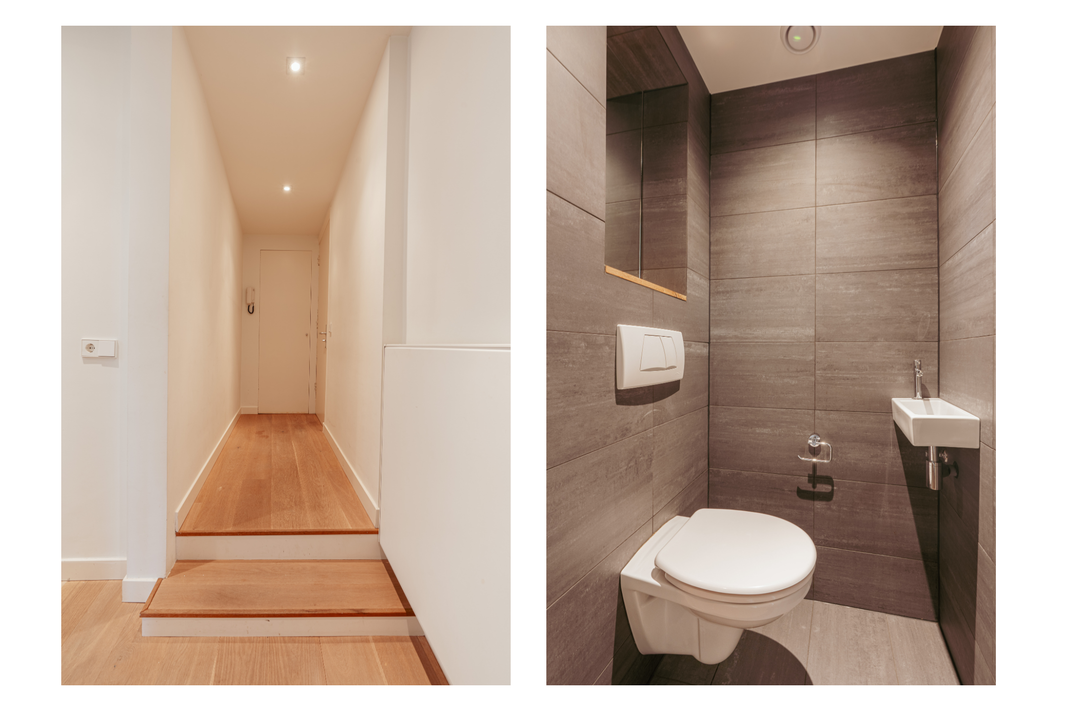 Via de open trap in de woonkamer loopt u naar de eerste verdieping, die eveneens een eigen entree heeft via het gemeenschappelijke trappenhuis. De ruime hal biedt voldoende plek voor een garderobe en extra kastruimte. Hier bevindt zich ook de eerste badkamer, uitgerust met een inloopdouche, wastafelmeubel en een separaat toilet met fontein. Aan de voorzijde ligt de royale master bedroom, voorzien van inbouwkasten, grote ramen en een en-suite badkamer met inloopdouche, wastafel en toilet. Aan de achterzijde bevindt zich de derde, goed bemeten slaapkamer met op maat gemaakte kasten en openslaande deuren naar het tweede balkon. Aangrenzend vindt u de wasruimte met gootsteen, die eveneens toegang biedt tot het balkon.