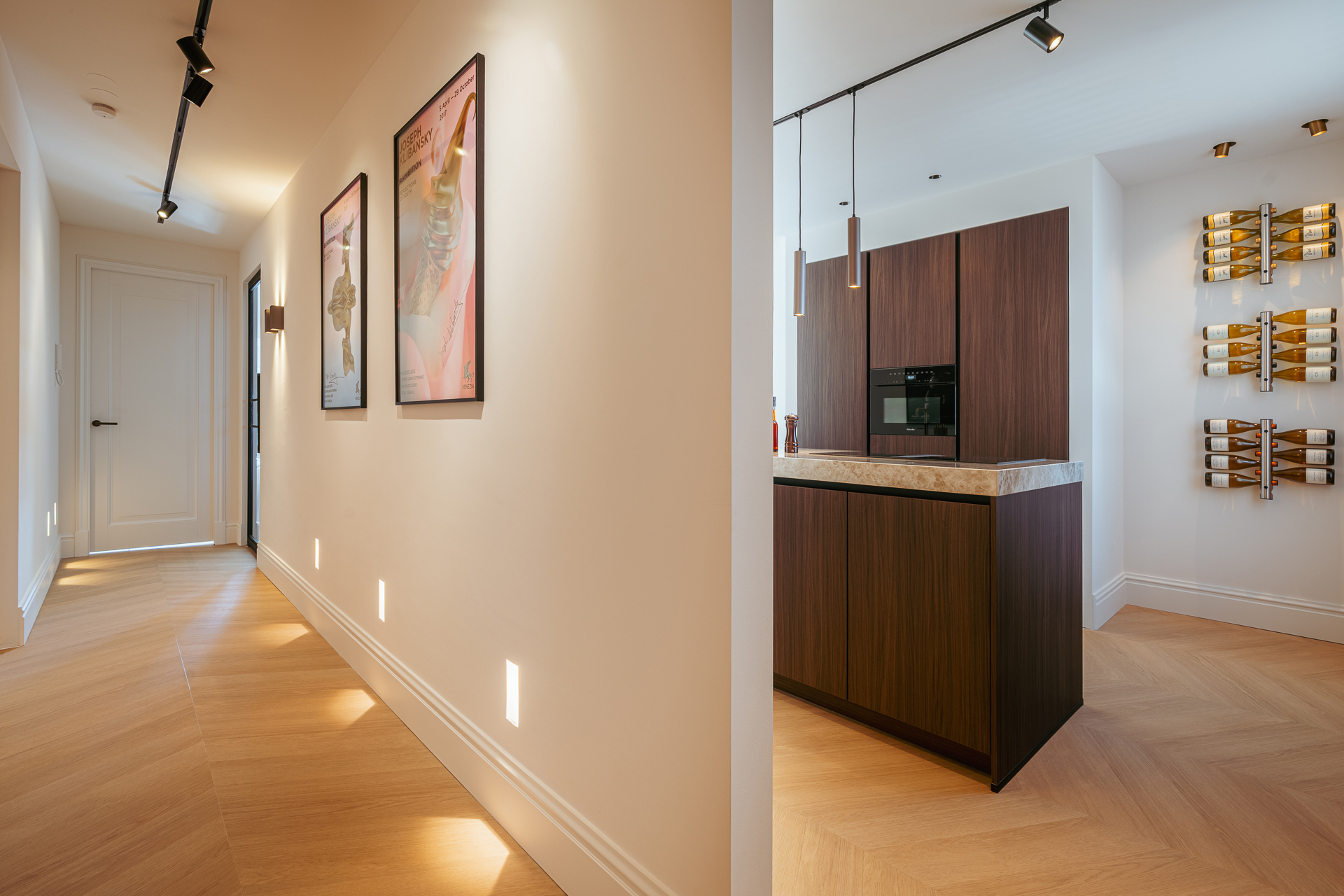 Via het gemeenschappelijke trappenhuis bereikt u de entree van de woning op de derde verdieping. Vanuit uw eigen entree leidt een nette, gerenoveerde trapopgang naar het appartement op de vierde verdieping. Bij binnenkomst valt direct de warme en stijlvolle sfeer op, mede dankzij de zorgvuldig gekozen materialen, sfeervolle verlichting en de prachtige afwerking. Het appartement is hoogwaardig en luxe gerenoveerd, waarbij veel aandacht is besteed aan details. De moderne zwarte stalen deuren in combinatie met klassieke details geven het geheel een eigentijdse uitstraling, iets wat u door het hele appartement terugziet.
