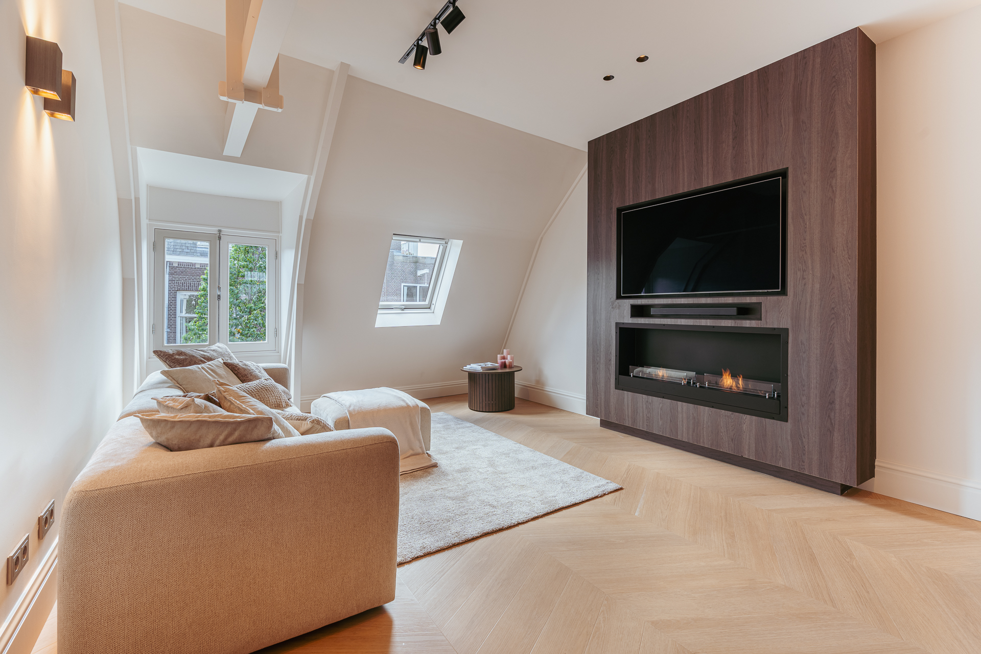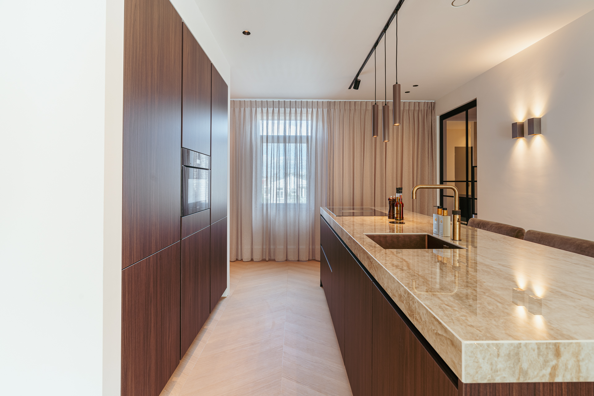 U komt op de bovenste etage binnen via de geïntegreerde schuifdeur in een prachtige, ruime, lange hal die toegang biedt tot alle vertrekken. Het hart van de woning wordt gevormd door de woon- eetkeuken, die zich uitstrekt over de volledige lengte van het appartement. Dankzij ramen aan beide zijden geniet de ruimte van veel natuurlijk licht. Aan de voorzijde bevindt zich de zithoek met een sfeervolle bio-ethanol haard, stijlvol geïntegreerd in een ingebouwde kast met tv. Aan de achterzijde ligt de moderne open keuken met kookeiland. De keuken is voorzien van een Dekton werkblad en bevat daarnaast alle denkbare luxe inbouwapparatuur, waaronder een wijnkoeler, Quooker, vaatwasser, koelkast/vriezer, Miele combi-oven en een Miele inductie kookplaat met geïntegreerd afzuigsysteem. Het bargedeelte maakt de keuken bovendien tot een gezellige plek om samen te koken of een glas wijn te drinken met familie en vrienden.