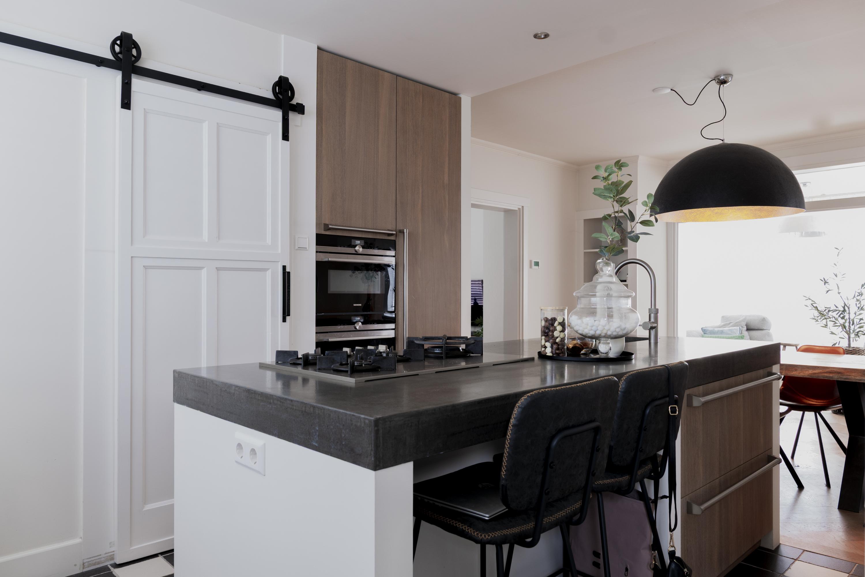 Entree met originele granitovloer, trapopgang, toilet en toegang tot de ruime kelder. De woonkamer met erker en houthaard biedt een fijne, royale leefruimte met volop mogelijkheden voor een comfortabele loungehoek. De luxe woonkeuken vormt het hart van de woning: ruim, licht en stijlvol afgewerkt, met kookeiland en hoogwaardige inbouwapparatuur. Vanuit de keuken is er een prettige verbinding met de entree en met de achtergelegen bijkeuken, inclusief een separate wasruimte.