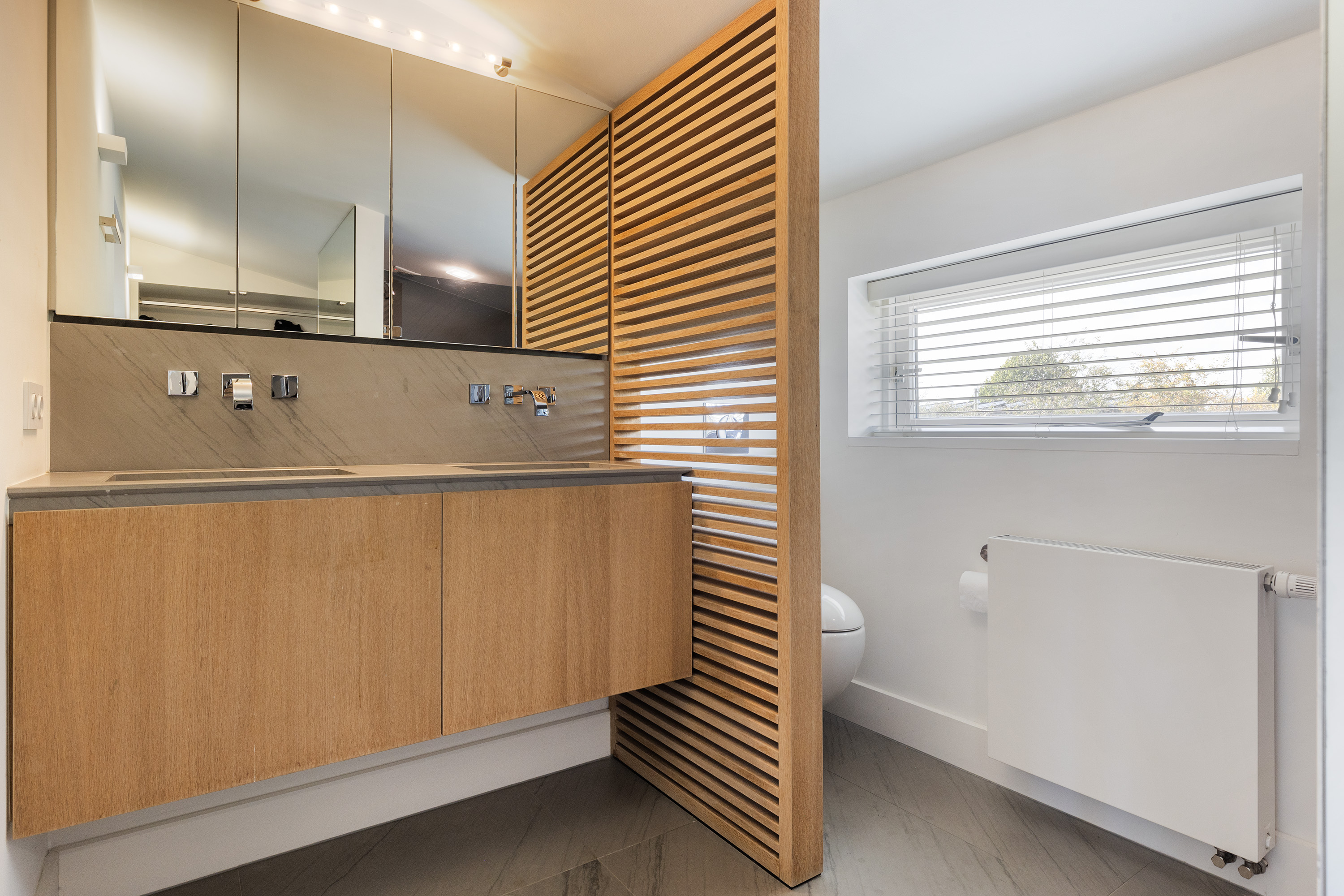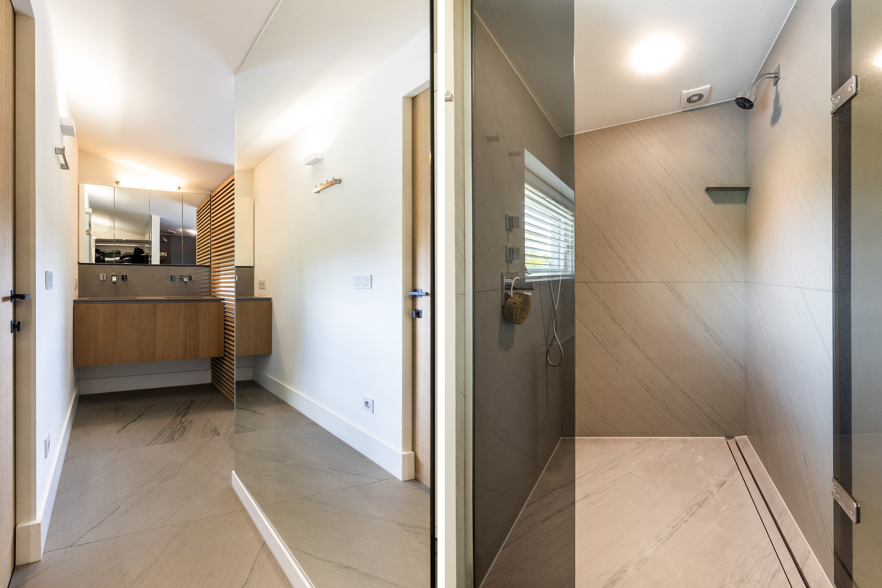De villa is gebouwd in split-level, waardoor bijzondere doorkijken en speelse hoogteniveaus een dynamisch en toch harmonisch geheel vormen. De overvloedige lichtinval en de open zichtlijnen creëren een gevoel van ruimte en vrijheid. Alle eiken binnendeuren zijn kozijnloos en hebben verdekte scharnieren, waardoor een strakke en minimalistische lijnvoering ontstaat.