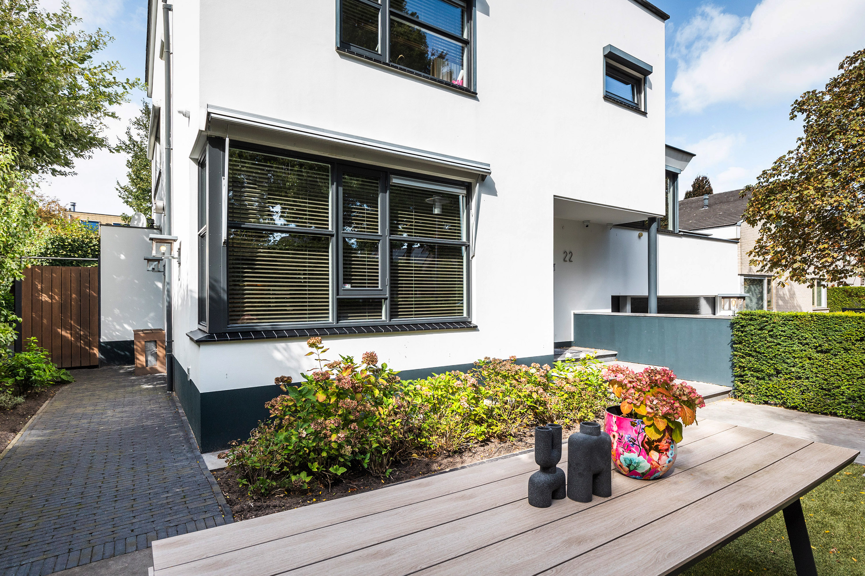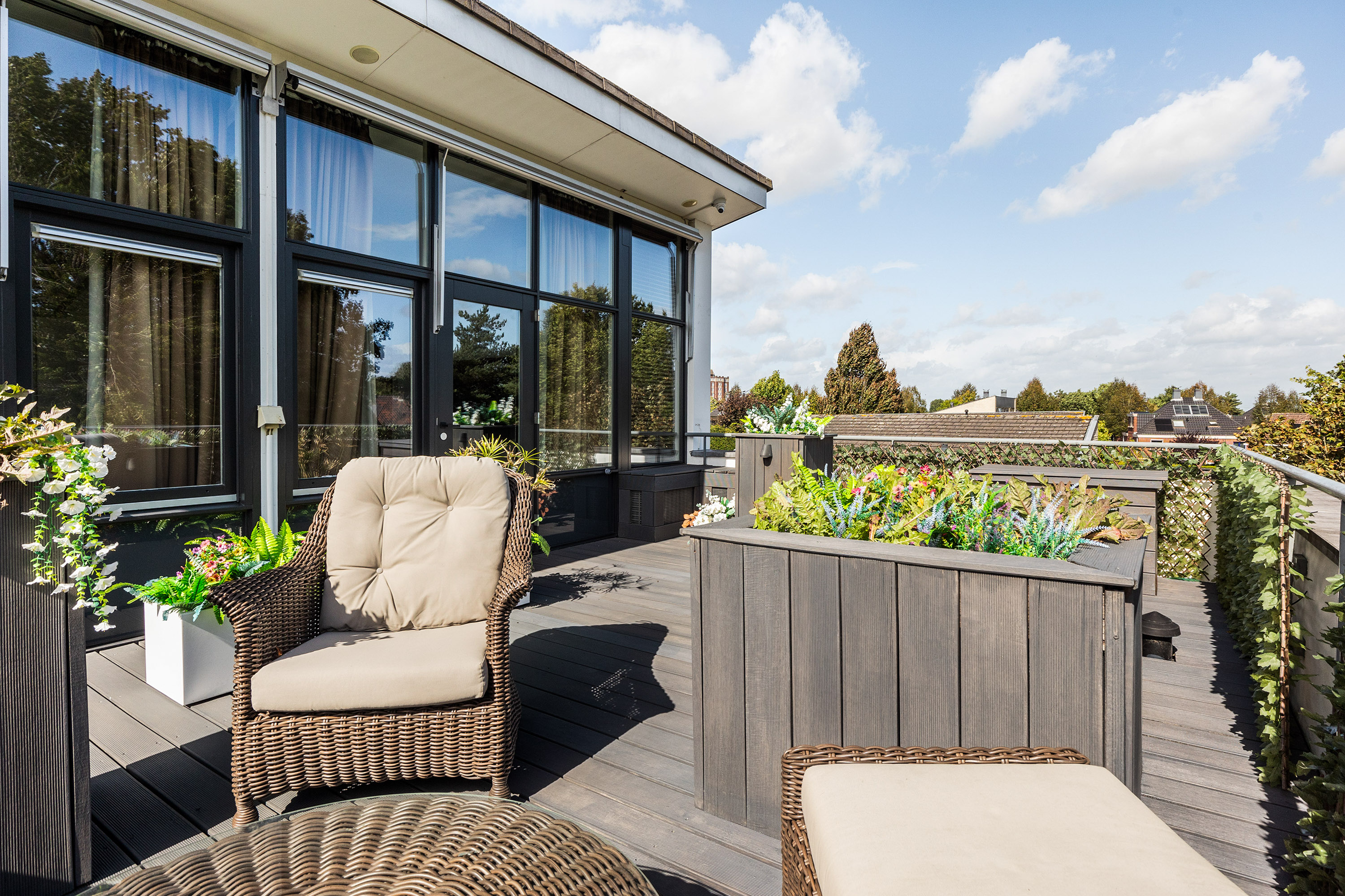 De in 2025 opnieuw aangelegde tuin is een oase van privacy en groen, gunstig gelegen op het zuidwesten. Meerdere terrassen bieden steeds een andere sfeerbeleving. De veranda is uitgevoerd met een riant hoog plafond waarin een grote lichtstraat is opgenomen. Het terras onder de veranda is daardoor aangenaam licht. Door de voorzieningen kunt u hier aangenaam in alle jaargetijden van de buitenruimte genieten met de sfeervolle open haard, een heater en windscreen. De twee balkons bieden besloten plekken om te ontspannen. De tuin beschikt over automatische beregening en is ideaal voor barbecues of lange zomeravonden.