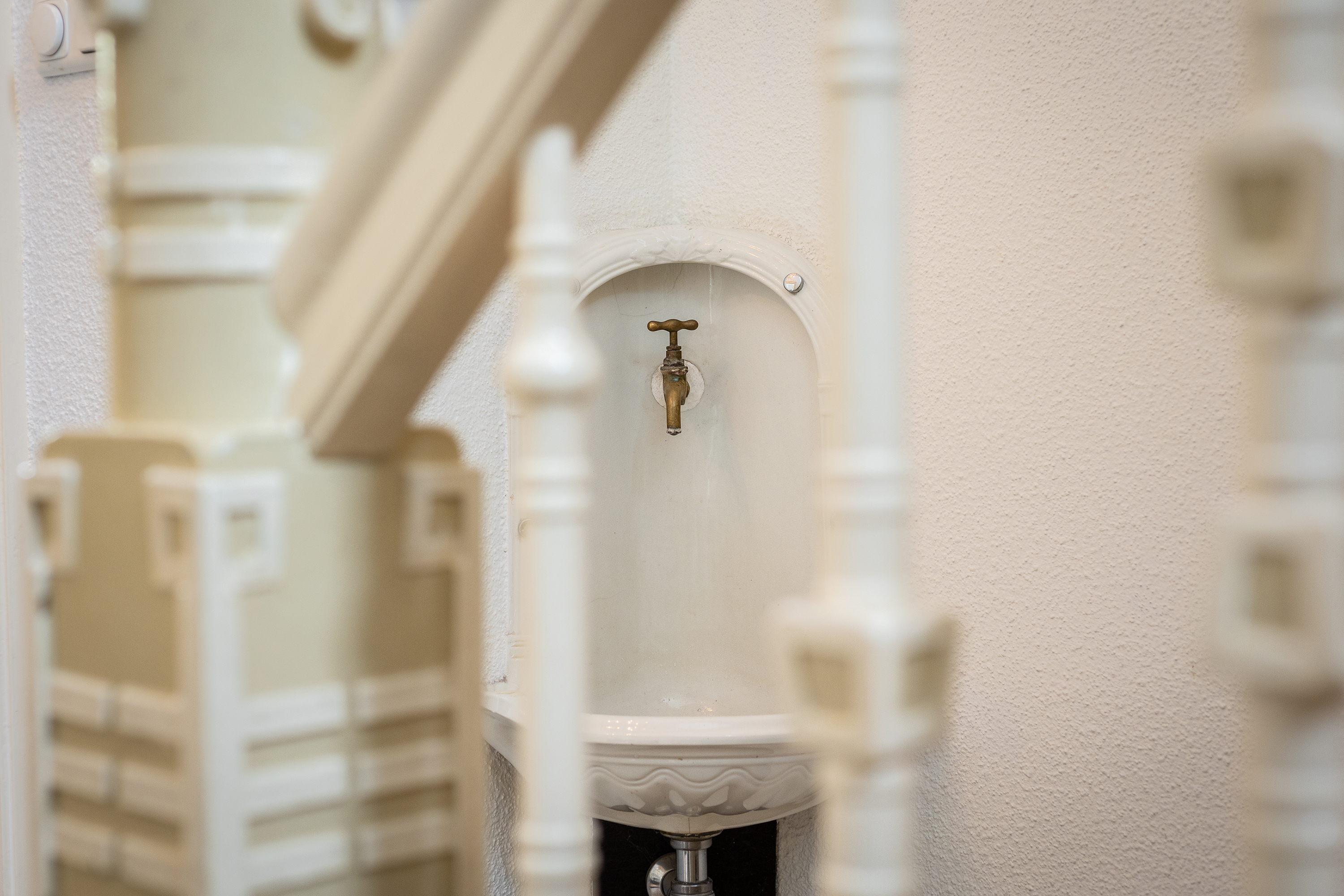Aan de linkerzijde van de hal bevindt zich een ruime werkkamer, ideaal gelegen aan de voorzijde van de woning en voorzien van het unieke olieverfplafond in originele kleuren. Deze ruimte biedt rust en karakter, perfect als thuiskantoor of studieplek.