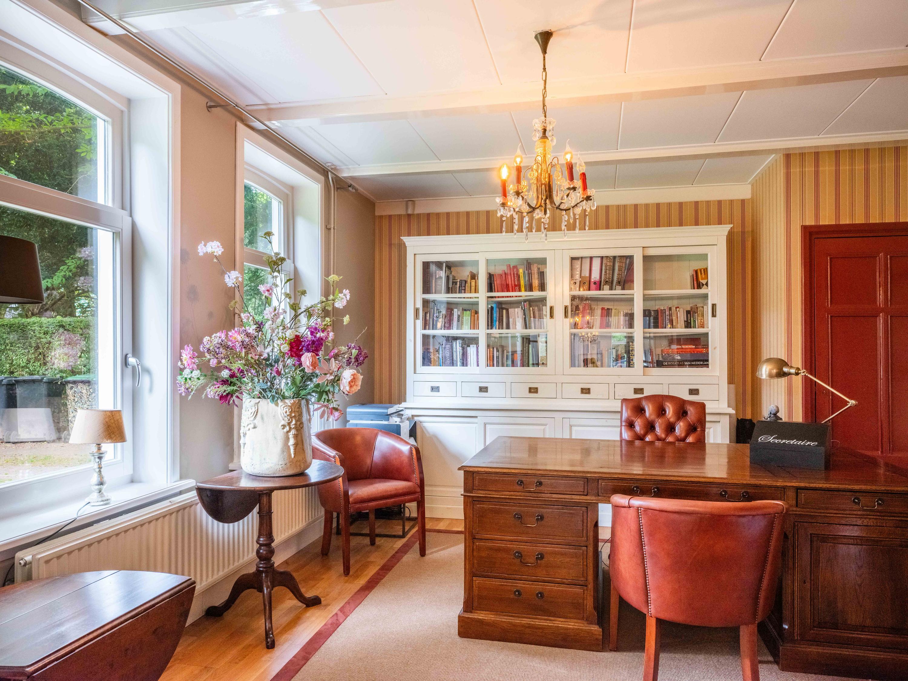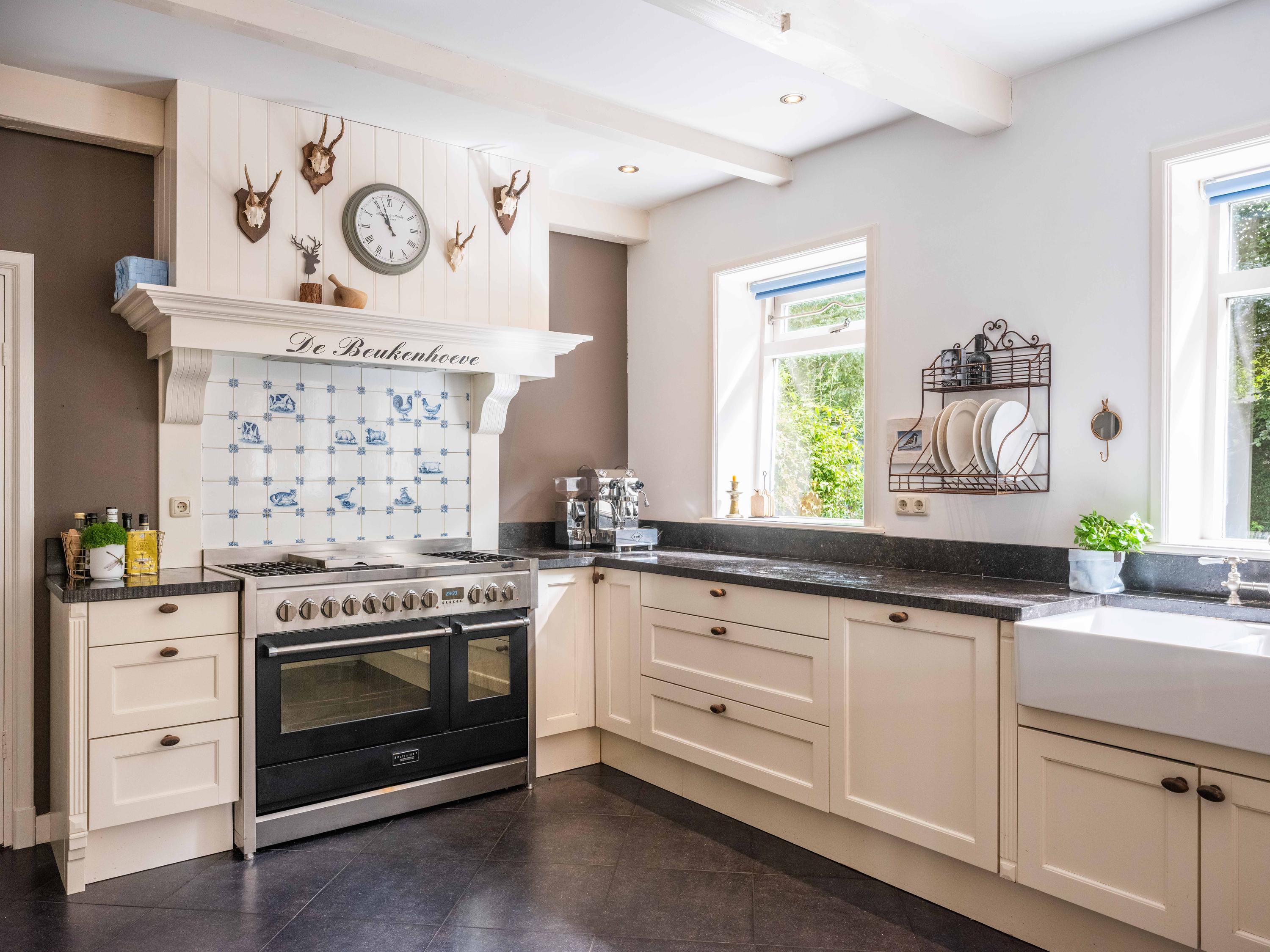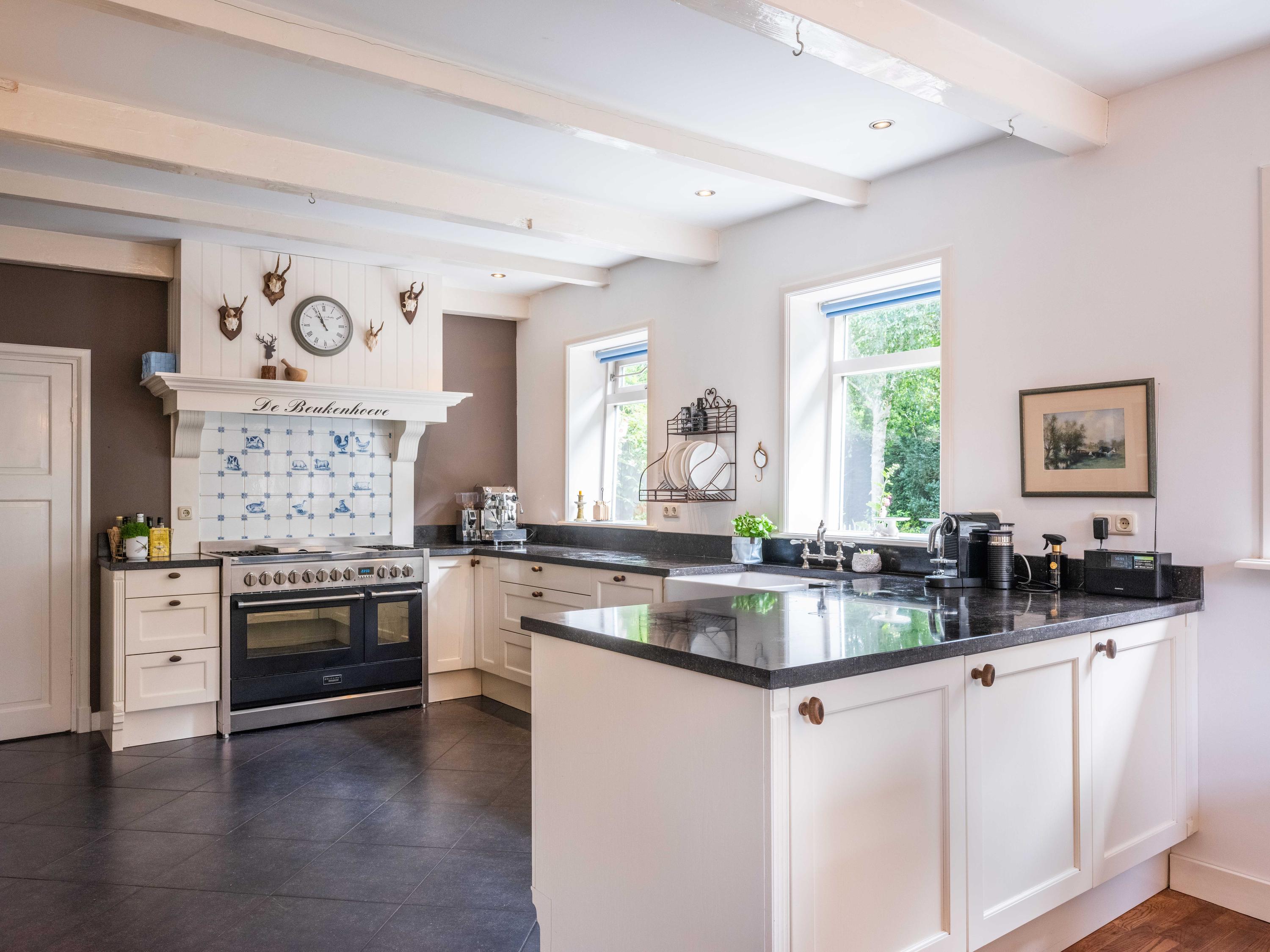 De ruime living van 18 meter lang is licht door de vele raampartijen. Kamer-en-suite deuren delen nu de ruimte in tweeën, waarvan een deel kantoor is. In de woonkamer vinden we een gezellige houtkachel en een deur naar het terras. De ruime landelijke open keuken heeft een opvallende schouw met groot fornuis. Aansluitend aan de keuken vinden we een waskamer met aansluiting voor wasmachine en droger en opbergruimte. Aangrenzend bevind zich een linnenkamer. Er is een bijkeuken met inbouwkasten over de gehele lengte en een keukenblok. De deur gaat naar het tweede terras grenzend aan de woning.