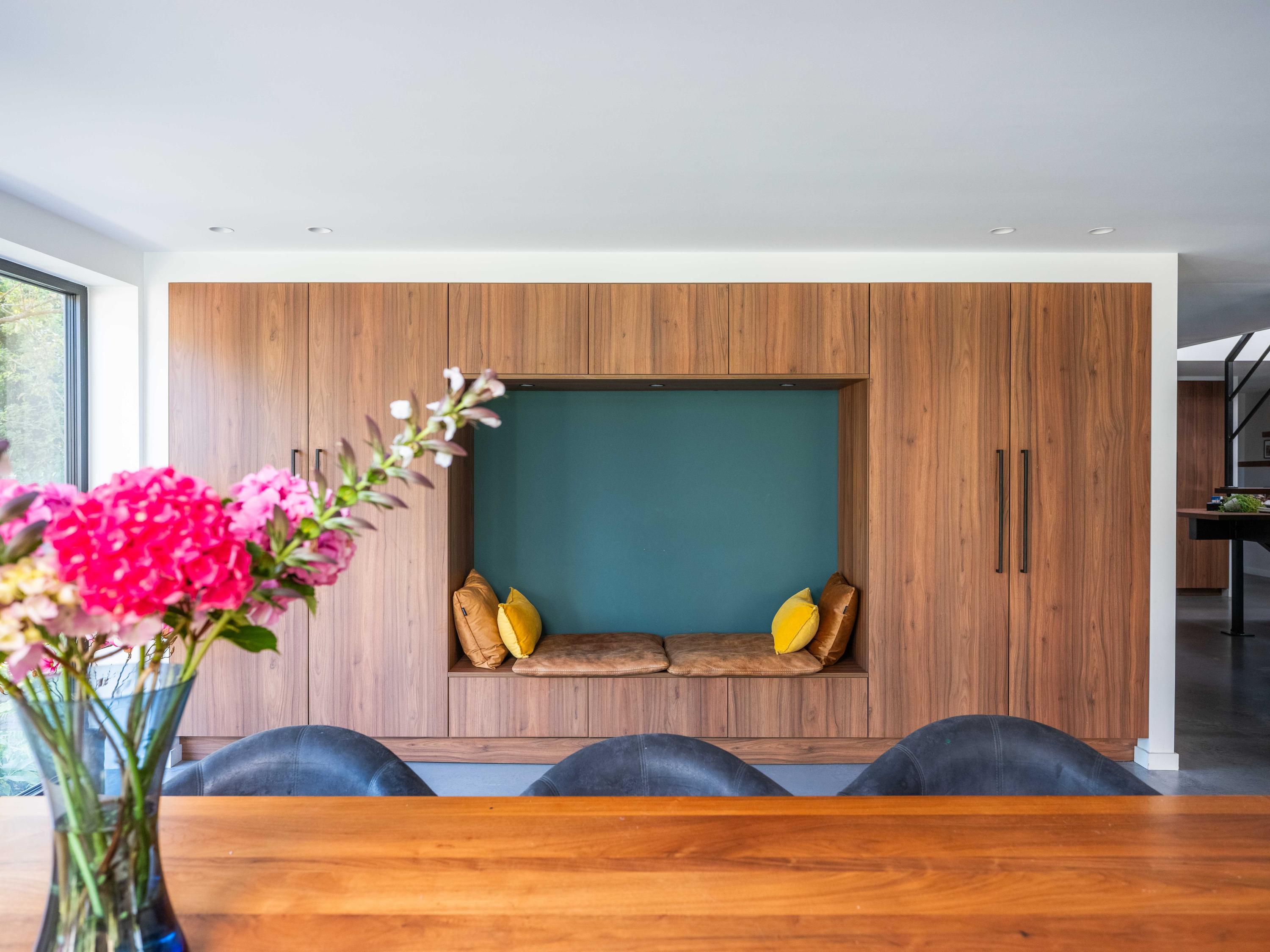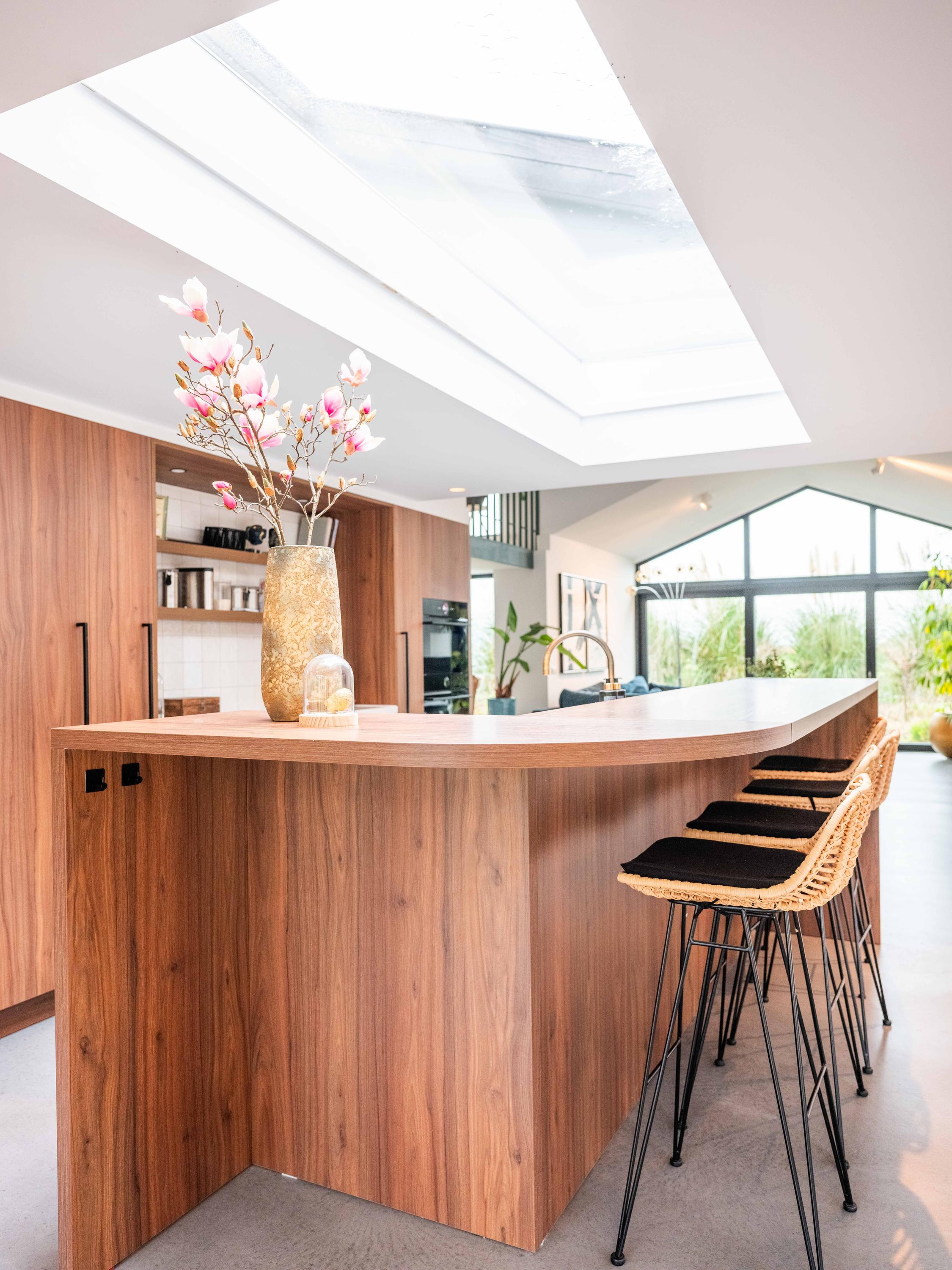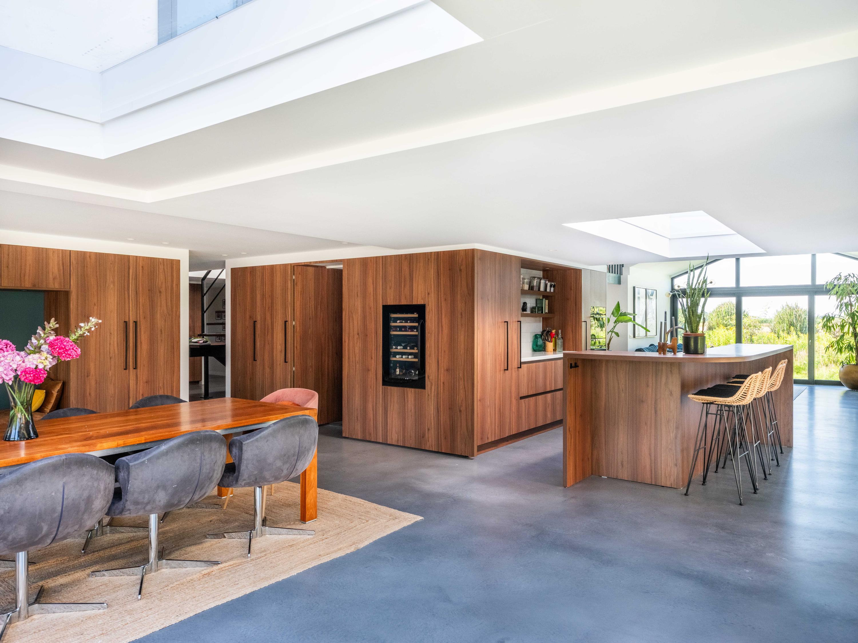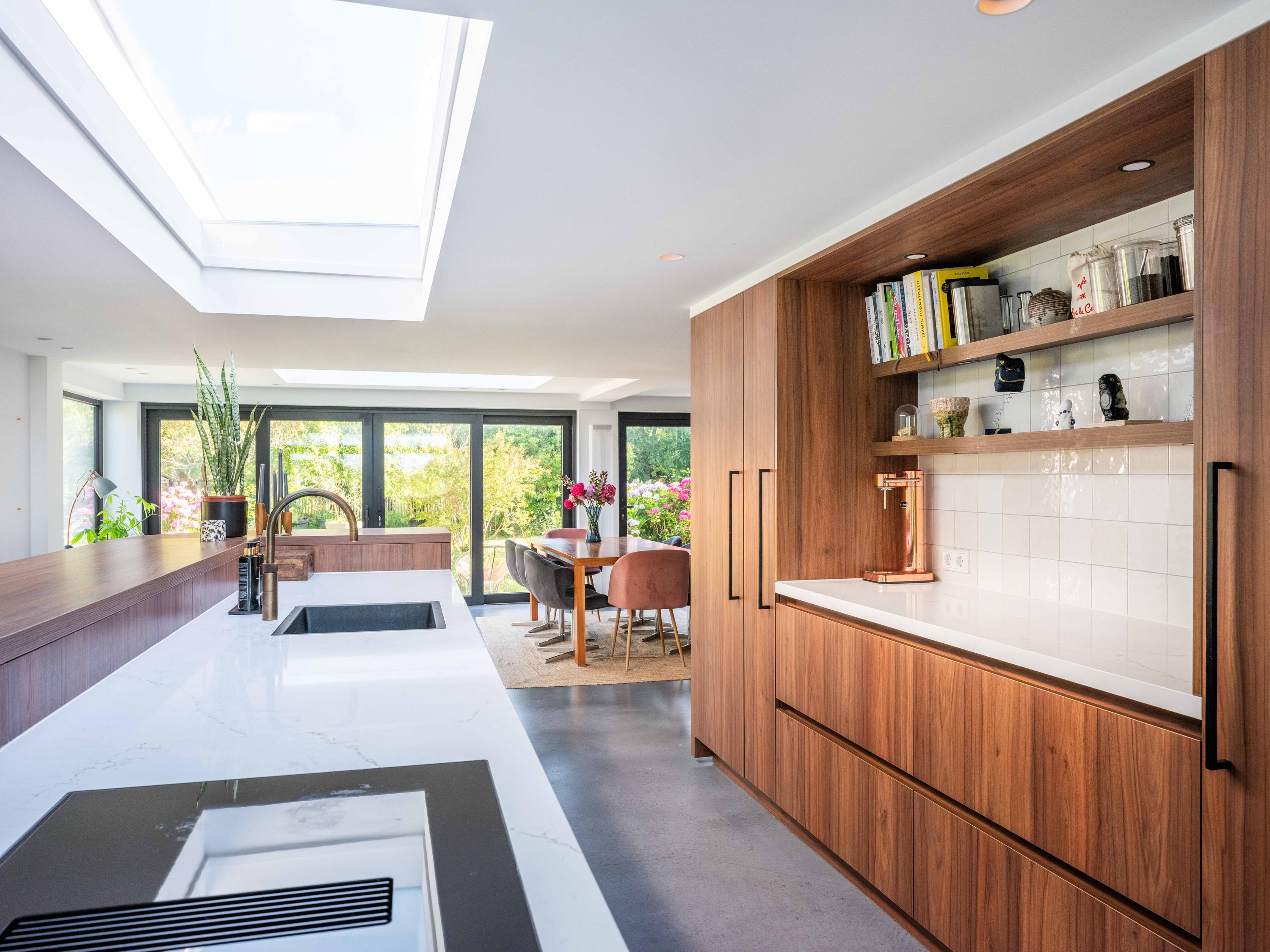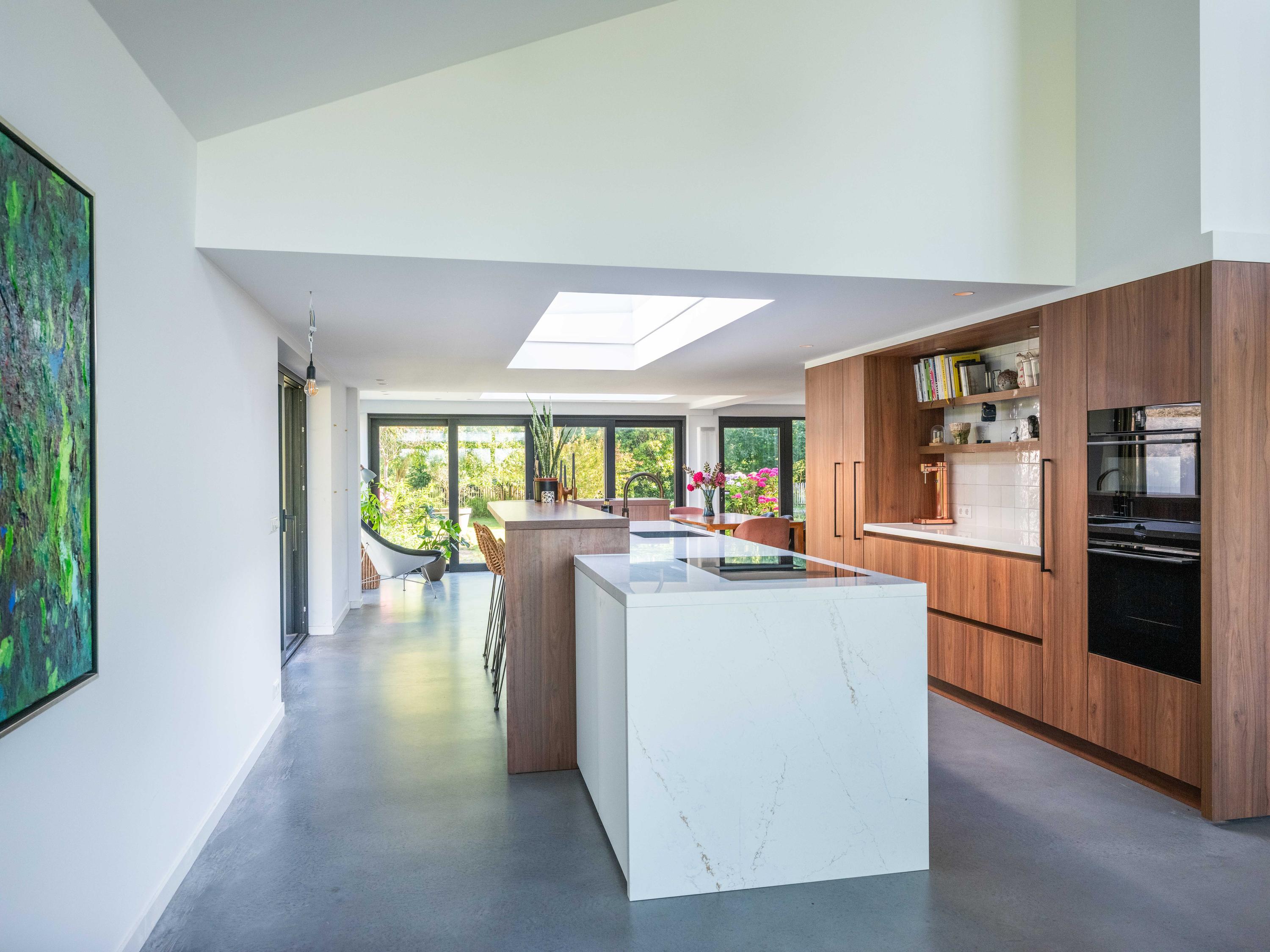 De op maat gemaakte keuken in rijk notenhout-look is een droom voor iedere kookliefhebber: zeer compleet, met hoogwaardige apparatuur waaronder een luxe wijnklimaatkast. Een architectonisch hoogstandje is de notenhoutenlook wand met verborgen deur; hierachter schuilt een ruimte die perfect dienst kan doen als riante bijkeuken. De zitkamer aan de voorzijde biedt een gezellige speel-/leeshoek en een panoramisch uitzicht over de polder. Aan de achterzijde vindt u de lichte eetkamer met grote dakramen, maatwerkkasten en openslaande deuren naar de tuin.