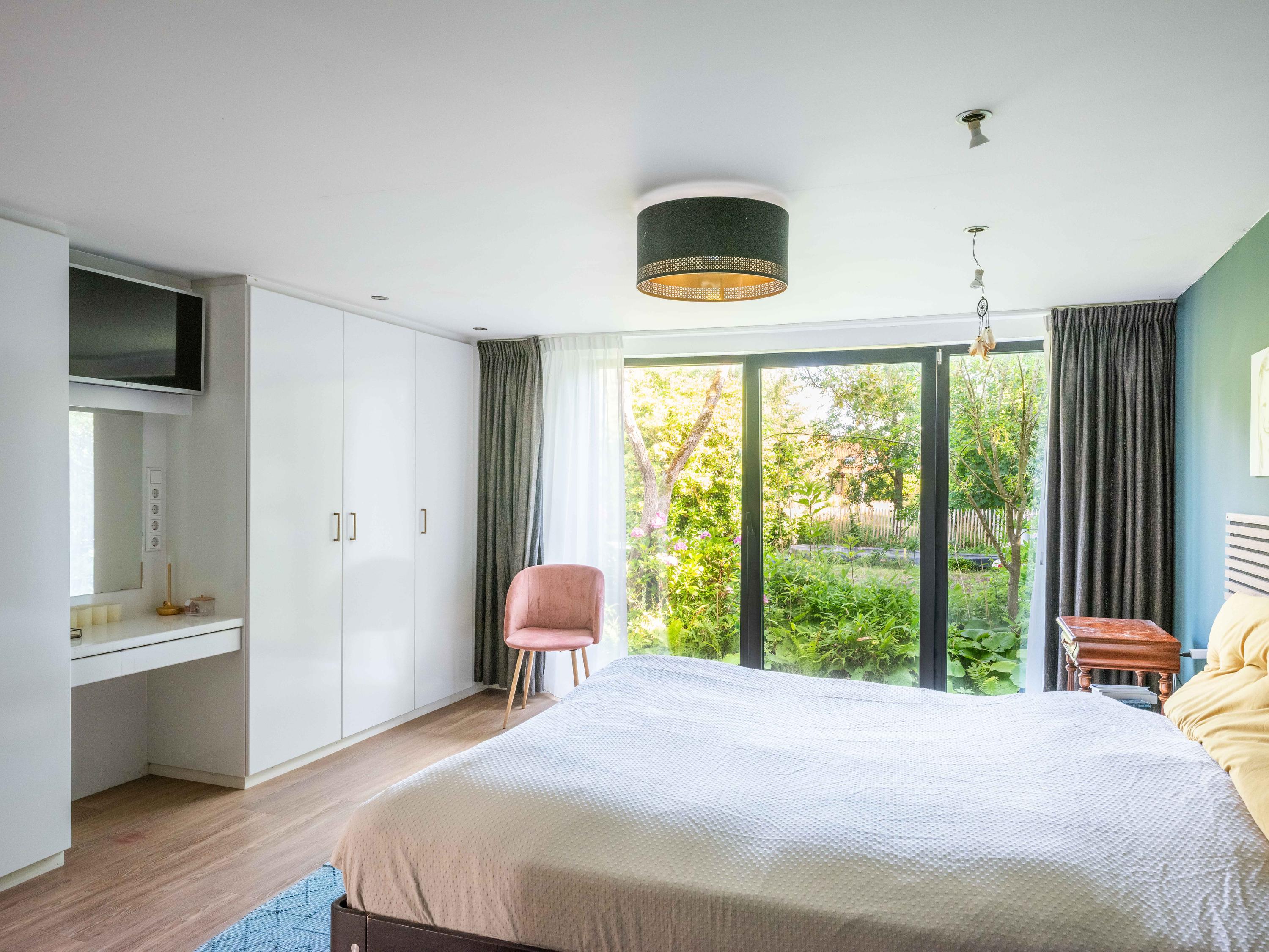 De master bedroom op de begane grond beschikt over een inloopkast en een complete, lichte badkamer met ligbad, inloopdouche, dubbele wastafel, vloerverwarming en toilet. Levensloopbestendig wonen is dus hier prima mogelijk.