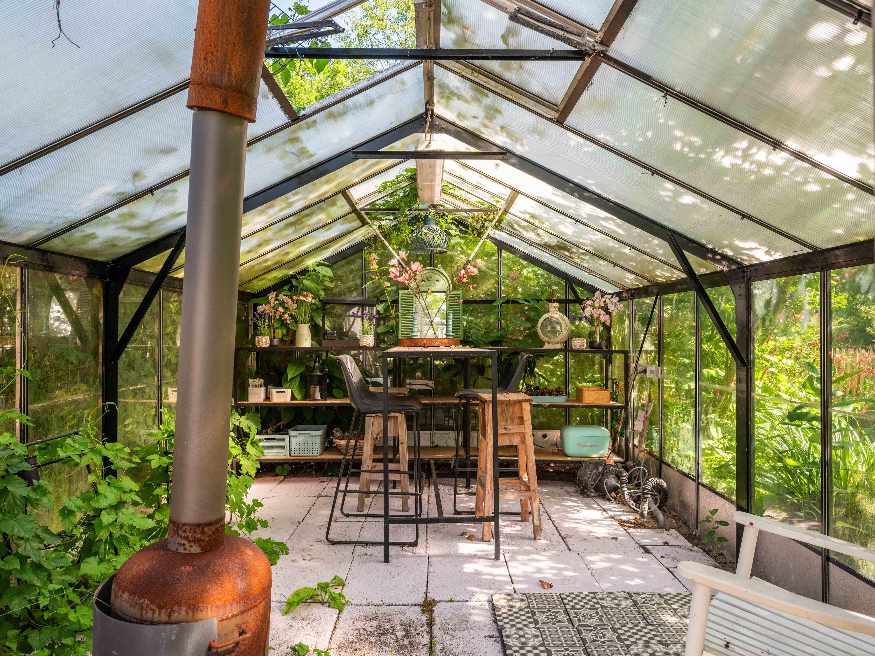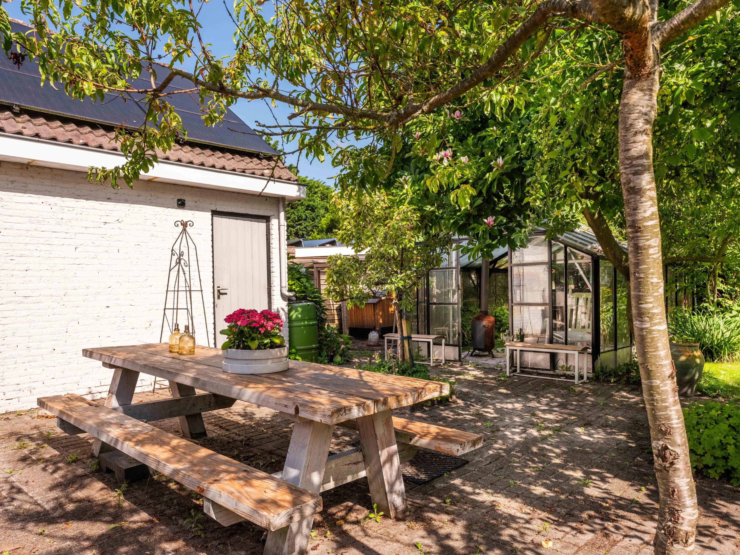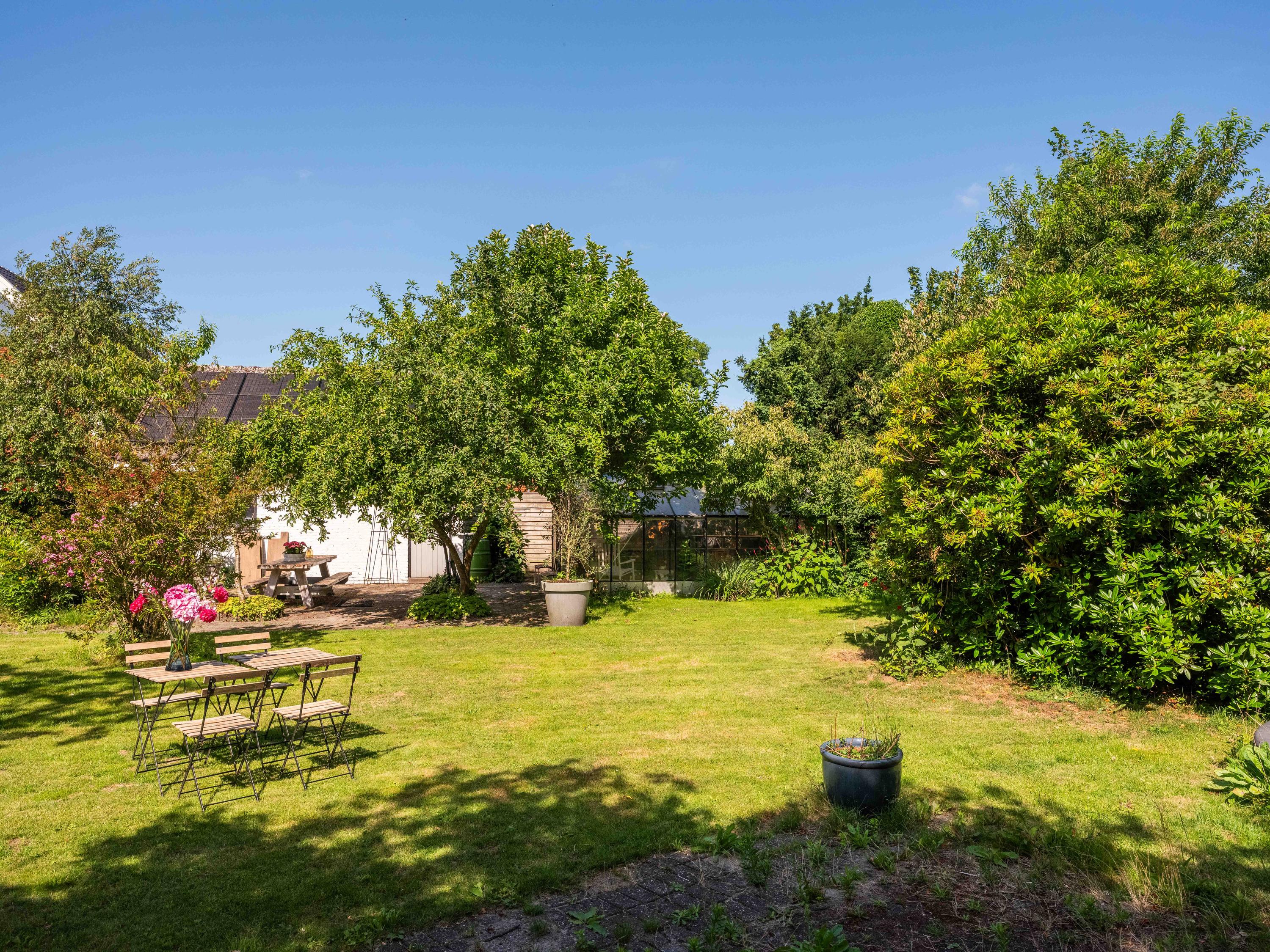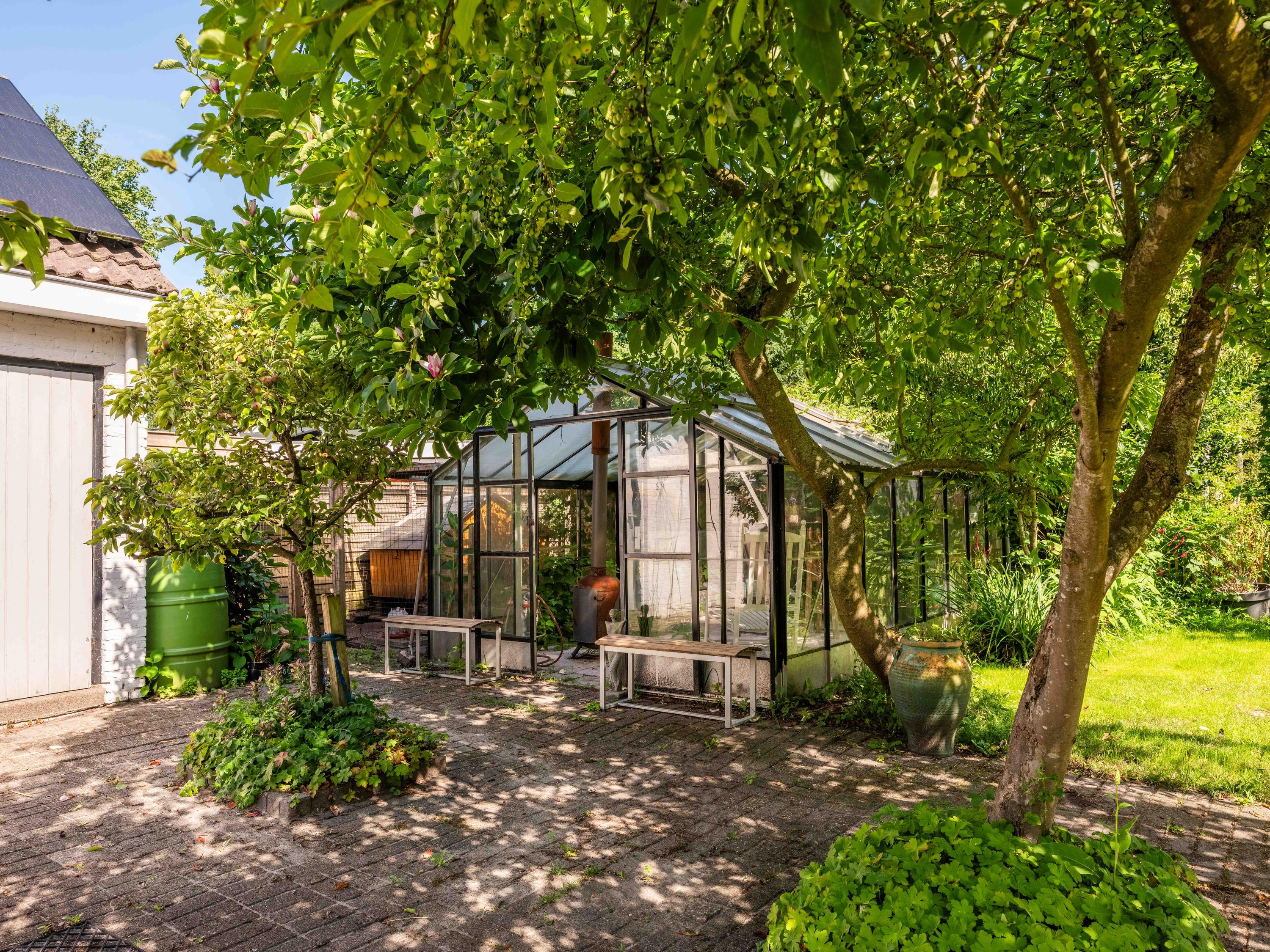 De rondom aangelegde tuin biedt volop privacy, zon én schaduw. Er is een kas voor de tuinliefhebber, nu in gebruik als sfeervolle borrelruimte met buitenhaard; de perfecte plek voor lange zomeravonden met vrienden en familie. Ook is er een grote vrijstaande stenen garage (ca. 50 m²) met bergvliering, geschikt voor twee auto's.
