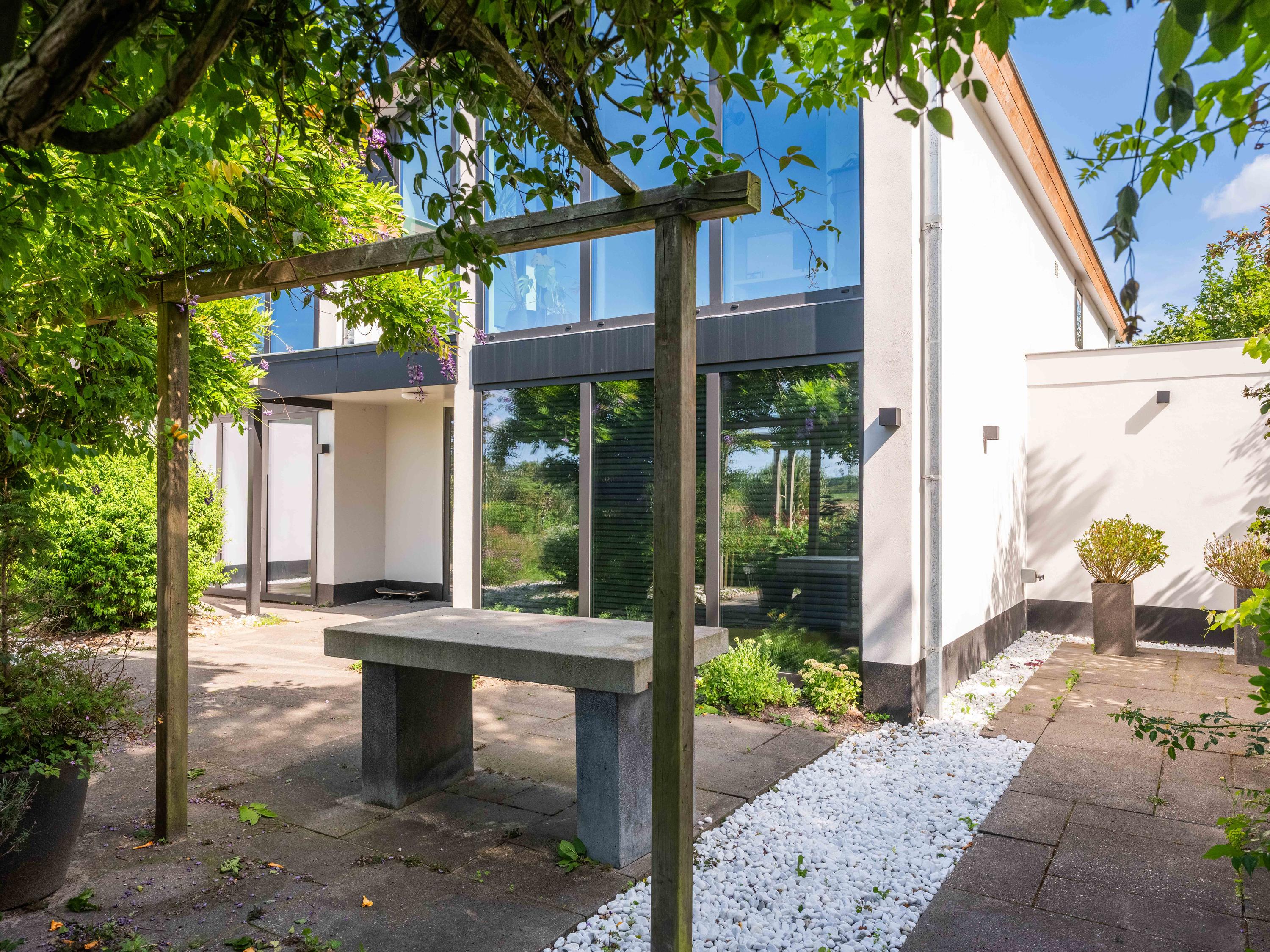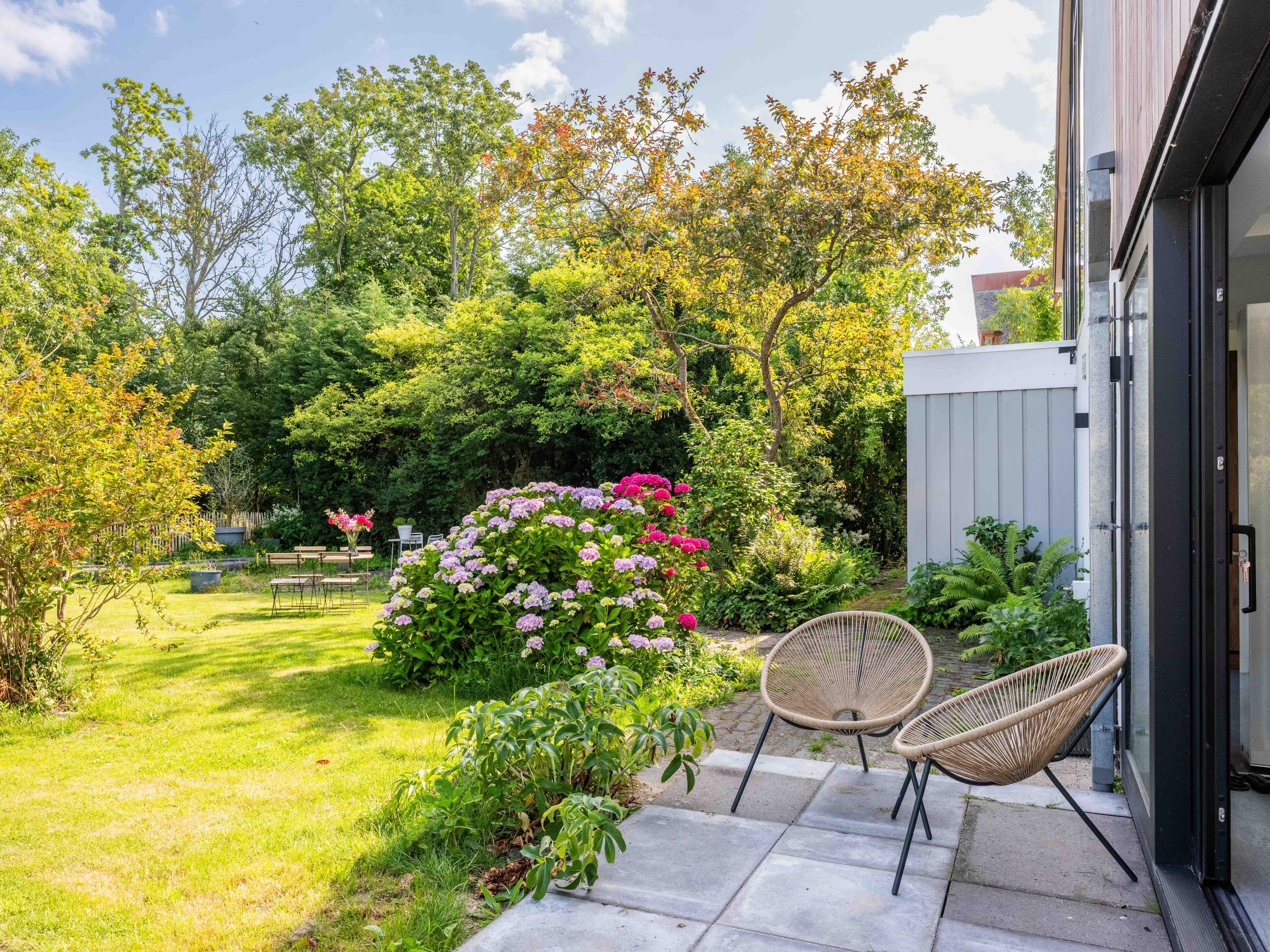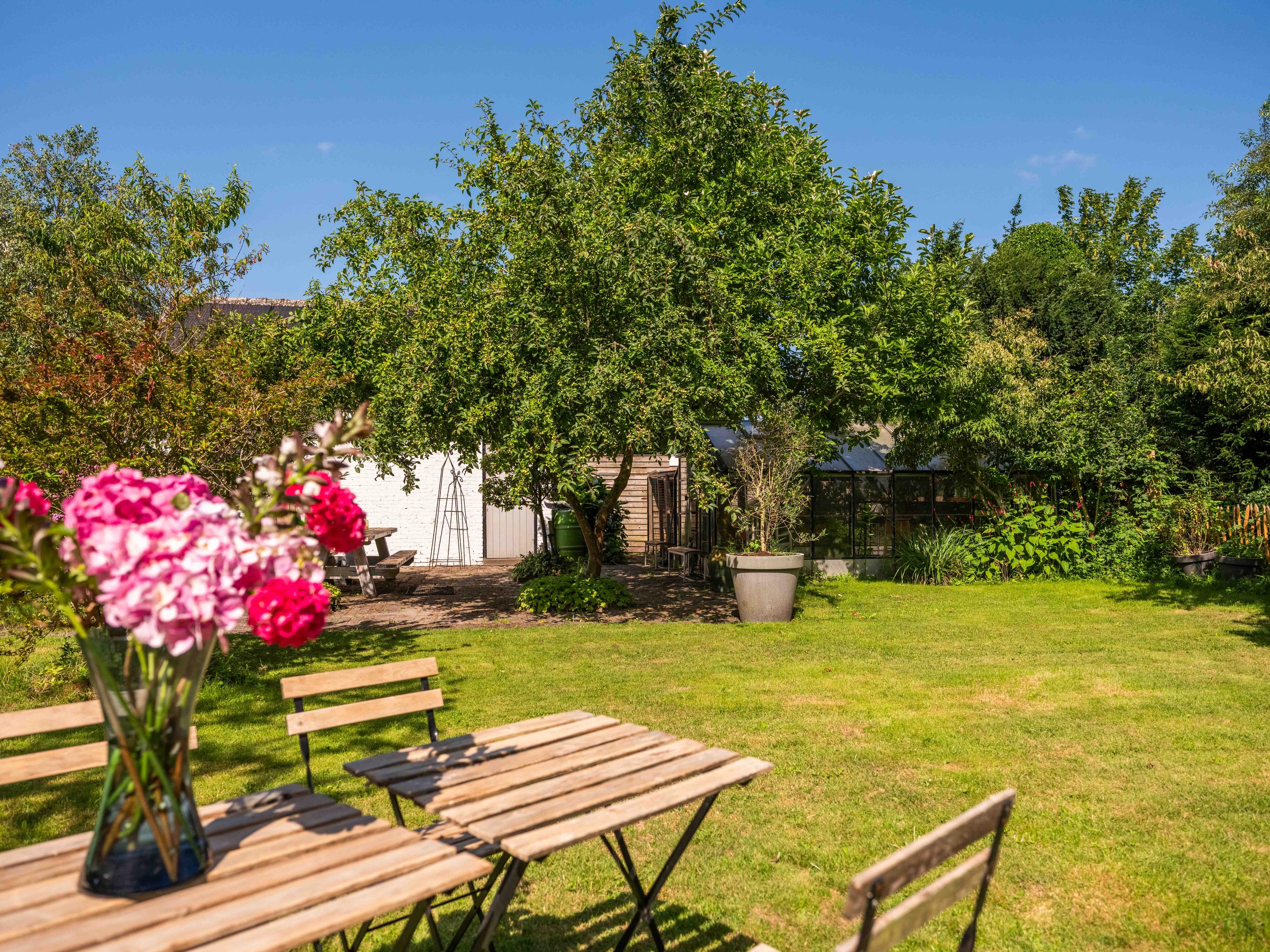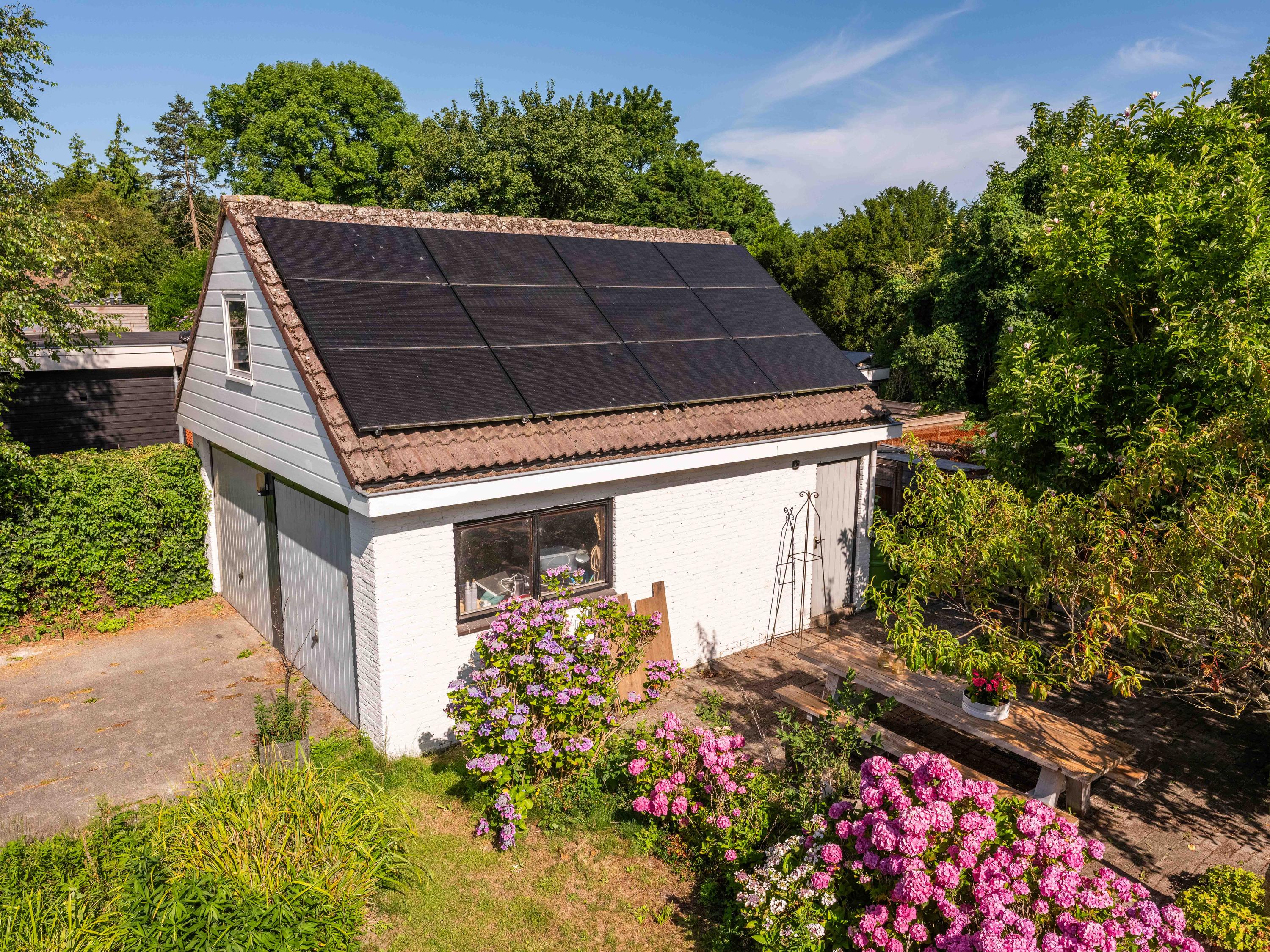 De rondom aangelegde tuin biedt volop privacy, zon én schaduw. Er is een kas voor de tuinliefhebber, nu in gebruik als sfeervolle borrelruimte met buitenhaard; de perfecte plek voor lange zomeravonden met vrienden en familie. Ook is er een grote vrijstaande stenen garage (ca. 50 m²) met bergvliering, geschikt voor twee auto's.