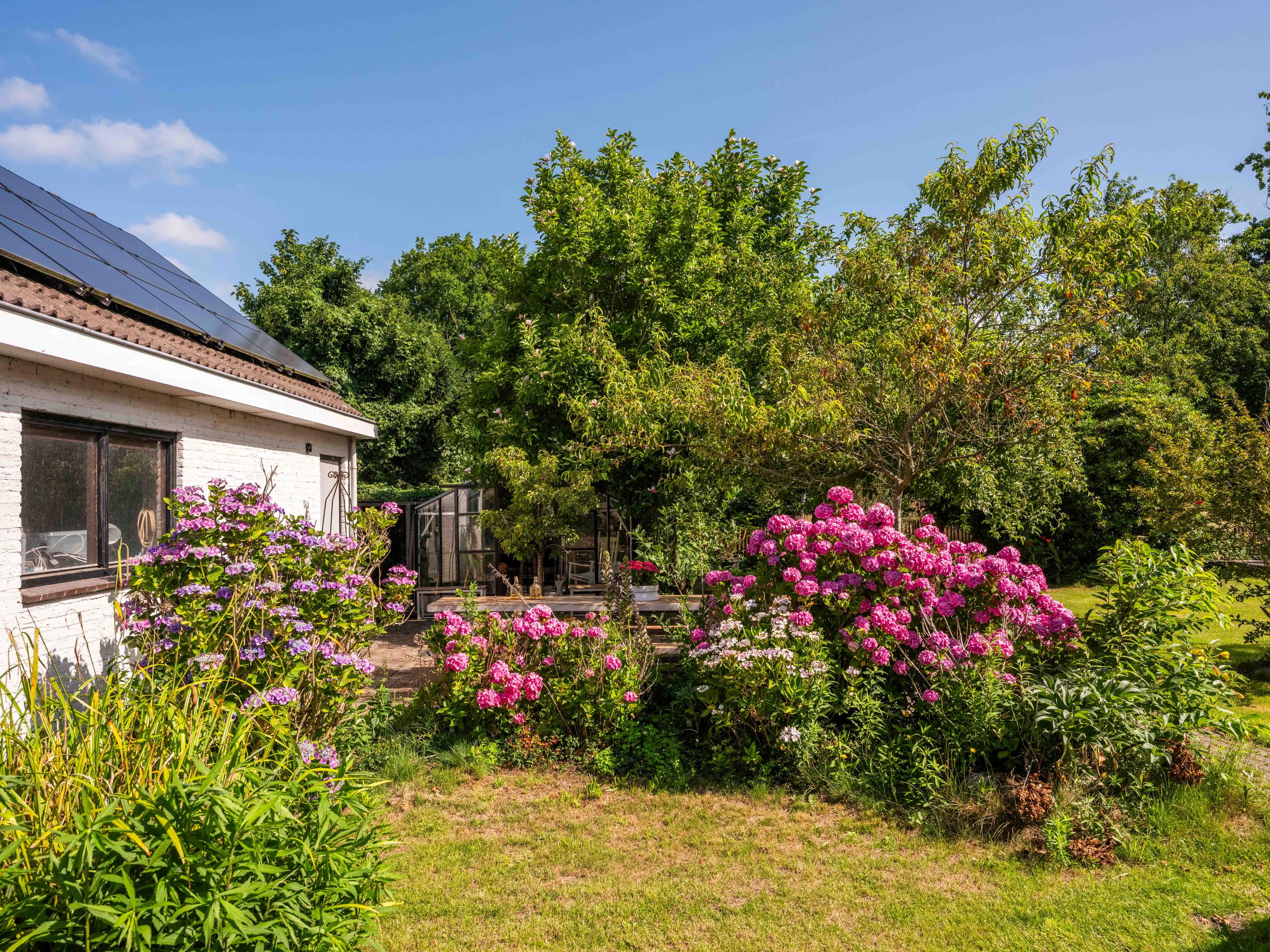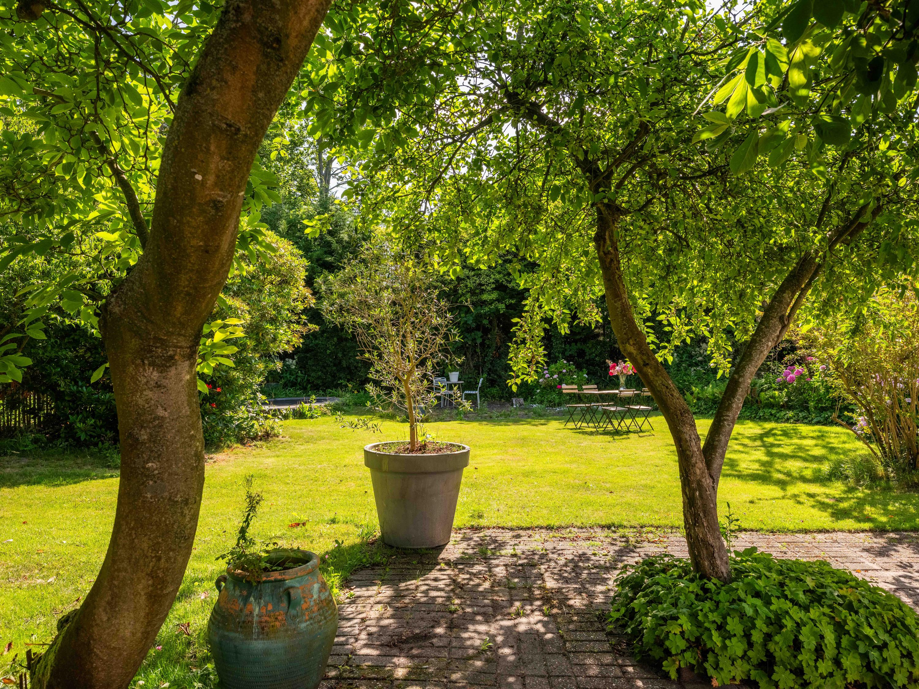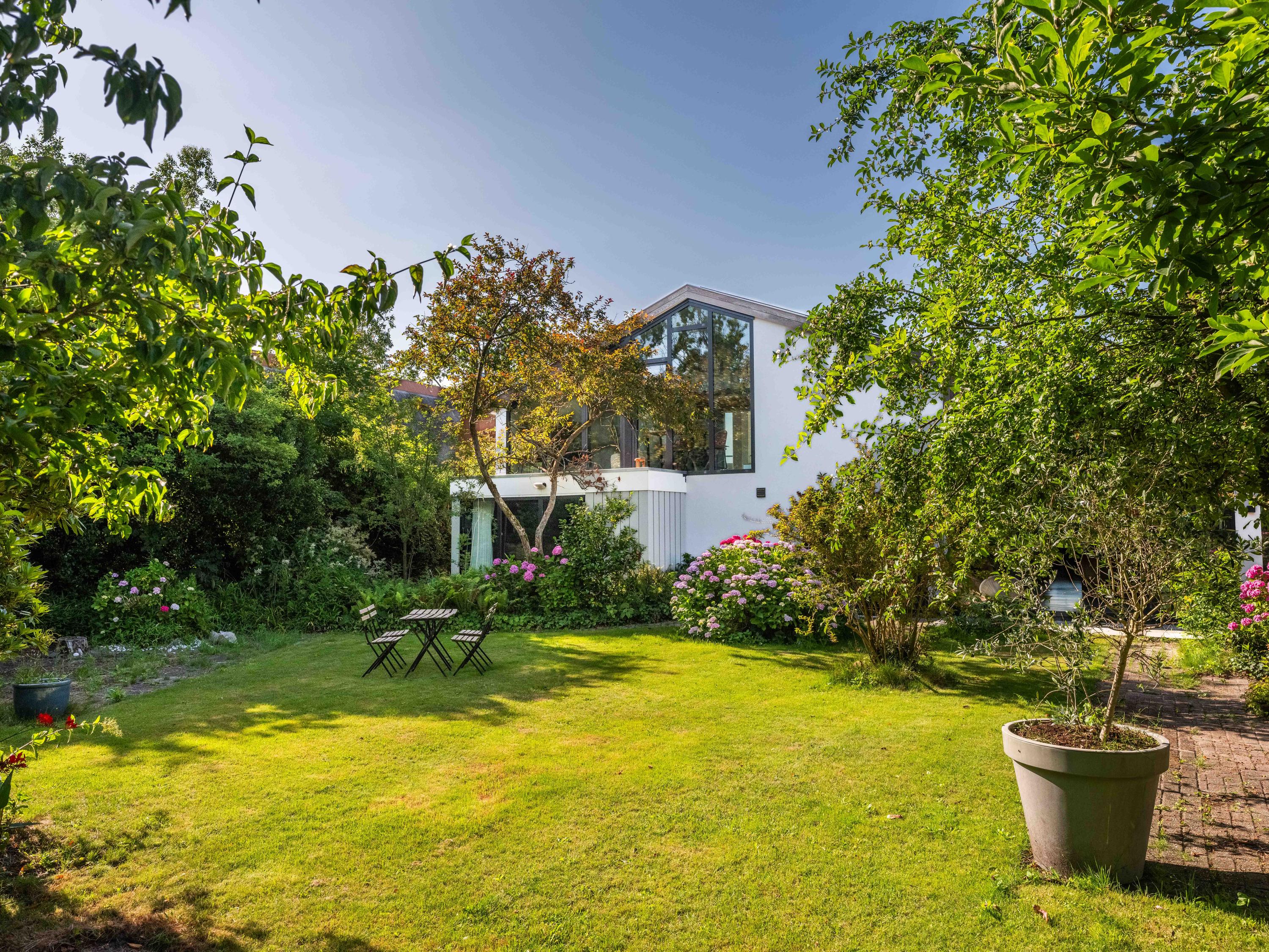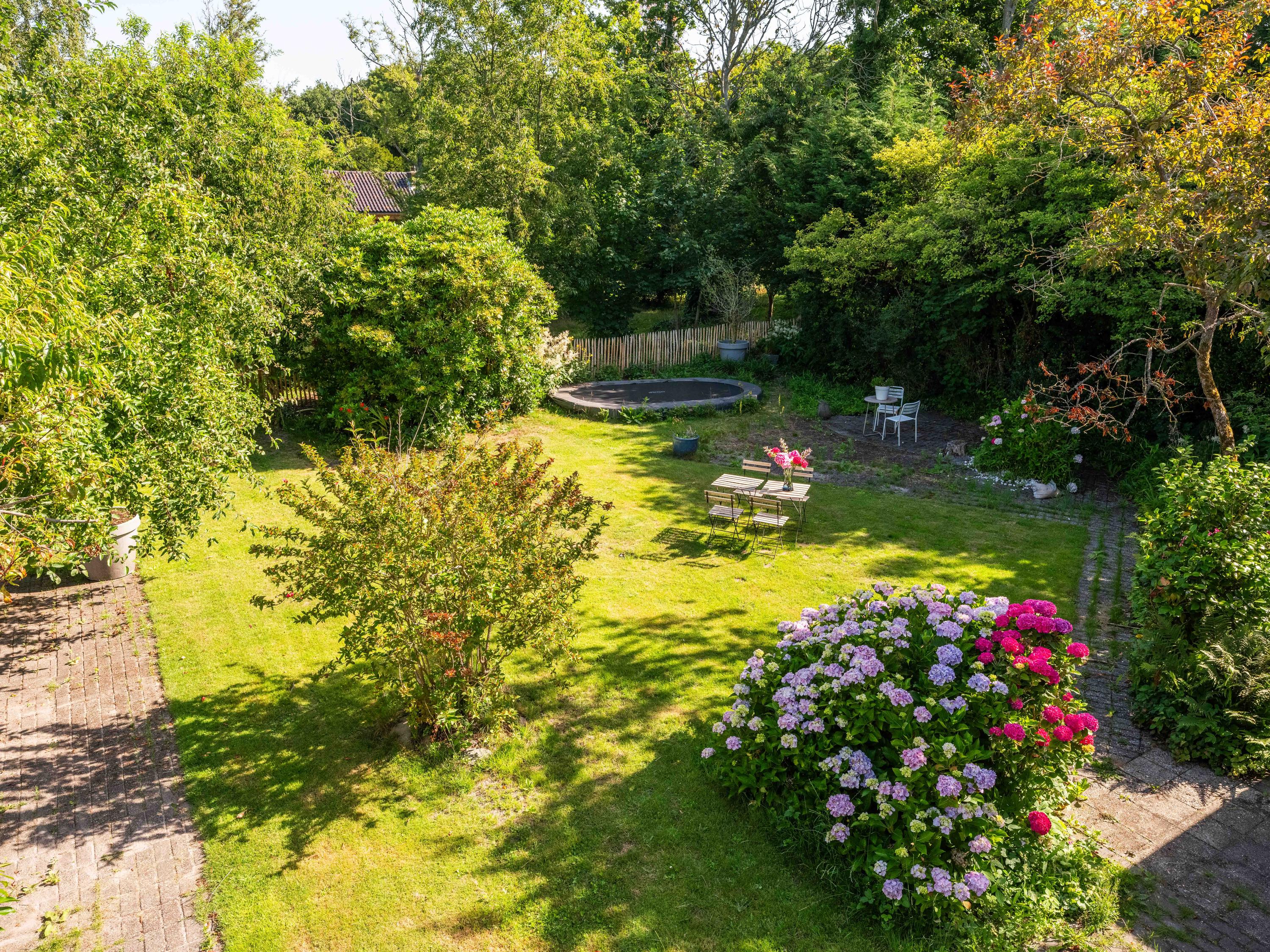 De rondom aangelegde tuin biedt volop privacy, zon én schaduw. Er is een kas voor de tuinliefhebber, nu in gebruik als sfeervolle borrelruimte met buitenhaard; de perfecte plek voor lange zomeravonden met vrienden en familie. Ook is er een grote vrijstaande stenen garage (ca. 50 m²) met bergvliering, geschikt voor twee auto's.