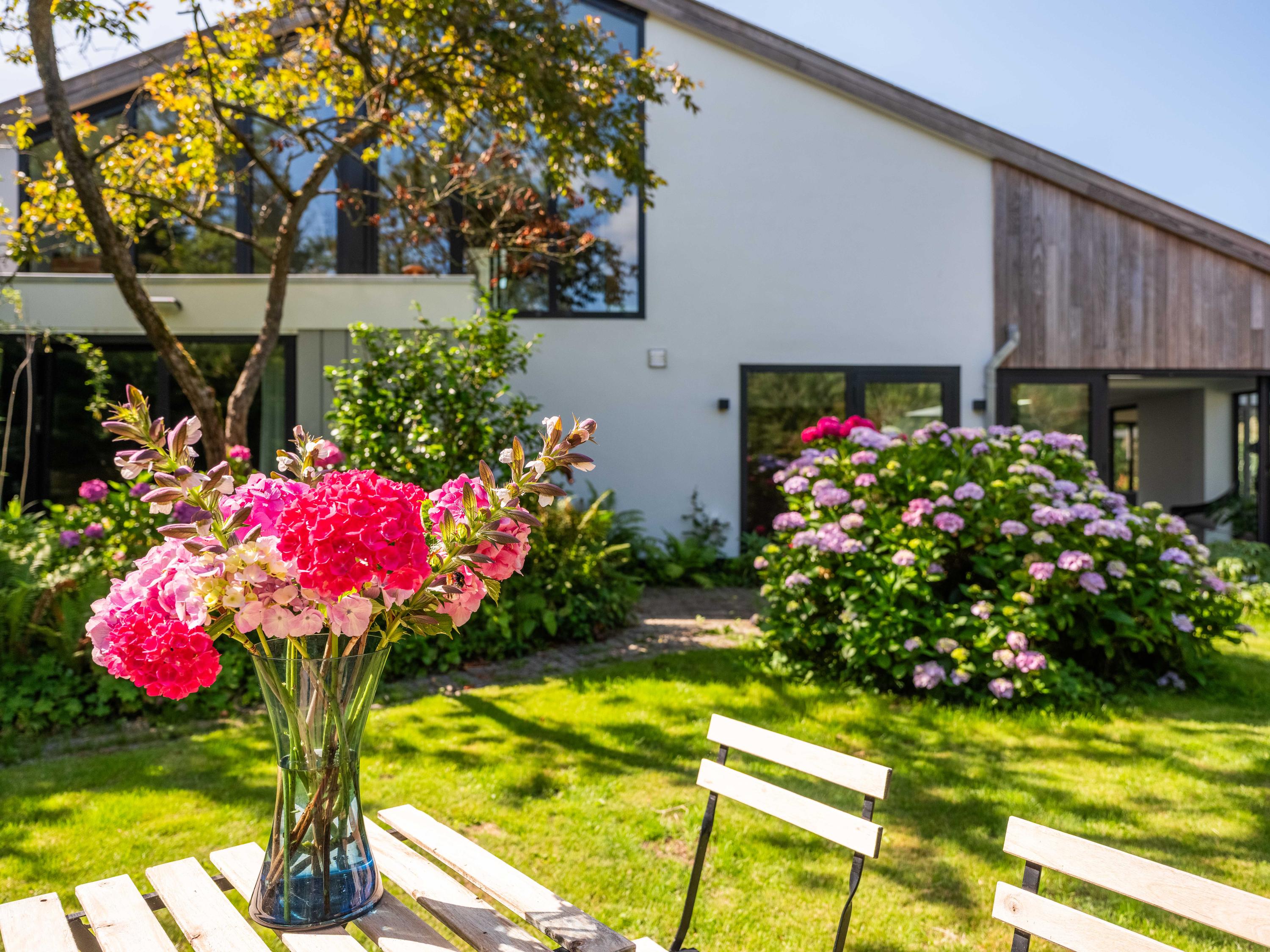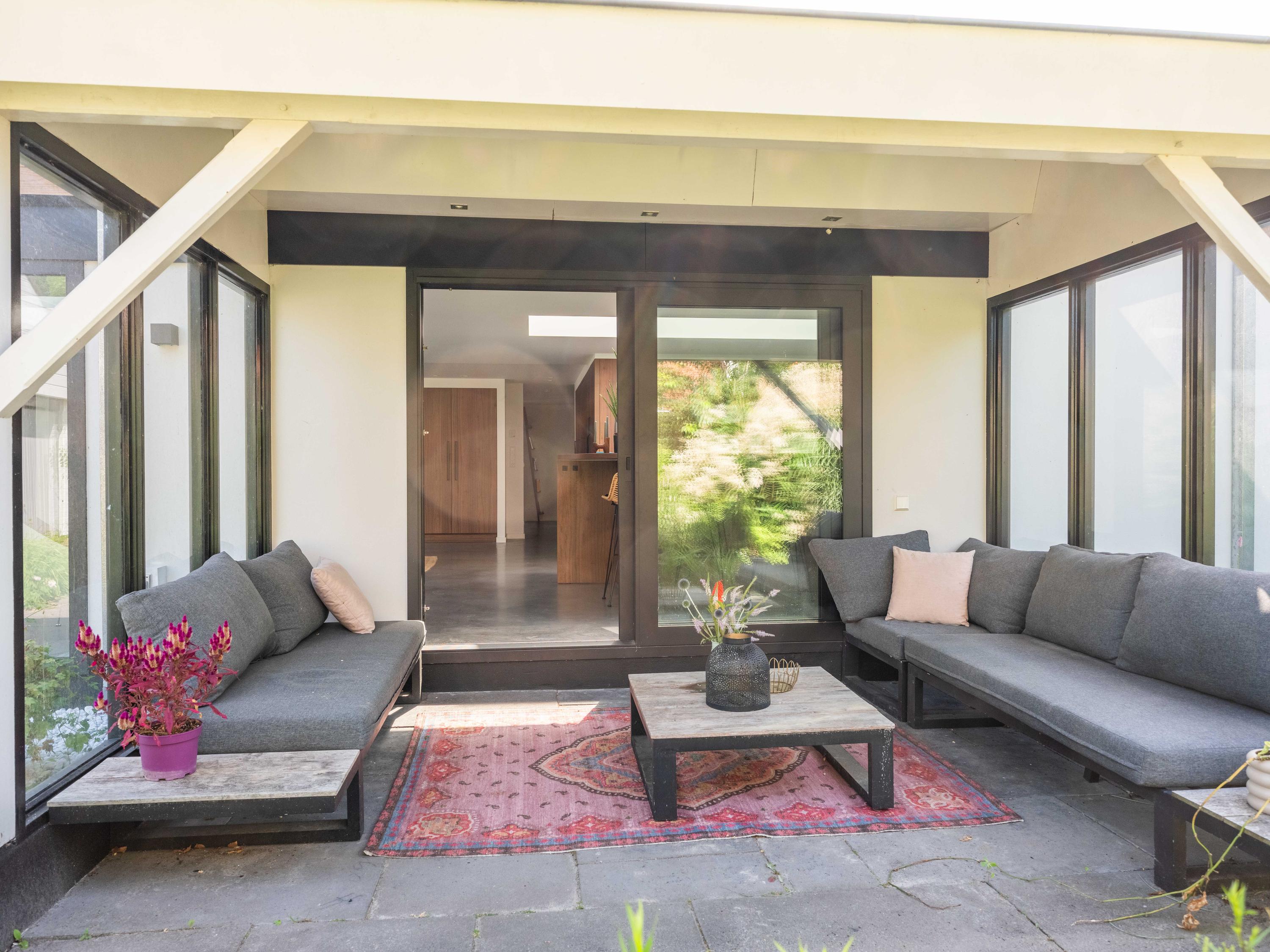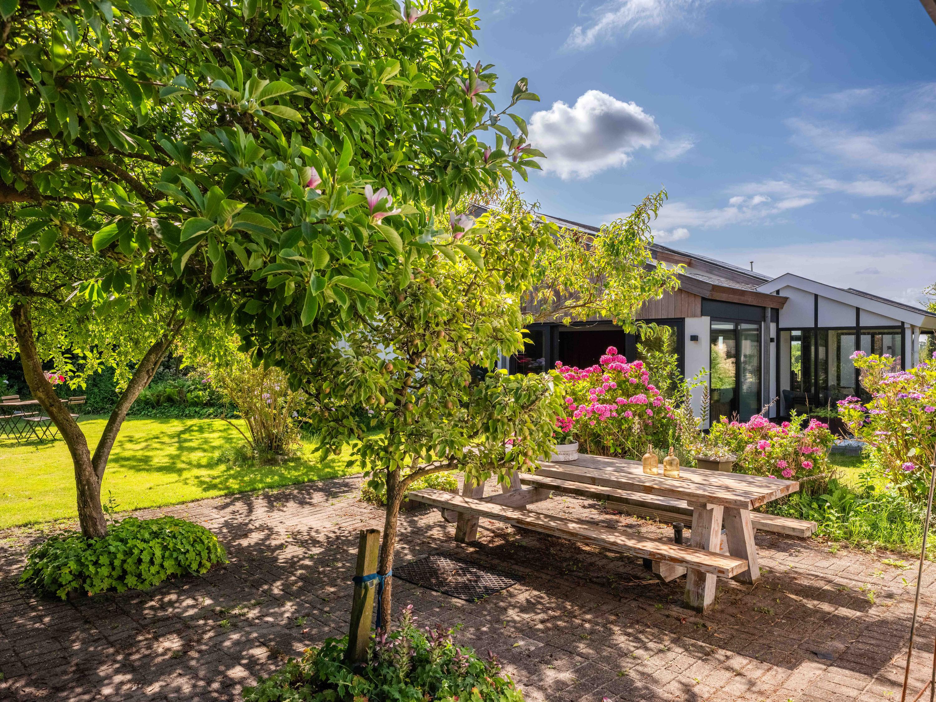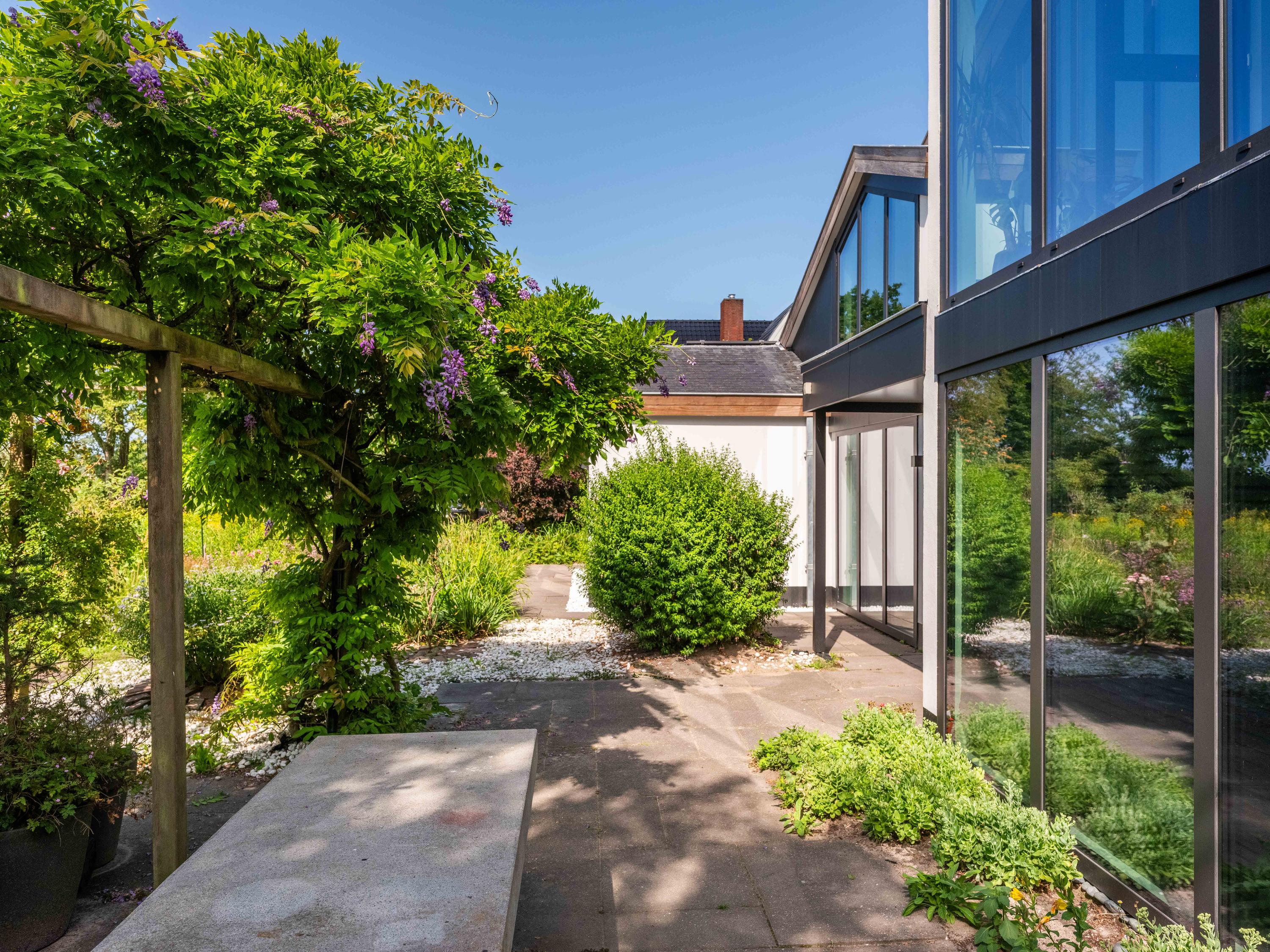 De rondom aangelegde tuin biedt volop privacy, zon én schaduw. Er is een kas voor de tuinliefhebber, nu in gebruik als sfeervolle borrelruimte met buitenhaard; de perfecte plek voor lange zomeravonden met vrienden en familie. Ook is er een grote vrijstaande stenen garage (ca. 50 m²) met bergvliering, geschikt voor twee auto's.