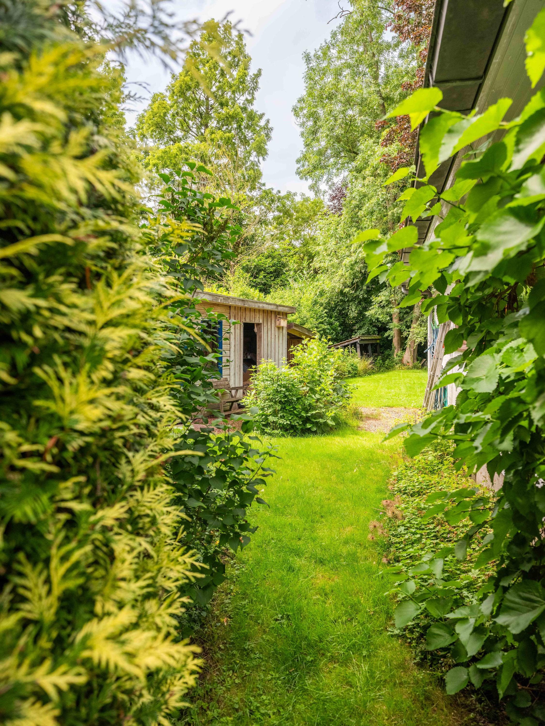 De woning biedt extra's zoals een grote aangebouwde berging/bijkeuken met o.a. de wasmachineaansluiting en een dubbele garage. Verder is er in de weelderige tuin nog een houten berging voor extra opbergruimte. Op de oprit kunnen met gemak meerdere auto's worden geparkeerd.