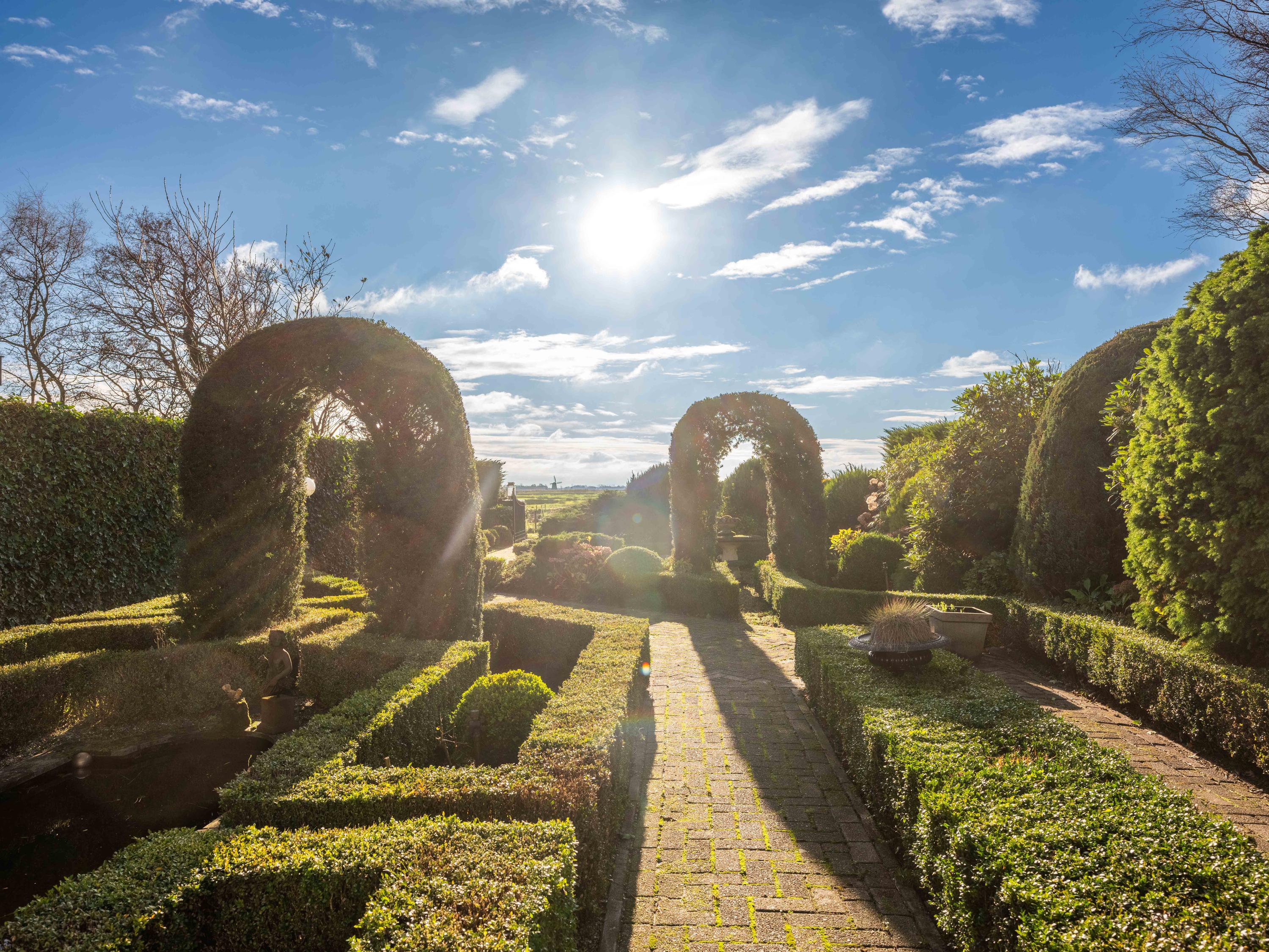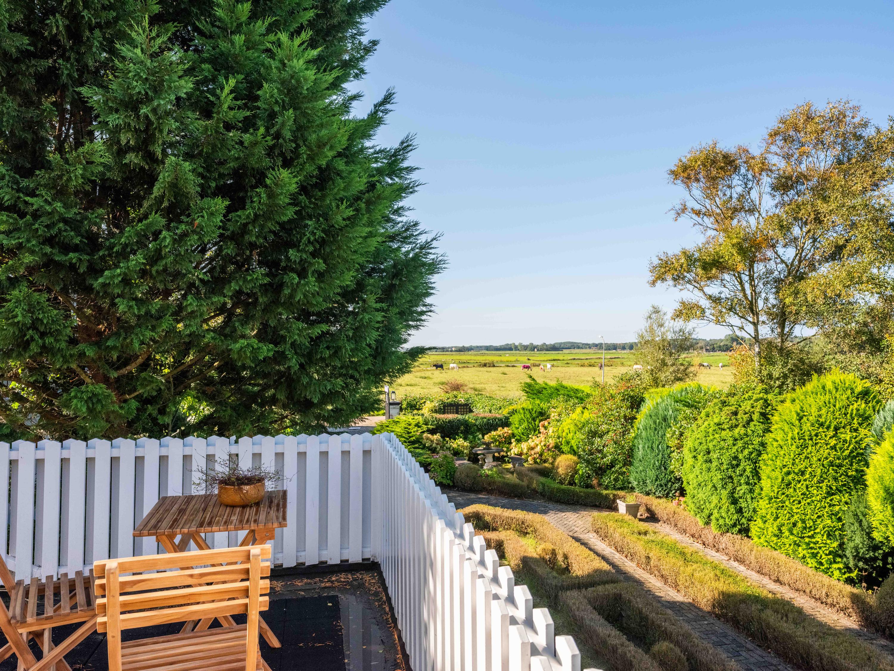 Doordat de woning helemaal achter op het perceel staat is de voortuin zeer royaal te noemen en biedt deze verassend veel privacy. We vinden er een heerlijk terras gelegen op het zuid/westen, waardoor er in de zomermaanden tot laat van de zon en de zonsondergang genoten kan worden. Voor op het perceel is parkeergelegenheid voor meerdere auto's en het geheel wordt afgesloten met een elektrische poort.