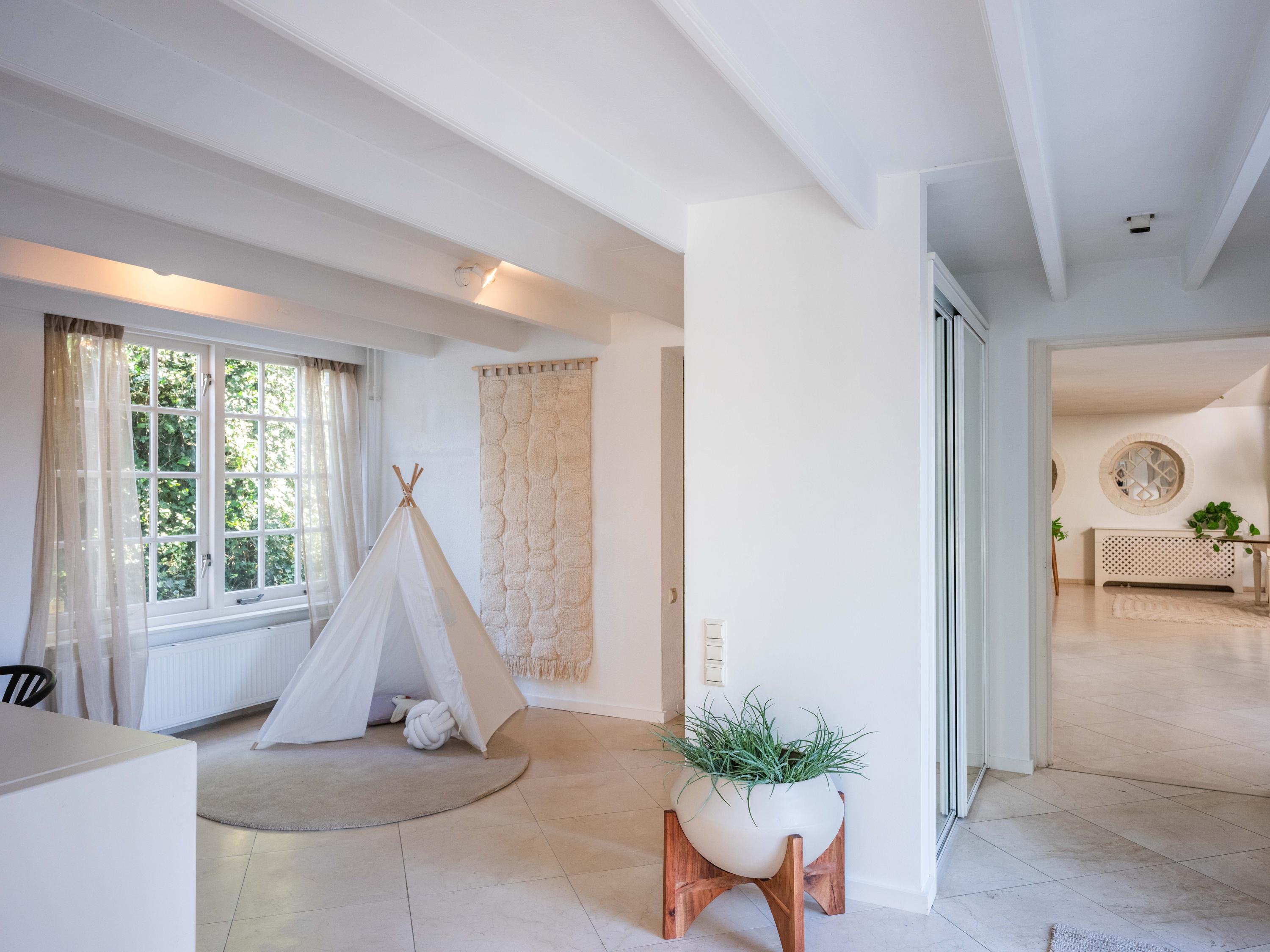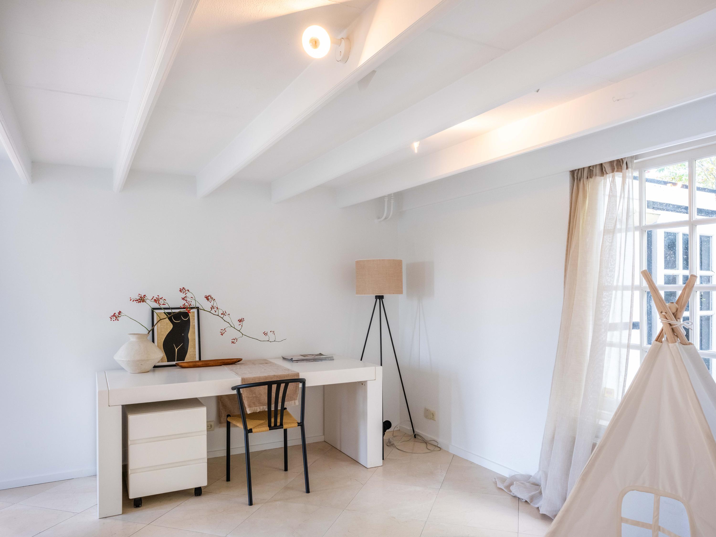 De royale living heeft centraal in de ruimte een gezellige gashaard (voorheen open haard). De ruimte is sfeervol met veel authentieke details: de houten balken in het zicht, een hoog plafond tot aan de nok en ronde glas-in-lood ramen. Links achterin vinden we de open keuken met inbouwapparatuur. Vanuit de keuken komen we in de bijkeuken met de aansluiting voor de wasmachine en wasdroger, de CV-opstelling en een deur naar buiten.