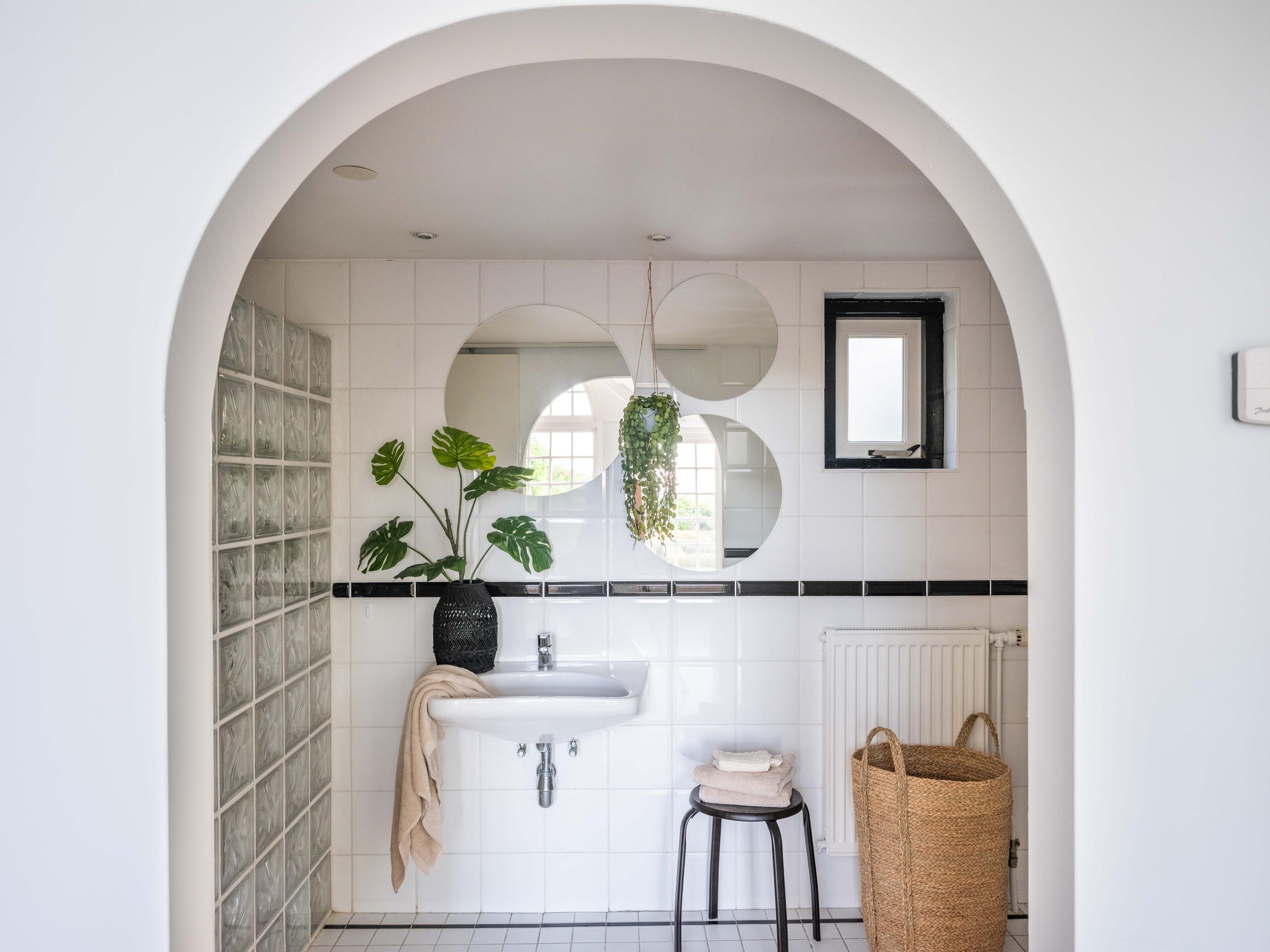 De diepe voortuin en tevens hoofdtuin, brengt ons naar de entree van de woning. Bij binnenkomst betreden we de hal met direct links een slaapkamer met eigen badkamer (gelijkvloers wonen is hier dus mogelijk). De badkamer is uitgerust met een inloopdouche, wastafel, toilet en urinoir. Terug in de hal vinden we achter een muurtje een ruimte die gebruikt kan worden als werk- of speelruimte of met een kleine aanpassing gewijzigd kan worden als slaapkamer. Aansluitend aan deze ruimte zijn het toilet en een extra douchecabine gesitueerd.