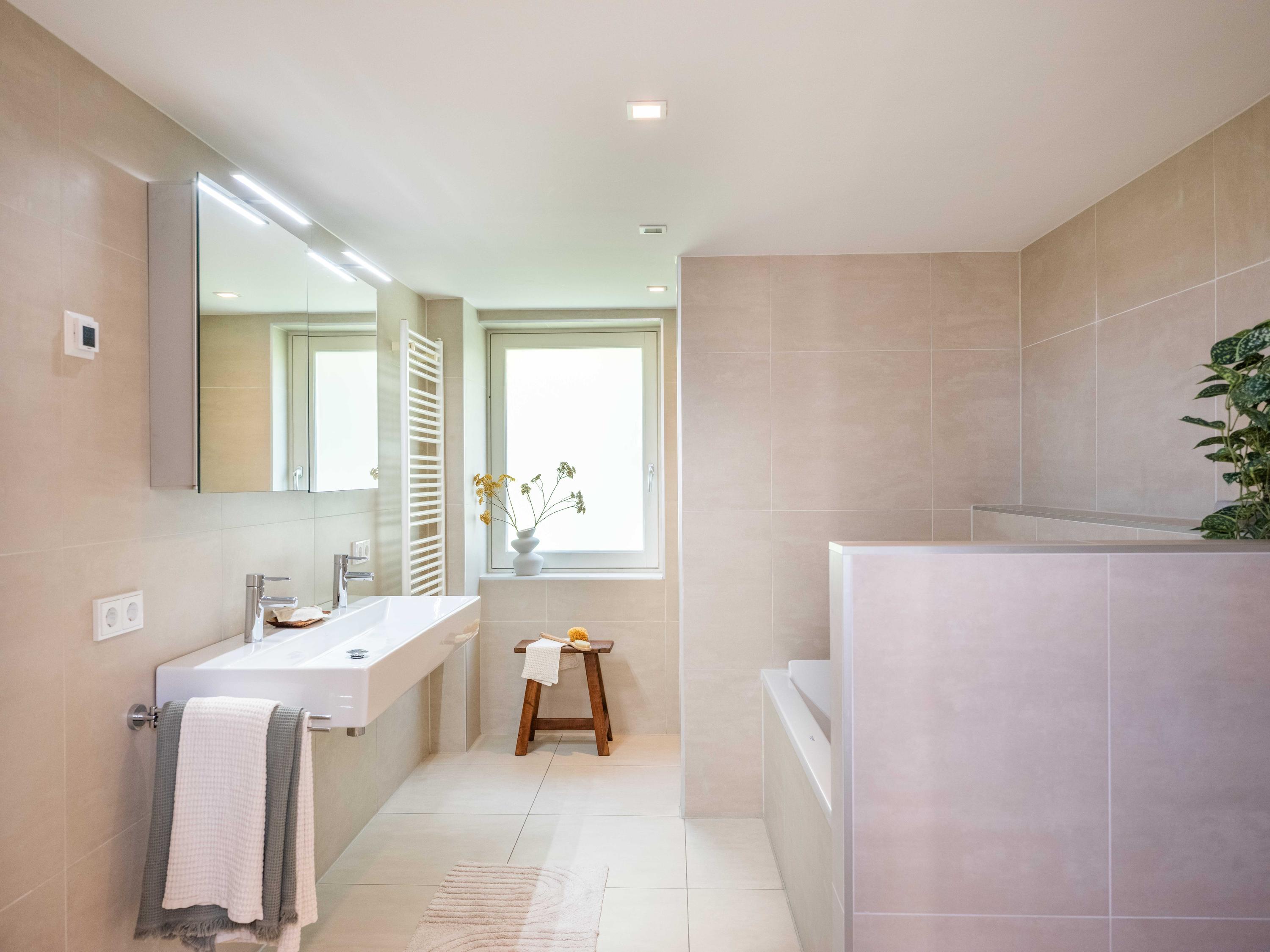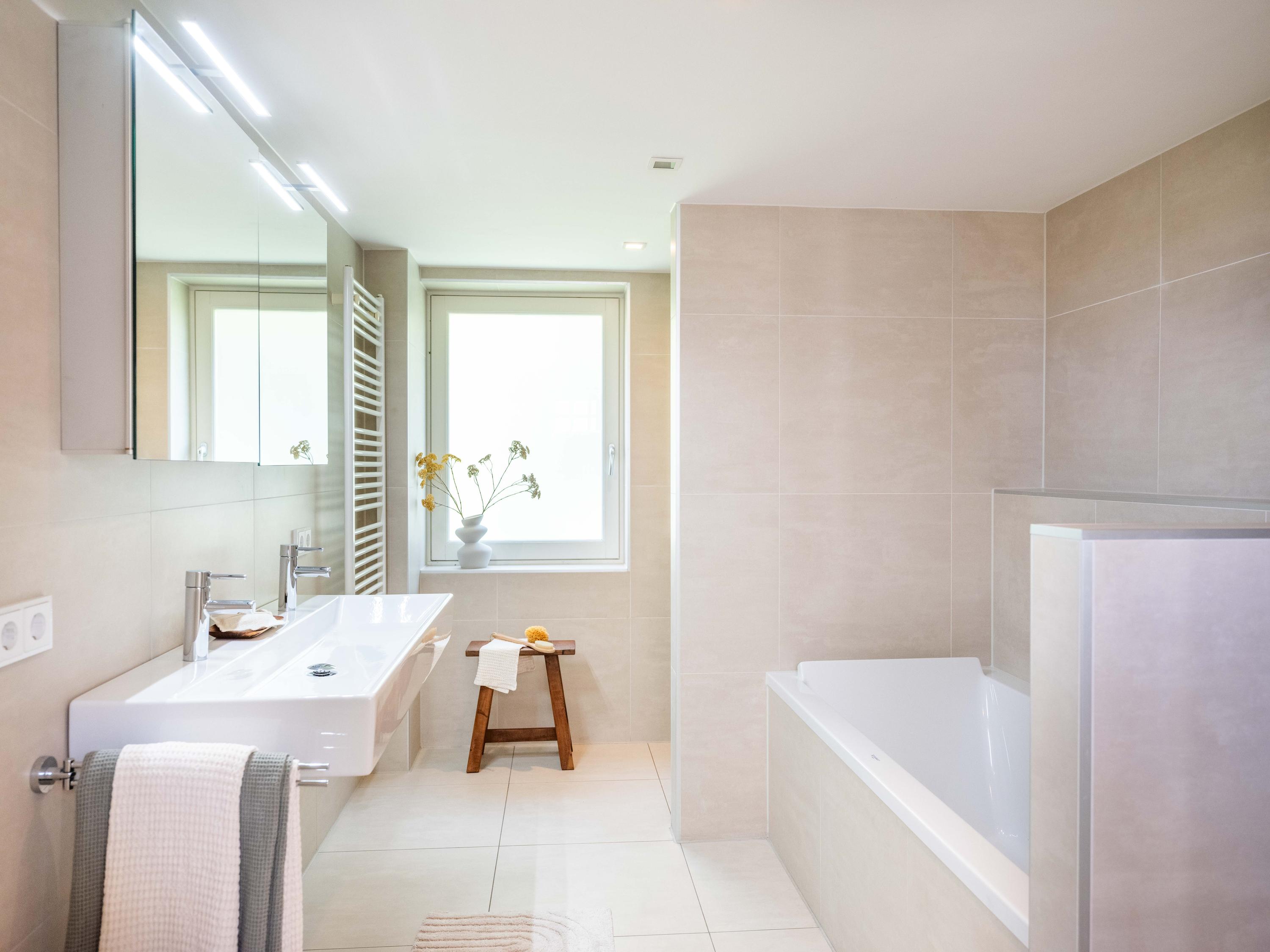 Op de eerste verdieping lopen we over de vide naar de slaapkamer. Deze kamer heeft vaste kasten en biedt toegang tot een ruim dakterras. Vanaf het terras weer een geweldig uitzicht. De badkamer op deze verdieping is verrassend ruim en modern (2018). Deze badkamer is voorzien van een ligbad, inloopdouche, dubbele wastafel en toilet.