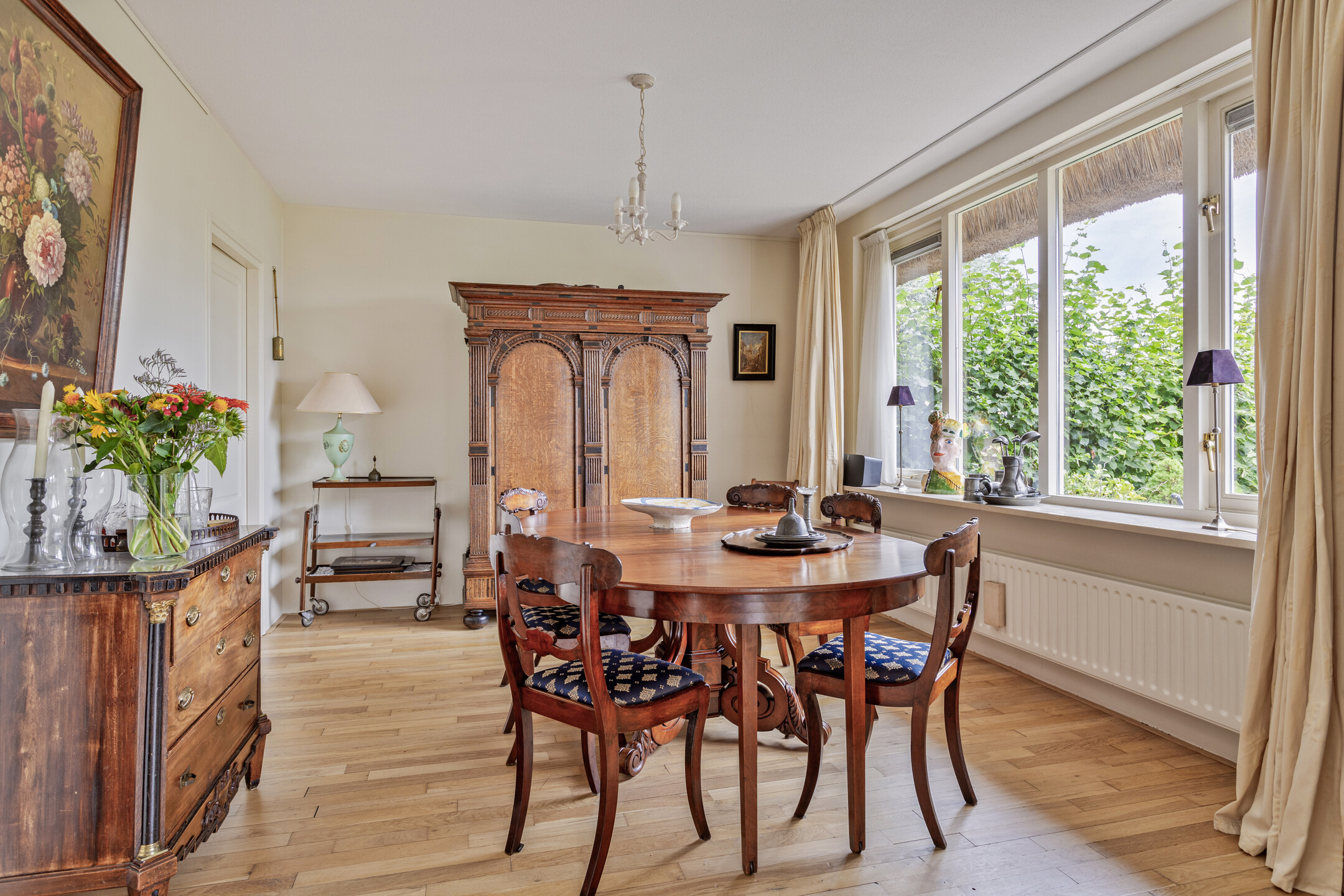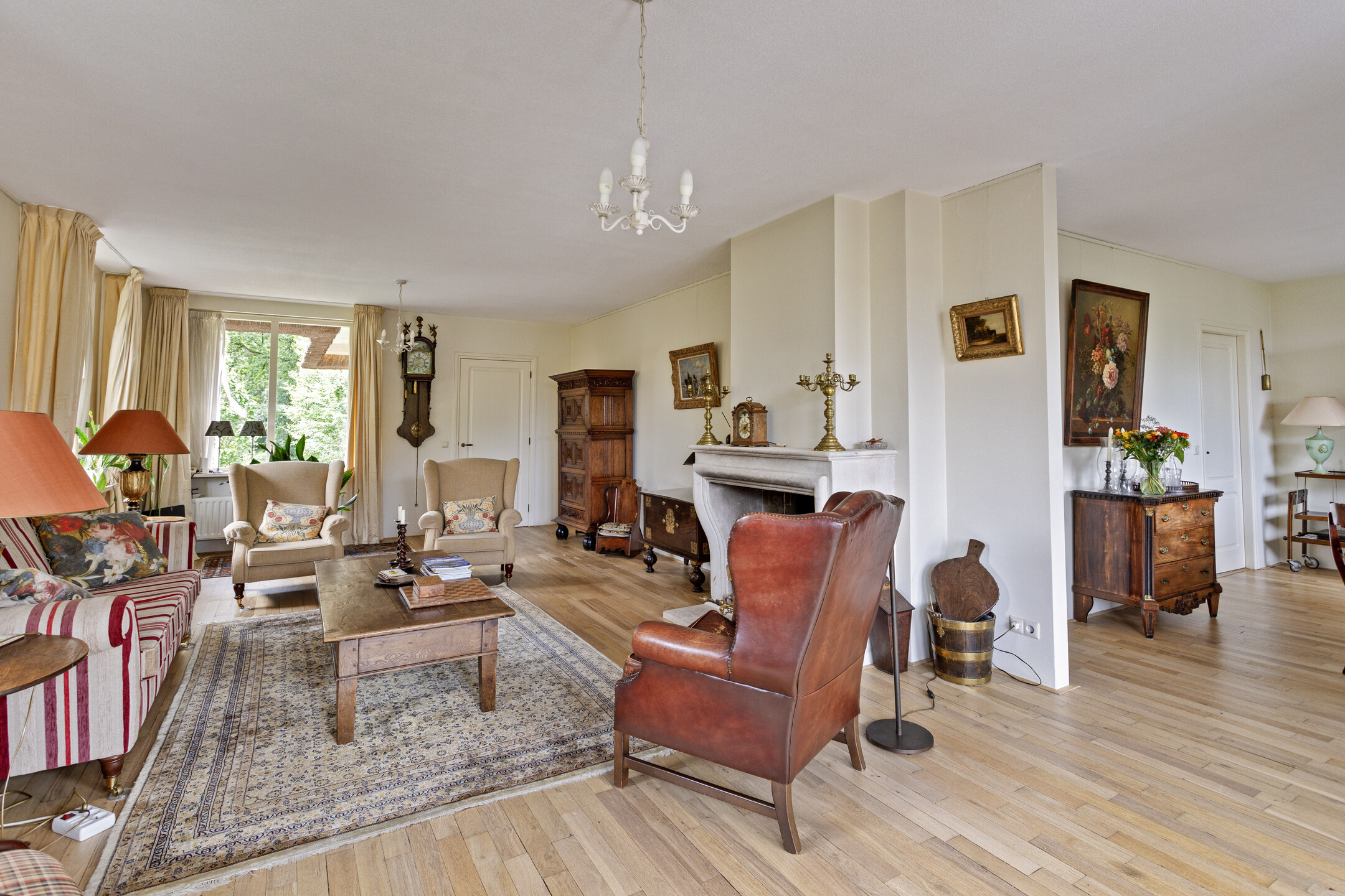 ruime living met zit- en eetkamer (ca. 55 m² incl. eetkamer), voorzien van een marmeren schouwpartij met een open haard, wandafwerking stucwerk, massief eiken houtenvloer (vm. kazernevloer), plafond afgewerkt met spuitwerk, 2-tal tuindeuren naar het terras/tuin;