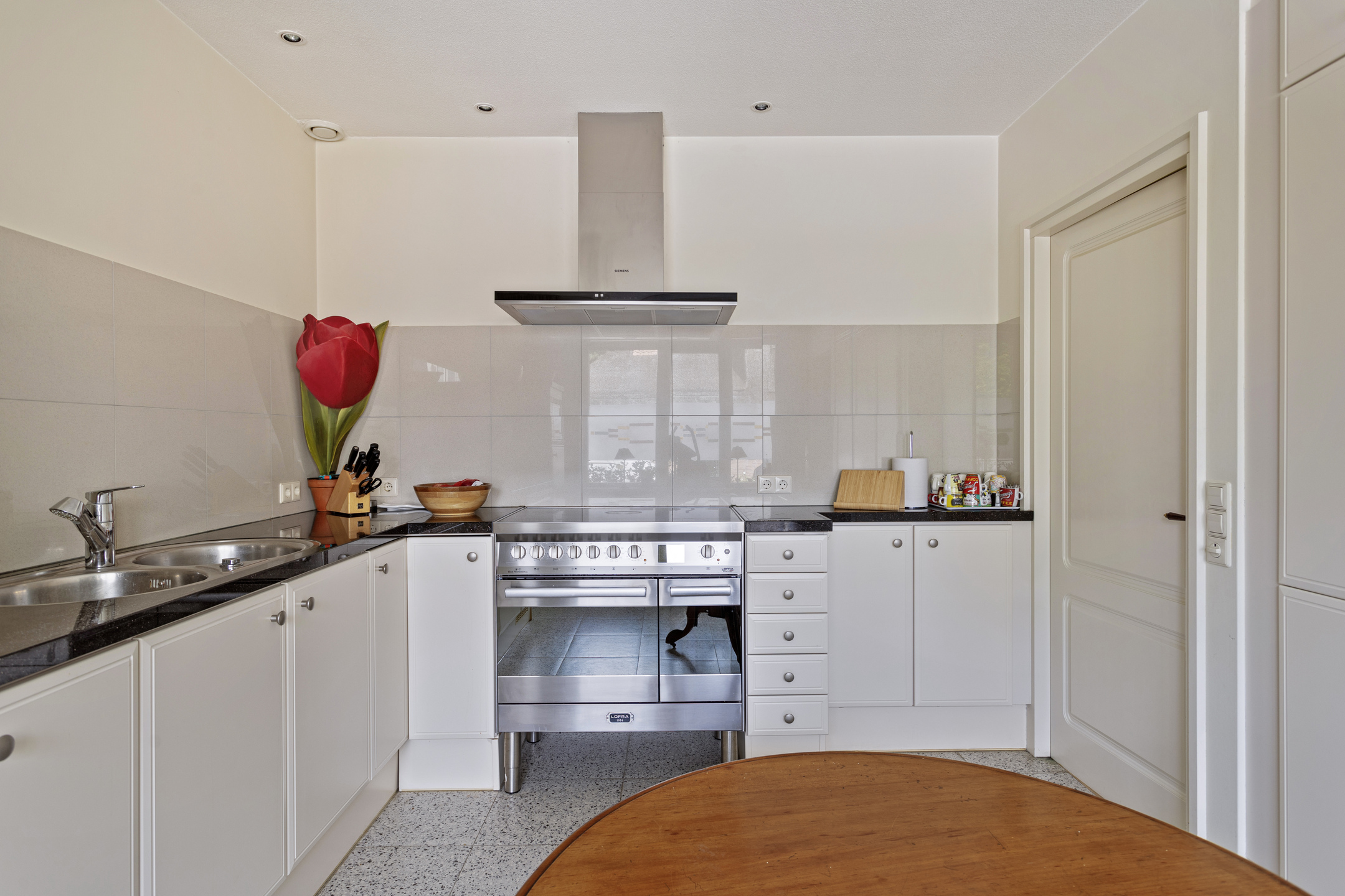 woonkeuken waarin geplaatst een in hoek opgestelde inbouwkeuken, voorzien van een granieten aanrechtblad met een dubbele spoelbak, RVS-fornuis vv. 5-pits inductiekookplaat met 2-tal ovens, inbouw -koeler, -magnetron, -vaatwasser en een afzuigkap, wandafwerking tegels en stucwerk, tegelvloer, plafond afgewerkt met spuitwerk vv. inbouwspots;
