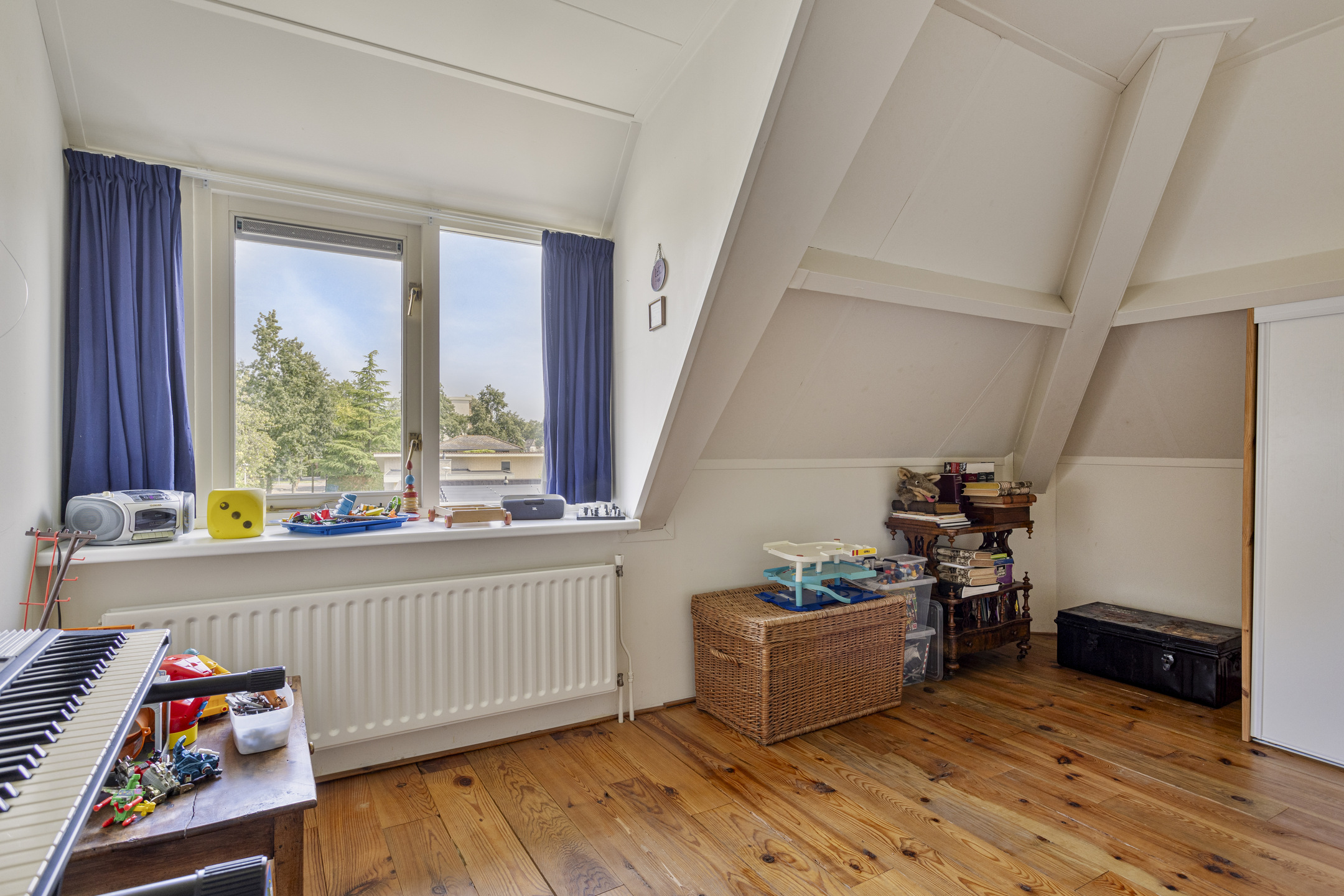 slaapkamer rechtsachter, met een inbouwkast en een dakkapel, wandafwerking structuurverf, grenen planken vloer, plafond afgewerkt met gipsplaten;
