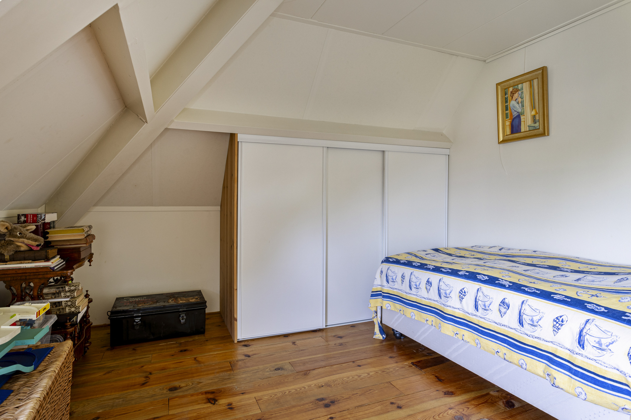 slaapkamer linksachter, met een inbouwkast en een dakkapel, wandafwerking structuurverf, grenen planken vloer, plafond afgewerkt met gipsplaten;