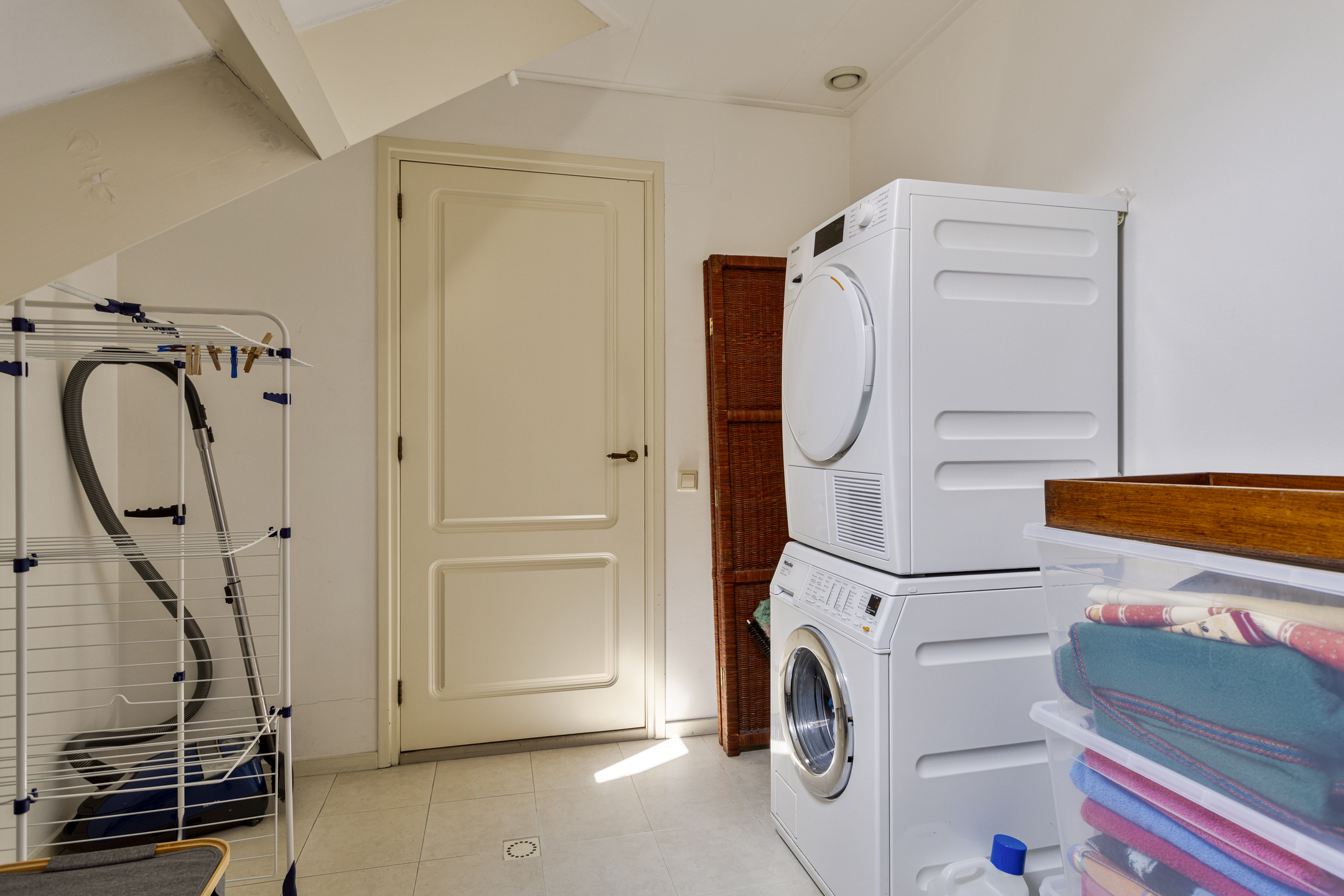 waskamer rechtsvoor, met wasmachine-/drogeraansluiting, wandafwerking structuurverf, tegelvloer, dakbeschot in het zicht;