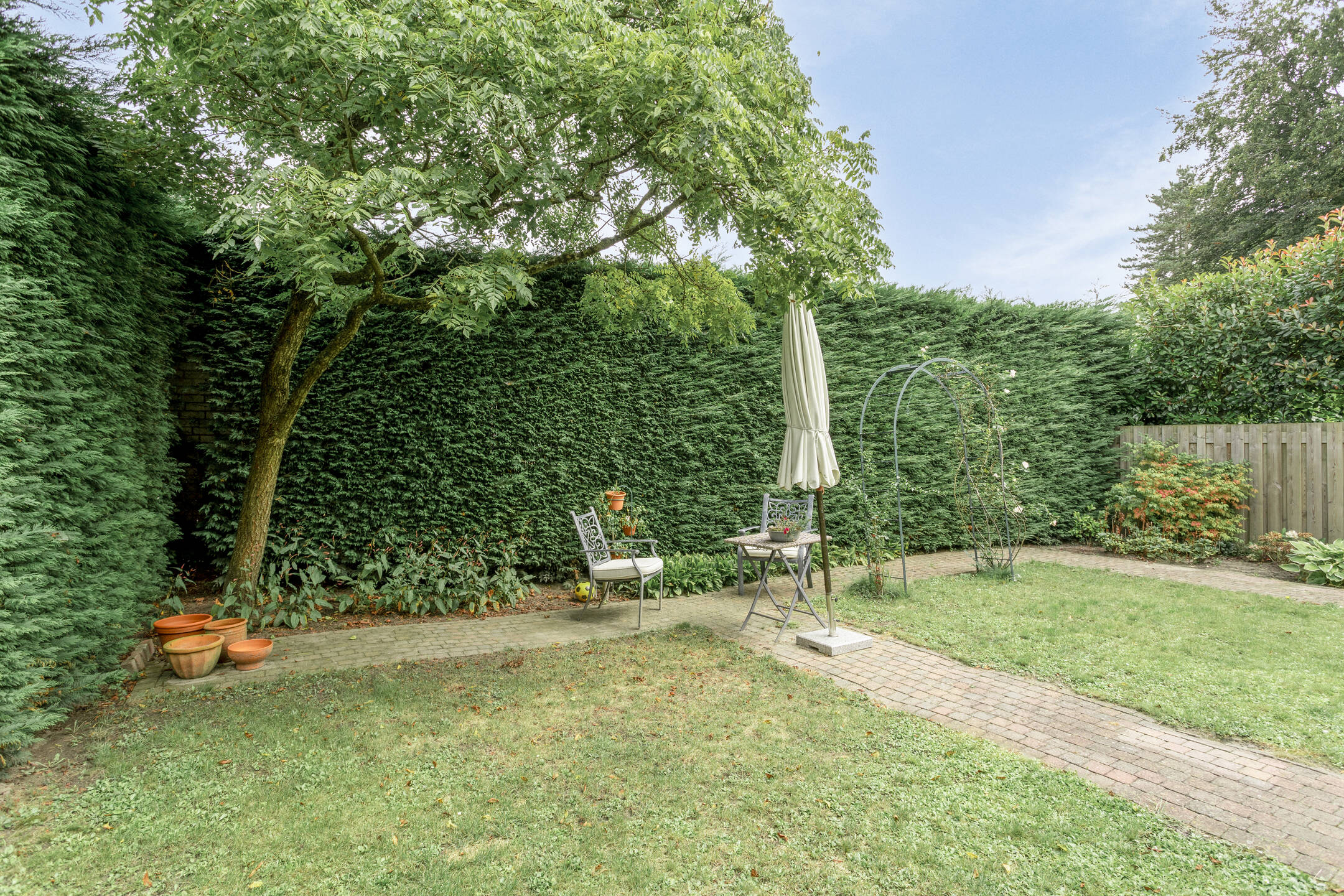 De tuin is beschut gelegen waarbij direct aansluitend achter de woonkamer een terras aanwezig is voor de gezellige uren. Via een trap bereikt u het groene deel van de tuin welke volledig omheind is en waar vandaan u de woning rondom kan bereiken. Het geheel is groen omheind en aan de voorzijde voorzien van een elektrische poort en deurbelinstallatie.