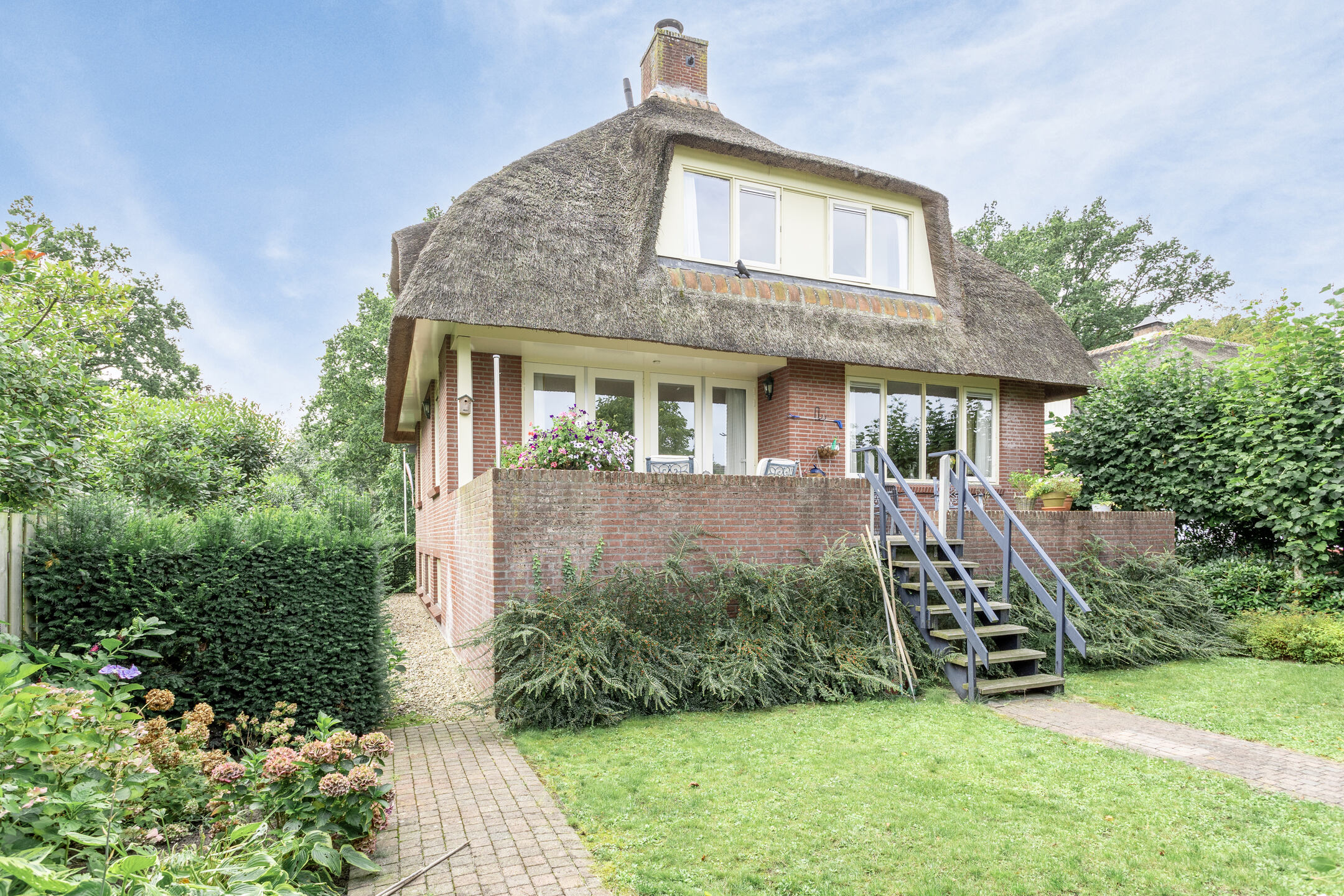 Traditioneel gebouwd in spouw, opgetrokken in metselbaksteen, begane grondvloer, 1e verdiepingsvloer en souterrain uitgevoerd in beton, 2e verdiepingsvloer uitgevoerd in hout, onderschoten kap gedekt met riet.