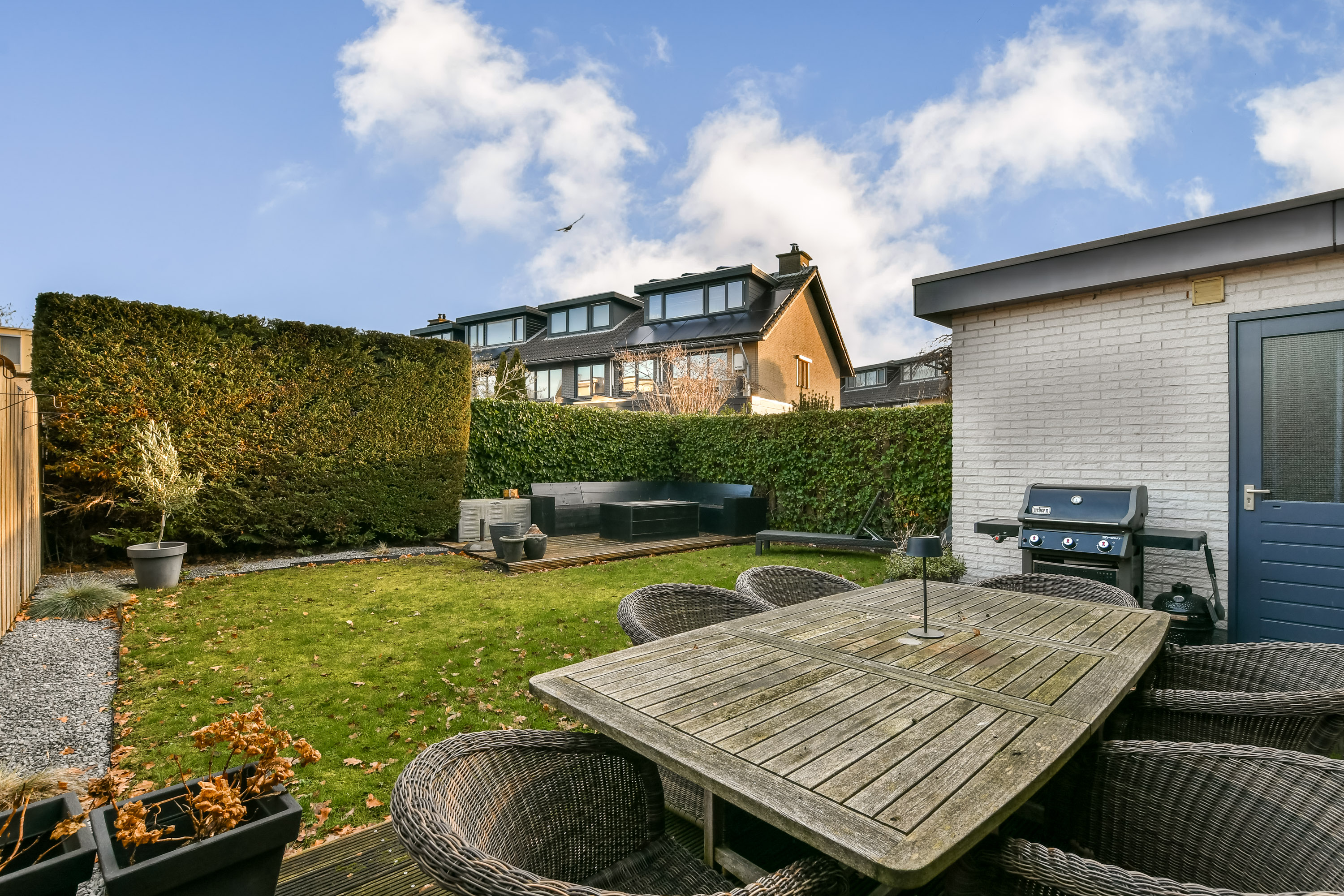 De fraai aangelegde achtertuin is gelegen op het noordoosten. Dankzij de slimme plaatsing van de terrassen kun je hier de hele dag van de zon genieten. De tuin is bereikbaar vanuit zowel de woonkamer als de multifunctionele ruimte en is voorzien van een elektrisch zonnescherm en een heater.