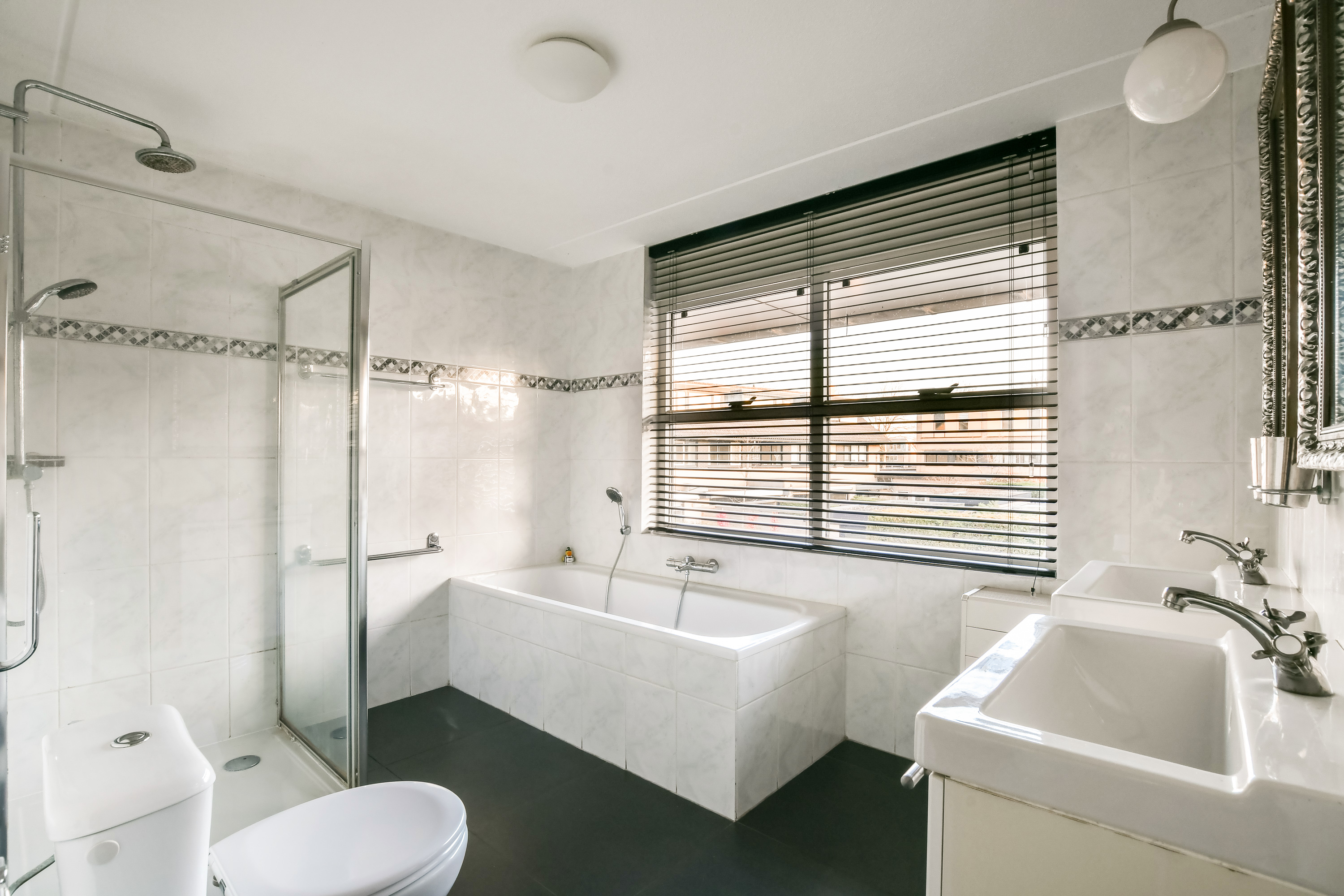 De badkamer is uitgerust met een ligbad, douche, toilet en twee wastafels.
