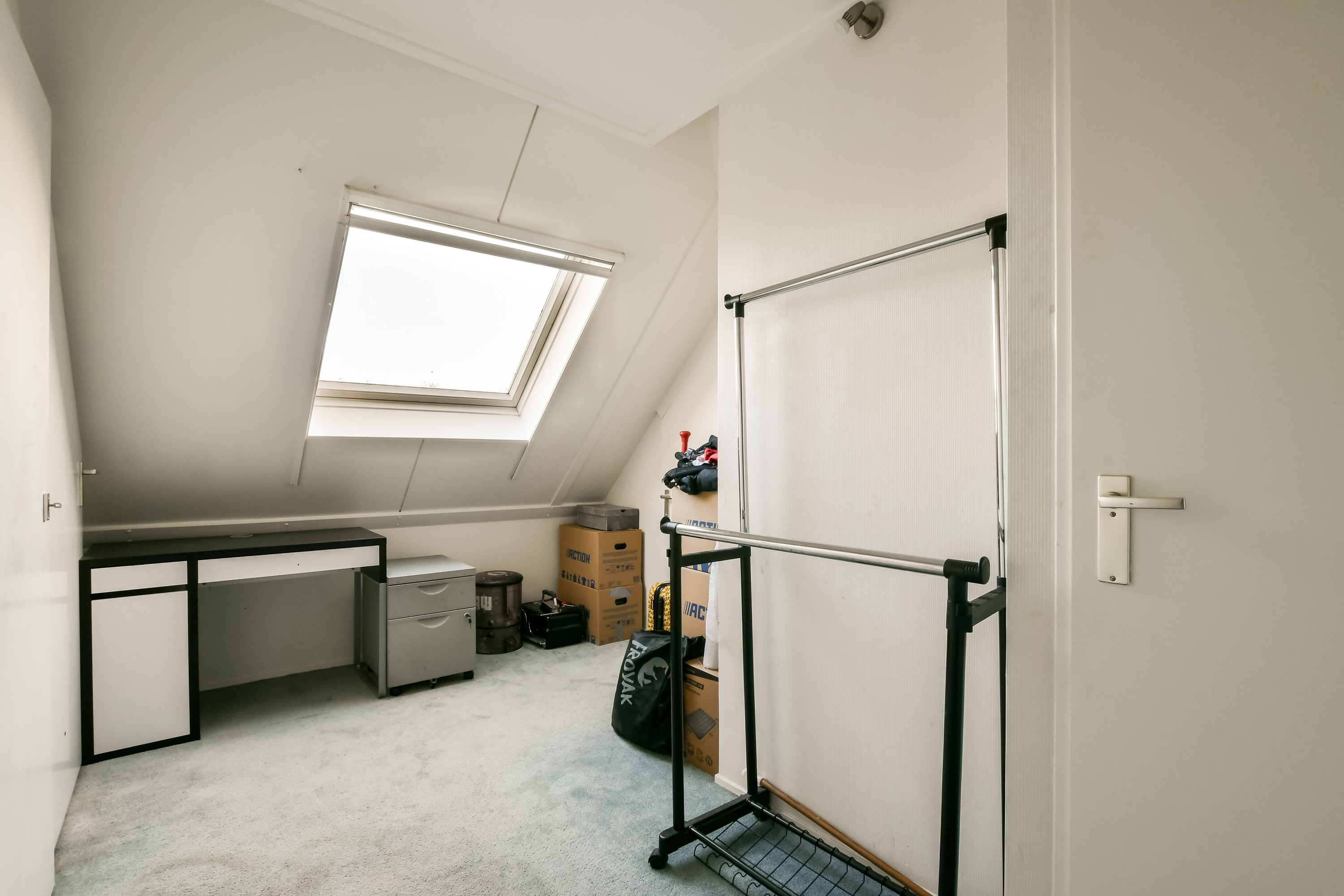 Slaapkamer 5, met aansluitingen voor wasmachine en droger, een Velux dakraam en toegang tot de vliering. Daarnaast biedt deze ruimte de mogelijkheid om een tweede badkamer te realiseren.