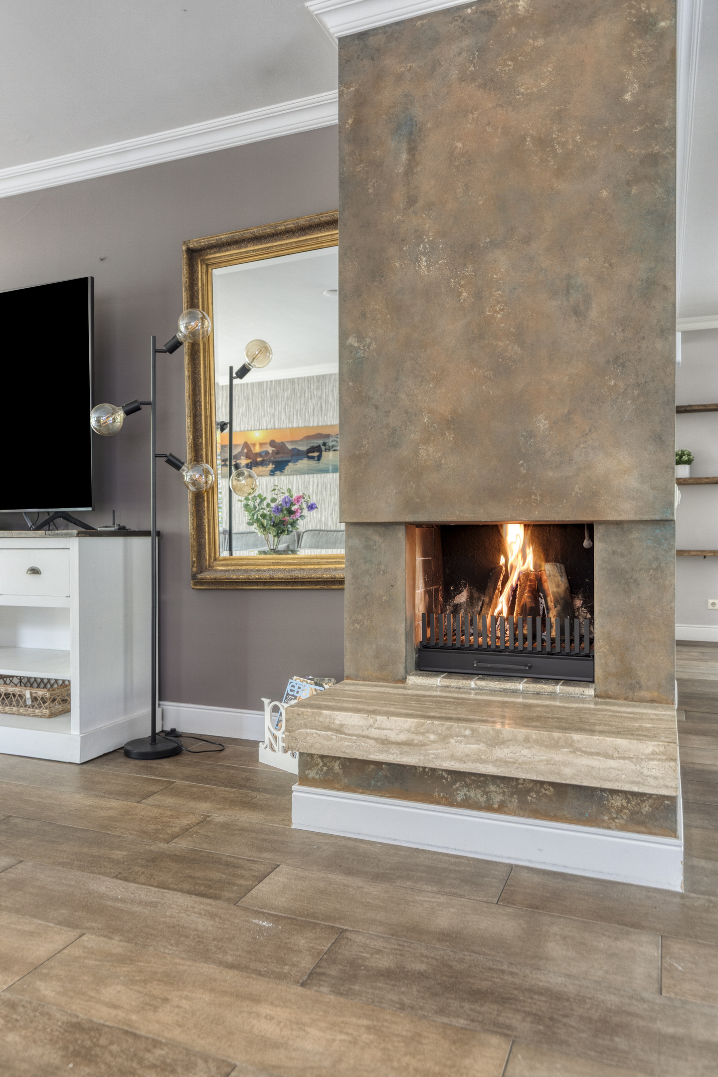 De gehele begane grond inclusief de veranda is voorzien van een houtlook tegelvloer met vloerverwarming.