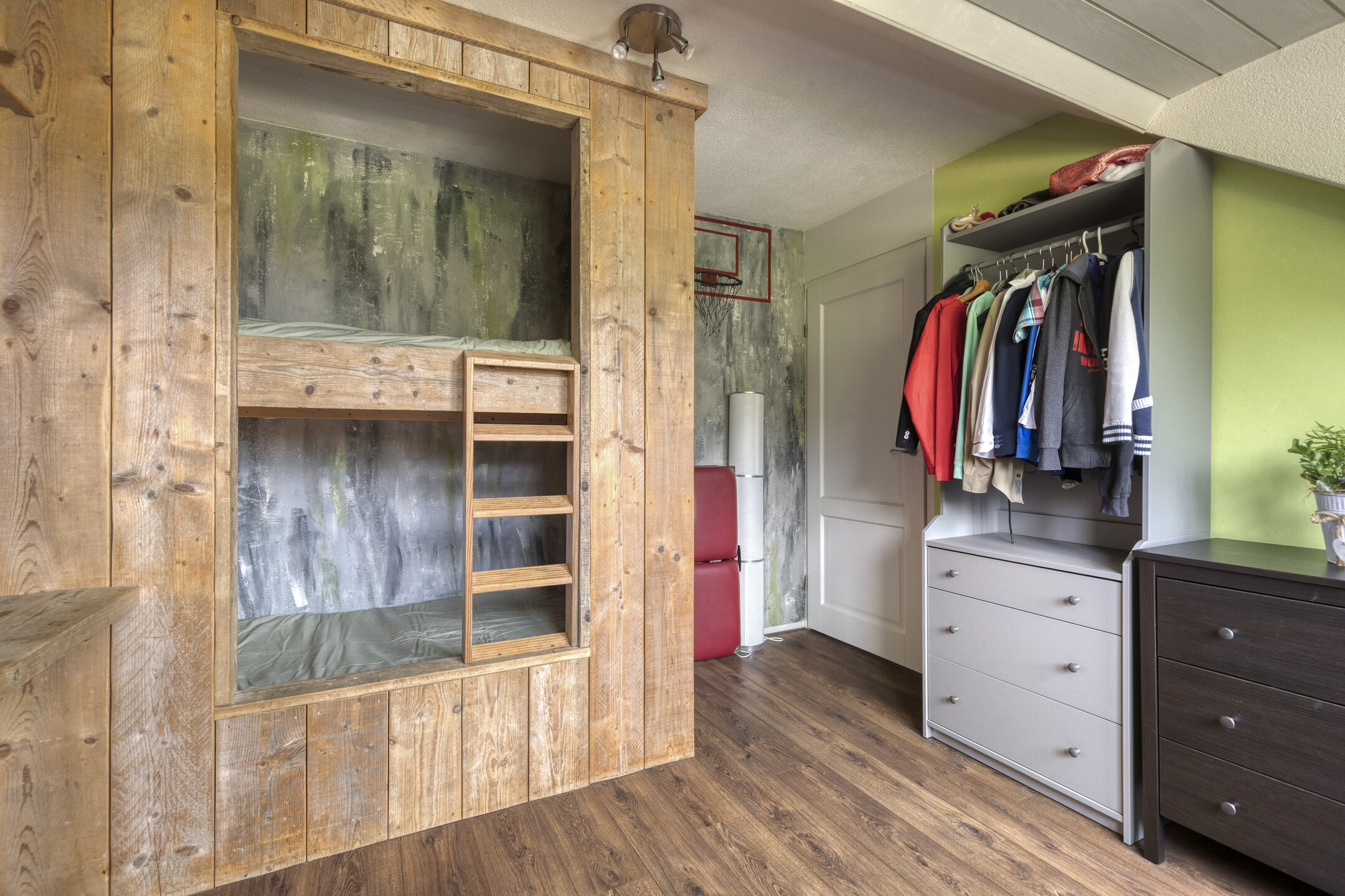 Slaapkamer, deze slaapkamer bevindt zich boven garage en heeft een houten bed-meubel met vaste kast.