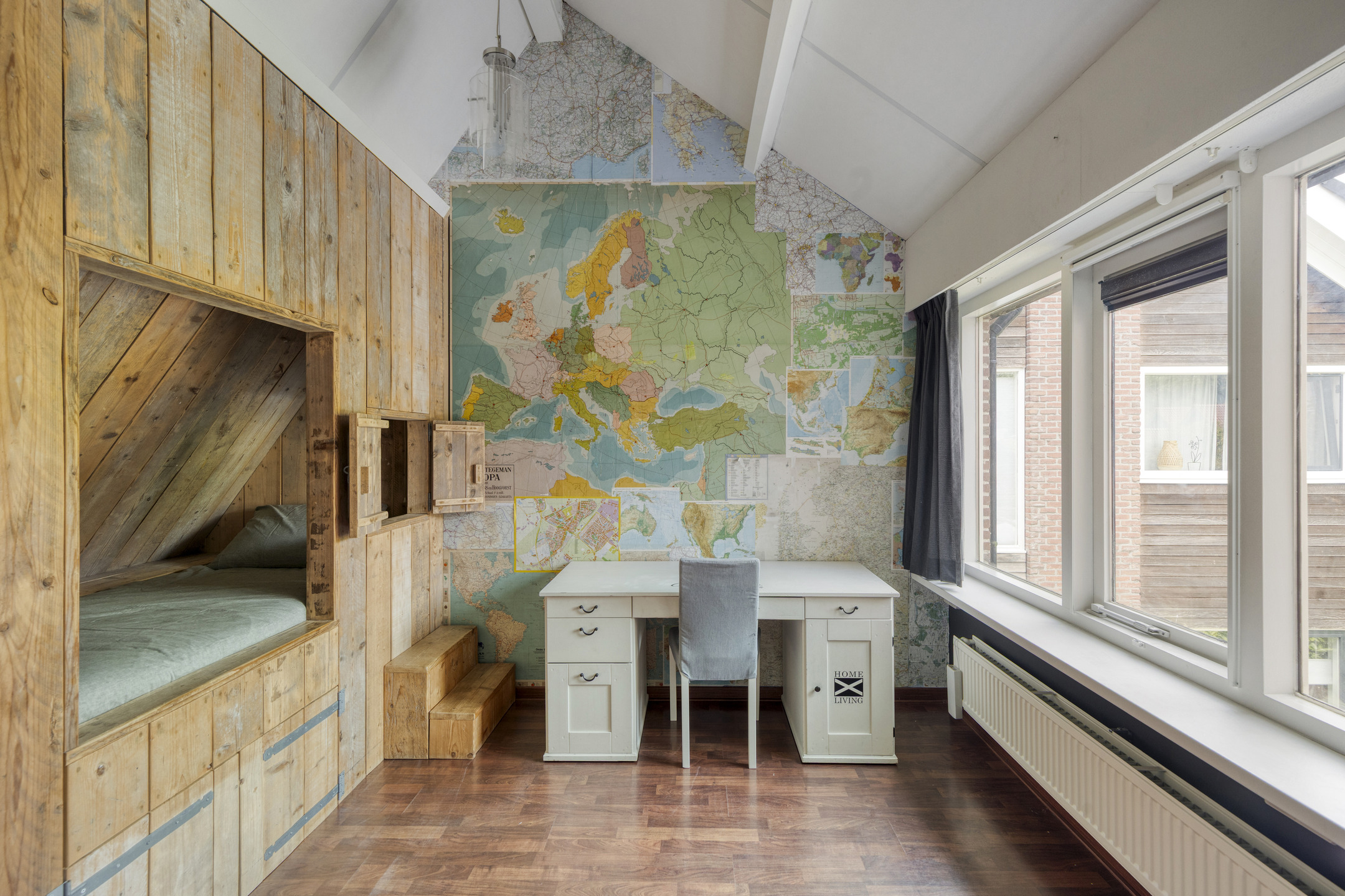 Slaapkamer met dakraam en zijraam en vaste kast. Extra bergruimte is er te vinden achter knieschotten onder het schuine dak.
