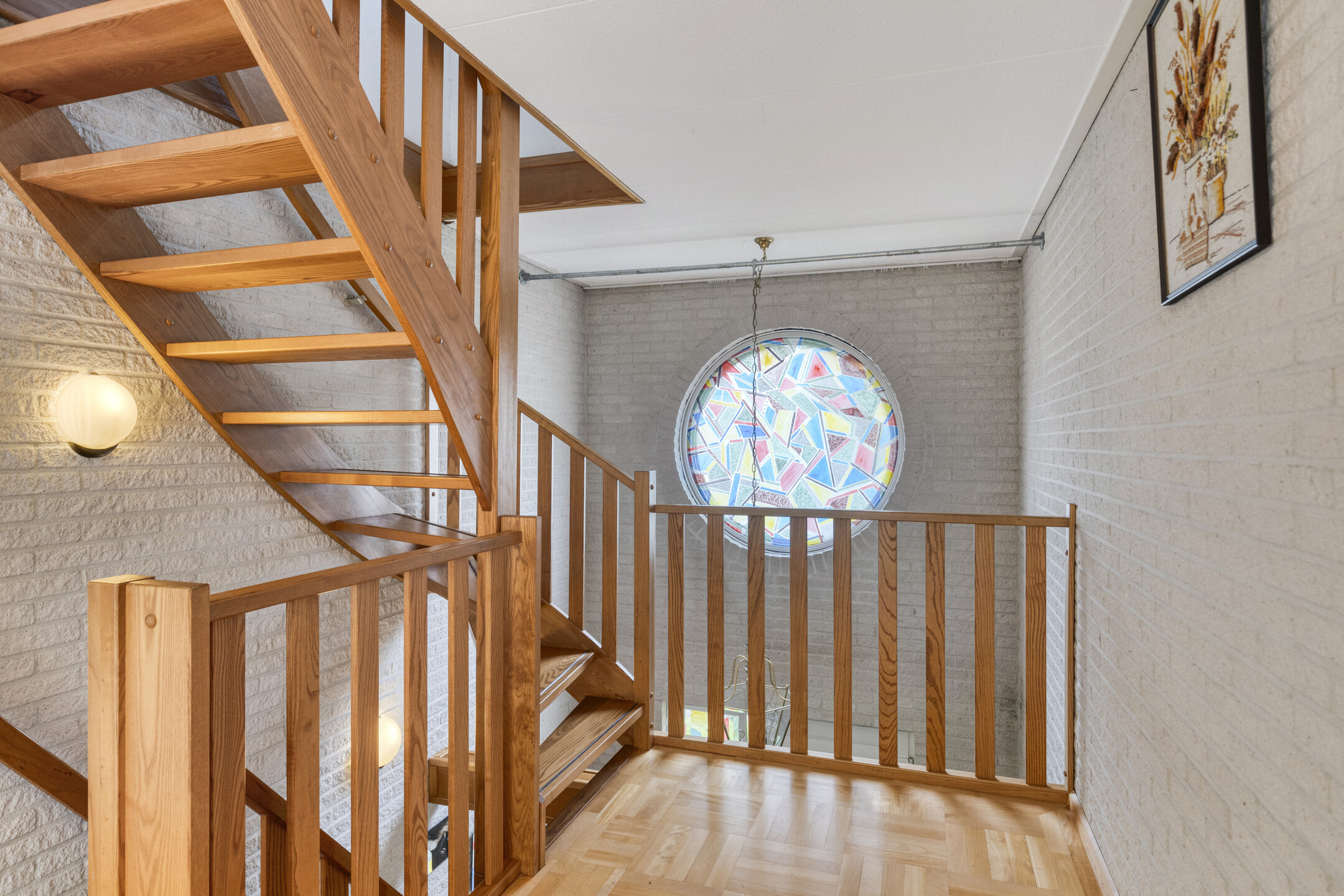 Boven een lichte overloop – het markante ronde raam en het balkon aan de achterzijde laten veel daglicht toe -, die grenst aan vier grote slaapkamers en een badkamer. Op de hele verdieping ligt een fraaie parketvloer.