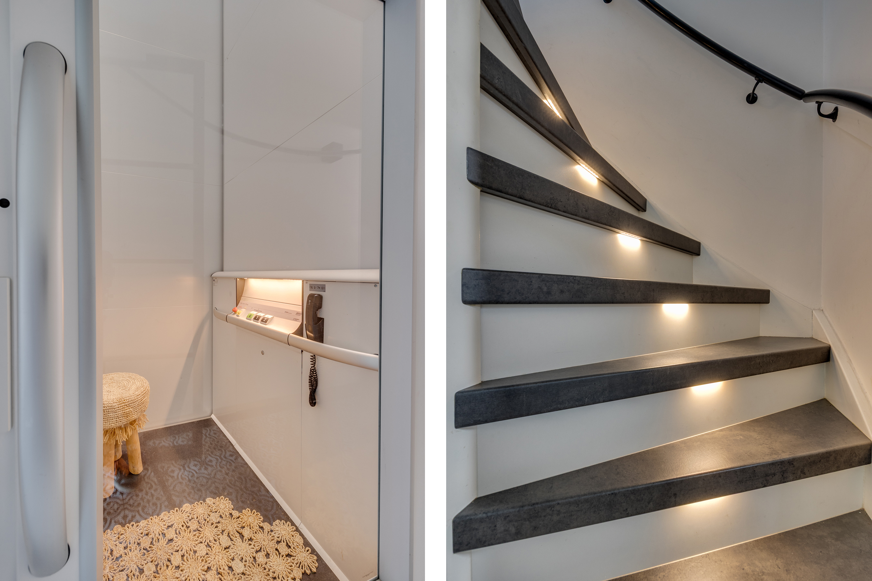 Indeling begane grond: Via de eigen voordeur aan de Kerkbrink betreed je de fraai afgewerkte entreehal, voorzien van een prachtige Marrokkaanse tegelvloer en elegante trap met upstairs trapverlichting. Hier kun je kiezen: neem de trap of gebruik je eigen liftinstallatie (geschikt voor 5 personen) die toegang biedt tot beide verdiepingen, ideaal voor comfort én toekomstbestendig wonen. Vanuit de hal bereik je een royale berging, perfect voor fietsen, opslag of seizoensspullen, met een extra uitgang via een recht van overpad naar de Hazeslinger. Ideaal bij thuiskomst met de fiets!