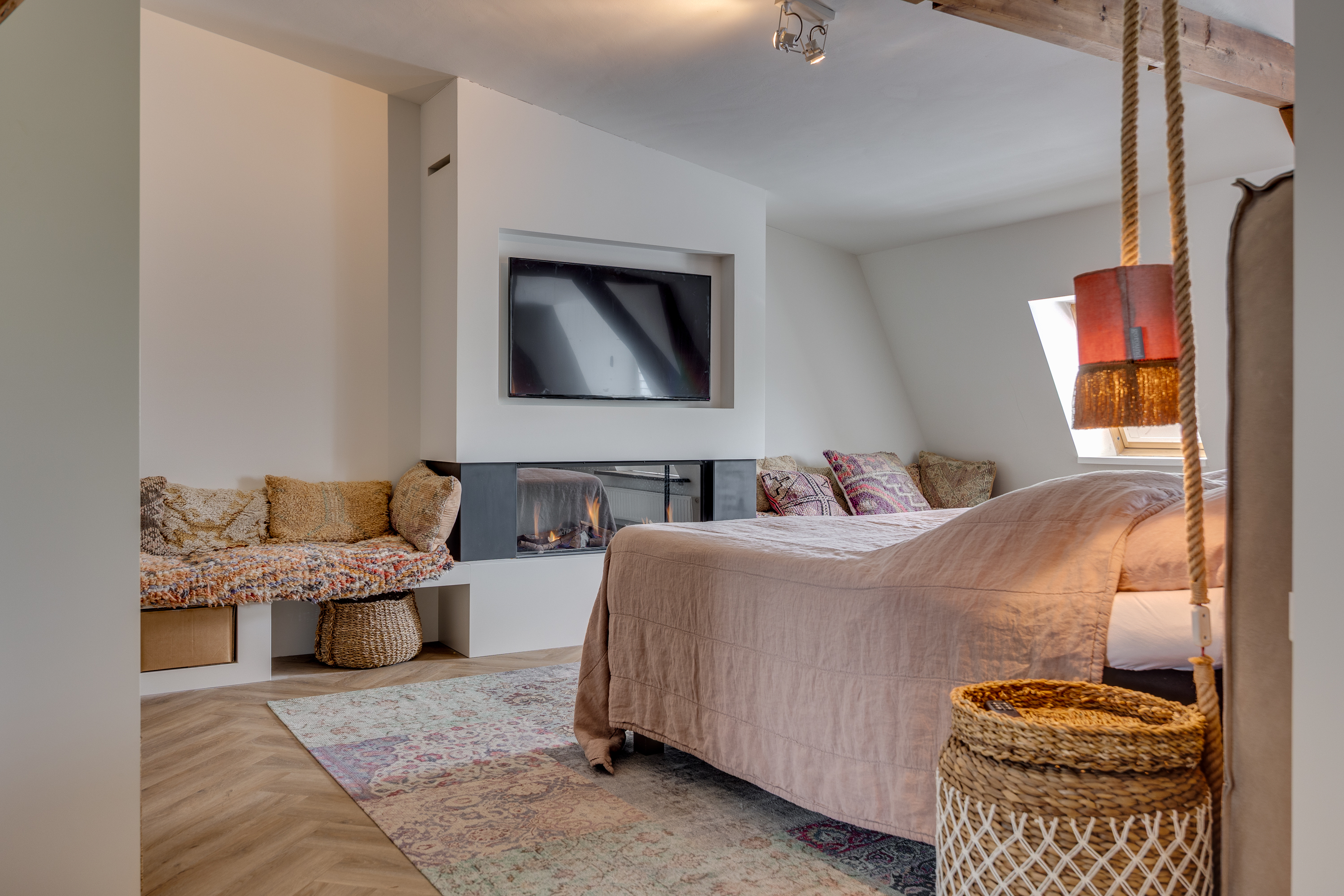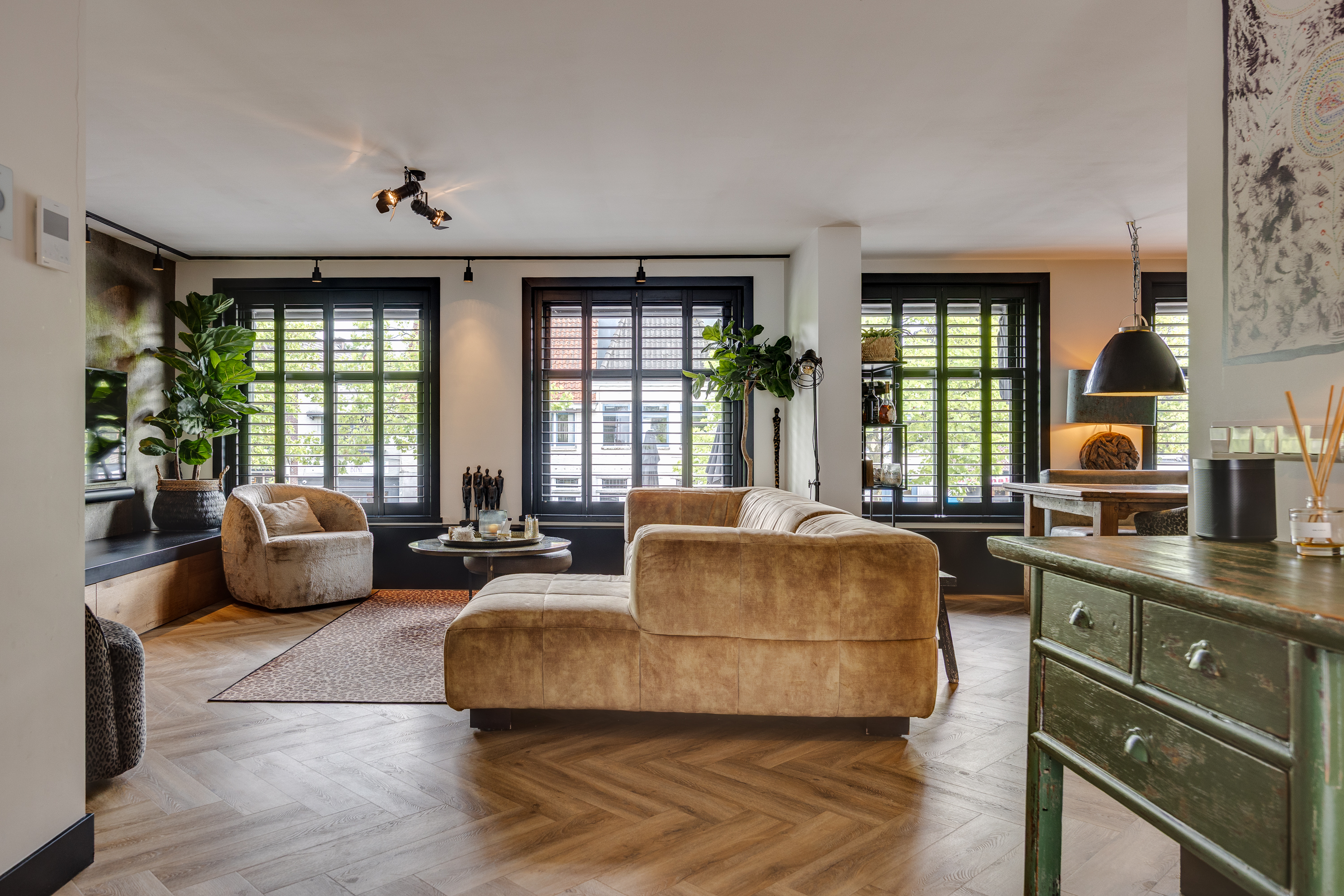 De ruimtelijke woonkamer aan de voorzijde is een ware blikvanger, met grote raampartijen die zorgen voor een overvloed aan natuurlijk licht en een prachtig uitzicht bieden op de levendige Kerkbrink. Wat direct opvalt, is de stijlvolle PVC-vloer die is doorgelegd over de gehele woonverdieping. Deze vloer combineert een warme, rustgevende uitstraling met praktische eigenschappen als duurzaamheid en onderhoudsgemak. Hij vormt de perfecte basis voor elk interieur. De moderne gashaard creëert een gezellige ambiance, ideaal voor sfeervolle avonden. Daarnaast zorgt de aanwezige airconditioning ervoor dat het binnenklimaat het hele jaar door aangenaam blijft. Alles aan deze woonlaag ademt comfort, stijl en luxe.