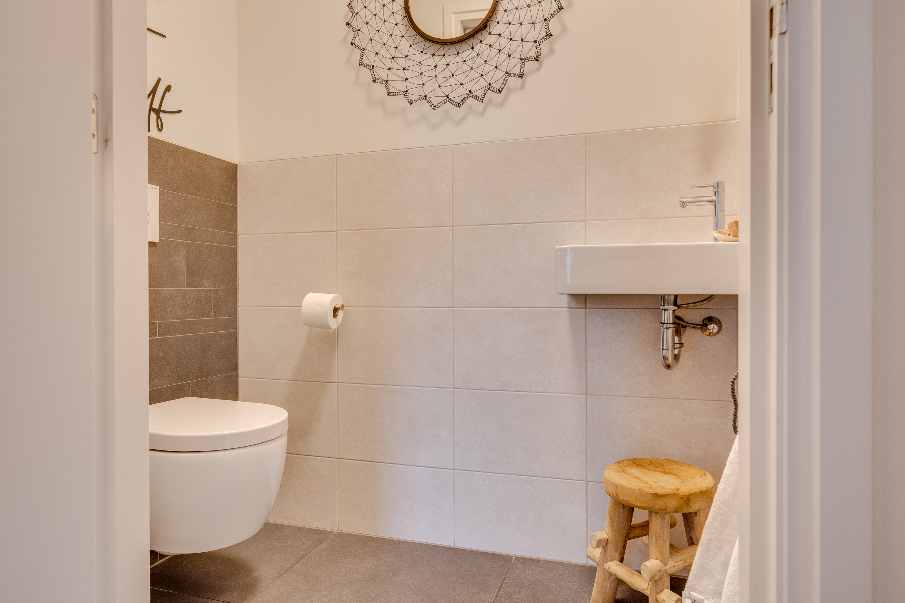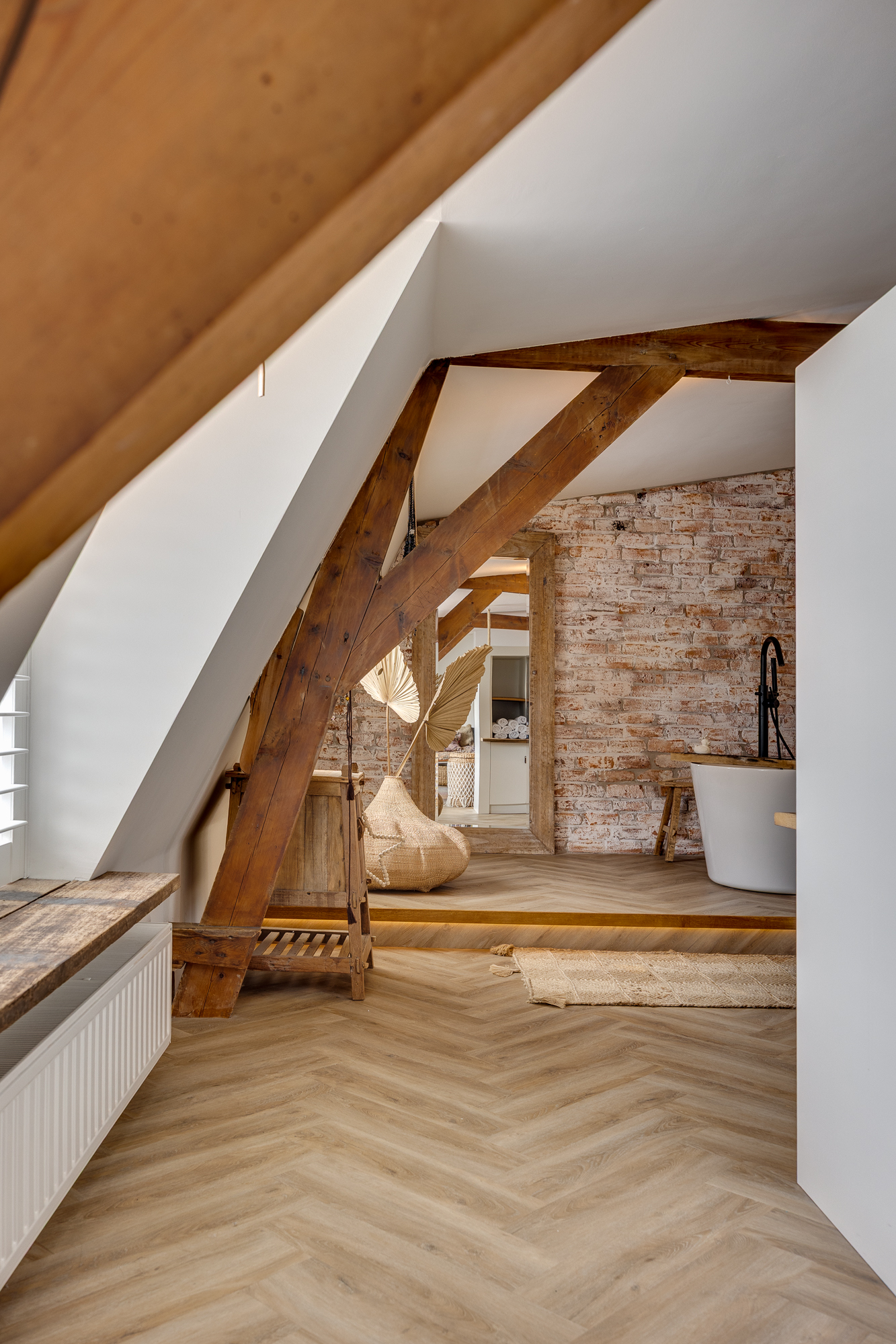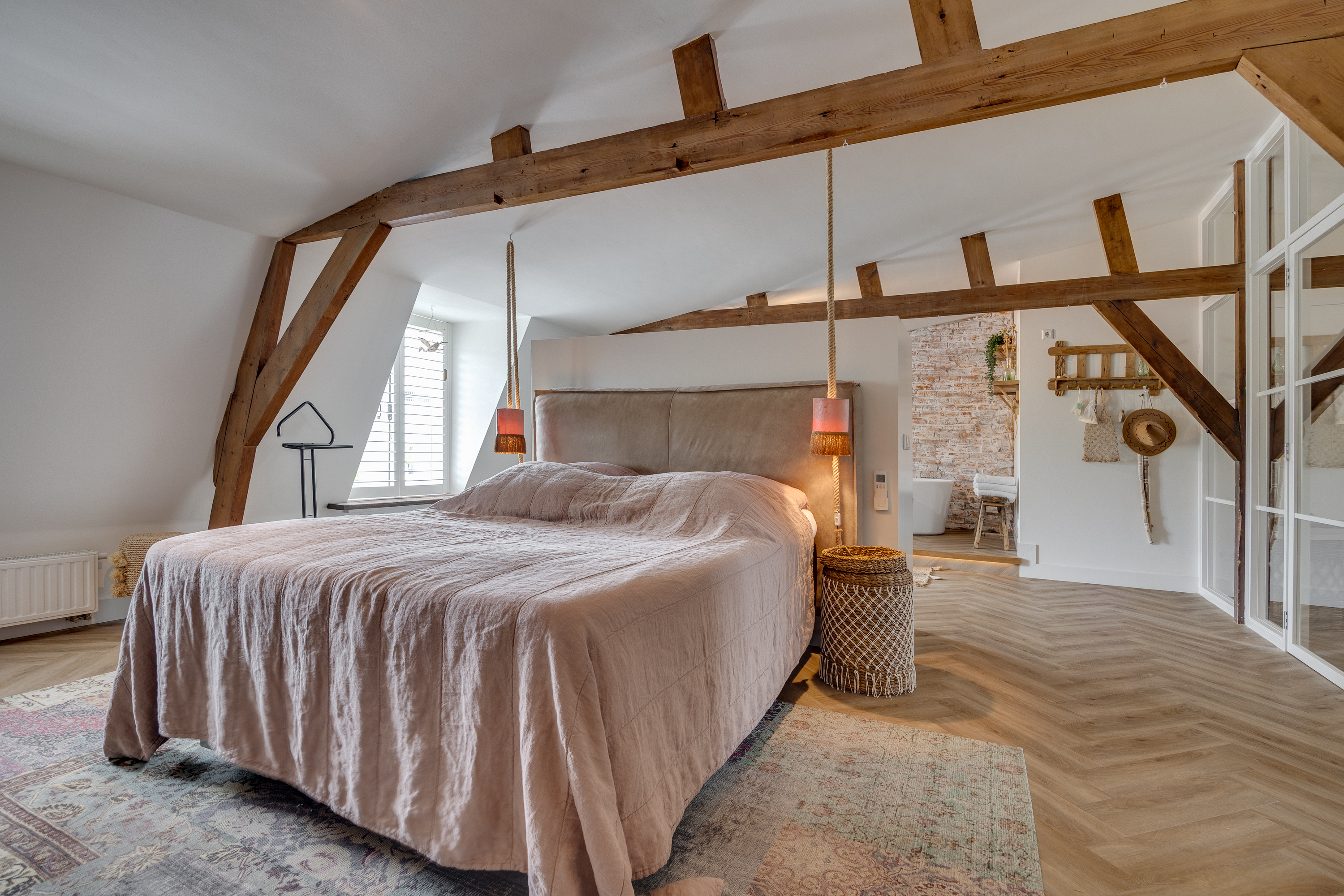 Daarnaast is er een tweede badkamer met inloopdouche, wastafelmeubel, toilet en ruimte voor wasmachine en droger. Een extra separaat toilet bevindt zich op de overloop. Authentieke houten balken zijn in het zicht gebleven en zorgen voor een sfeervol contrast met de moderne afwerking.